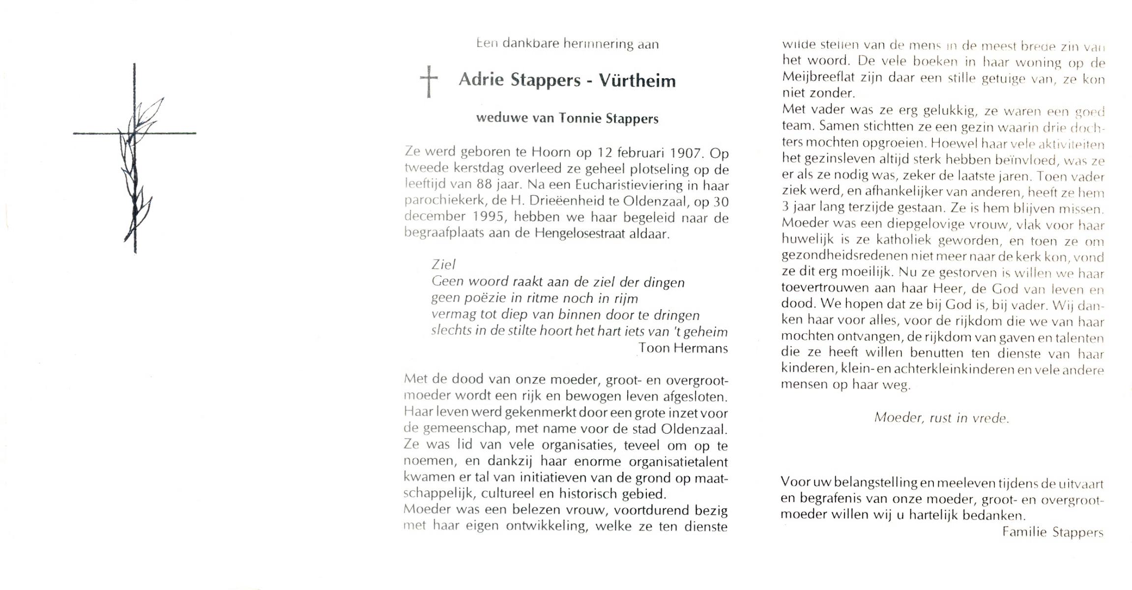 VÜRTHEIM, Adrie, geboren op 12-2-1907 te Hoorn, overleden te Oldenzaal op 88-jarige leeftijd, begraven op 30-12-1995 te Oldenzaal.