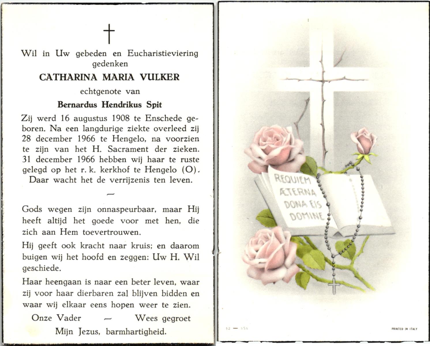 VULKER, , Catharina Maria, geboren op 16-8-1908 te Enschede, overleden op 28-12-1966 te Hengelo (O) op 58-jarige leeftijd, begraven op 31-12-1966 te Hengelo.