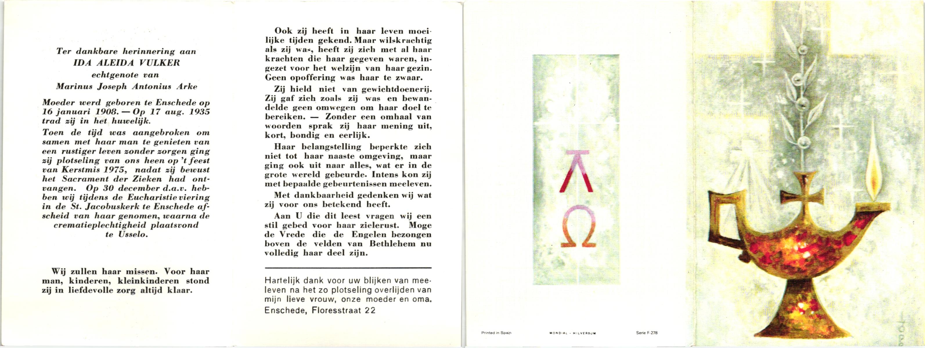 VULKER, , Ida Maria, geboren op 16-1-1908 te Enschede, overleden op 26-12-1975 op 67-jarige leeftijd, gecremeerd op 30-12-1975 te Usselo.