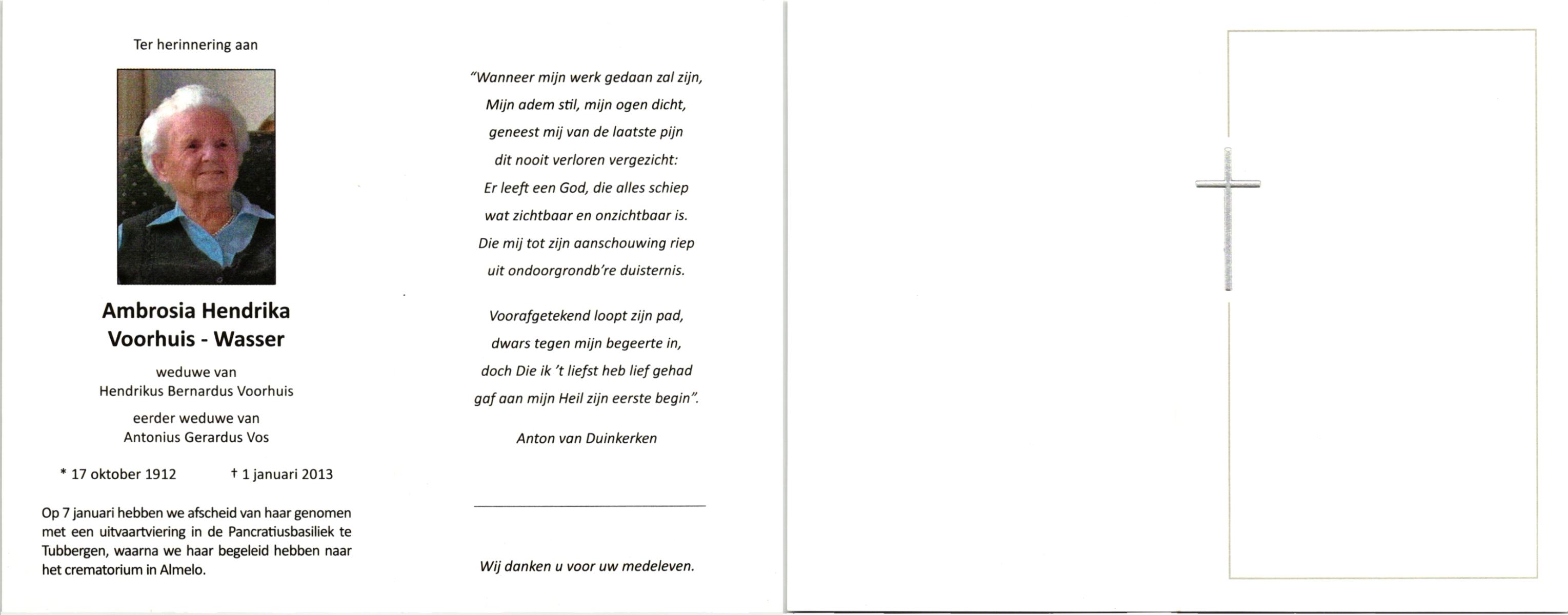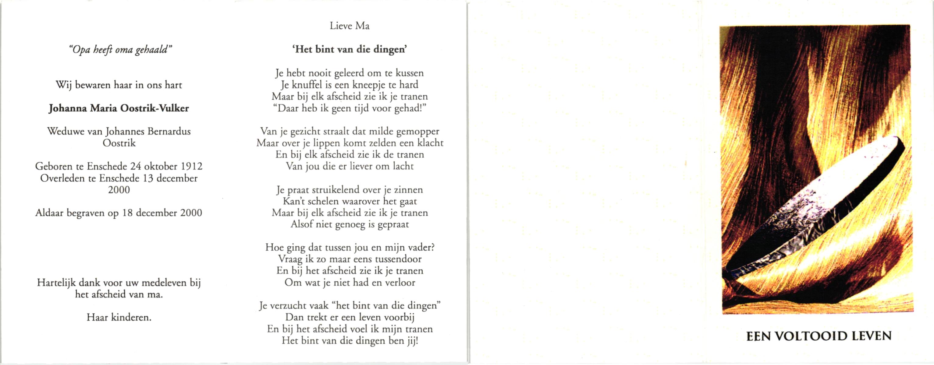 VULKER, , Johanna Maria, geboren op 24-10-1912 te Enschede, overleden op 13-12-2000 te Enschede op 88-jarige leeftijd, begraven op 18-12-2000 te Enschede.
