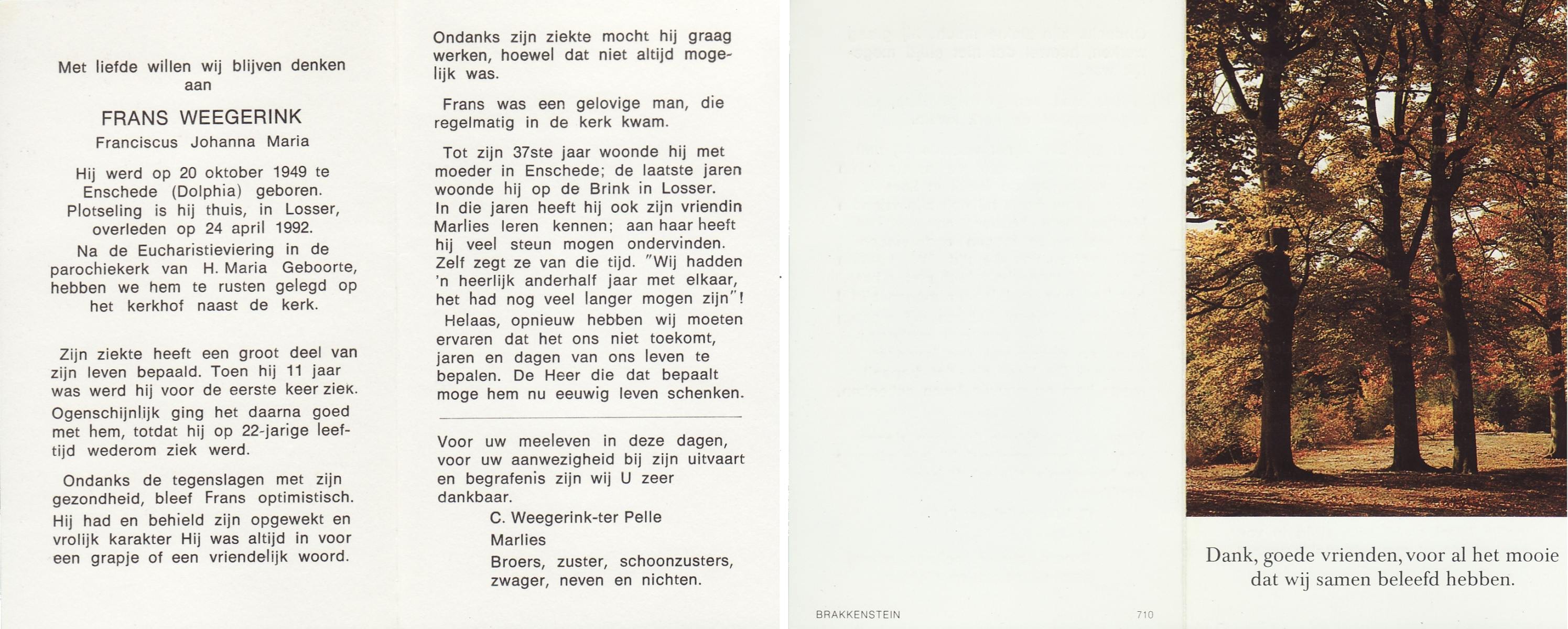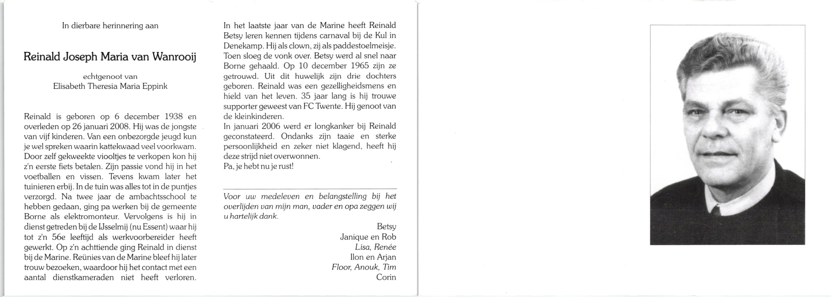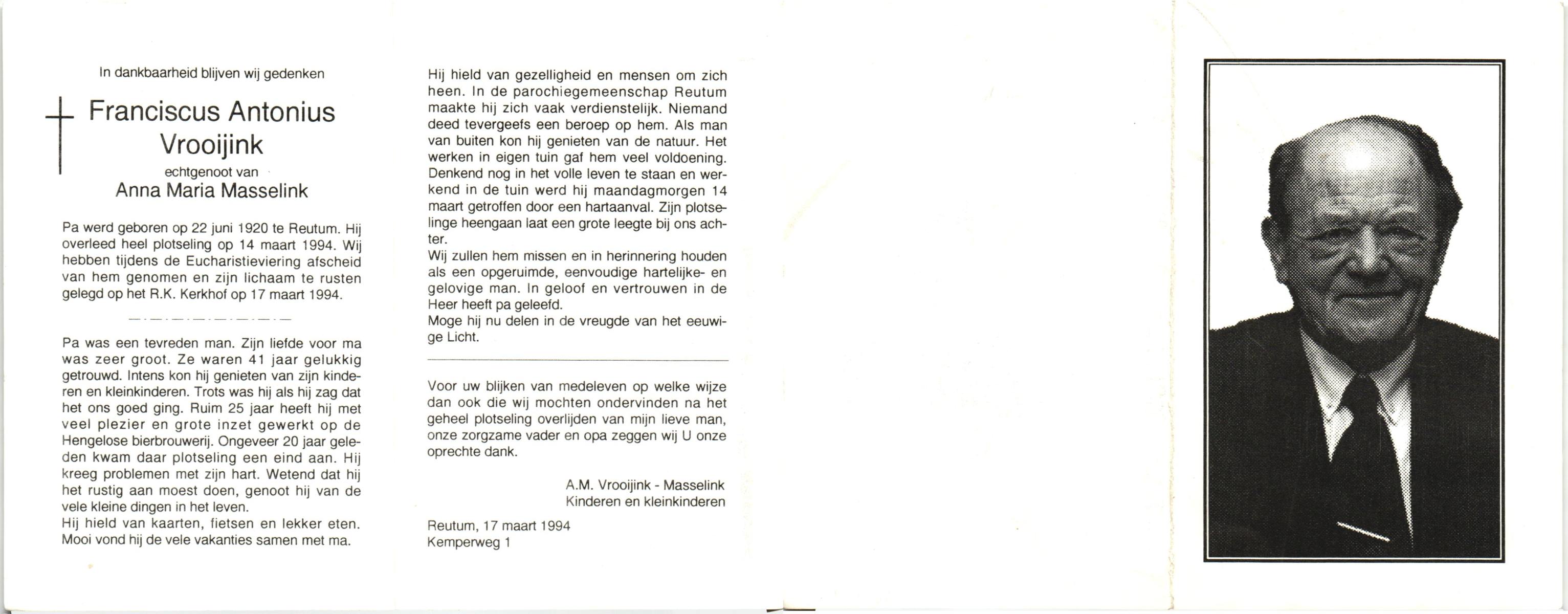 VROOIJINK, Franciscus Antonius, geboren op 22-6-1920 te Reutum, overleden op 14-3-1994 op 73-jarige leeftijd, begraven op 17-3-1994 te Reutum.