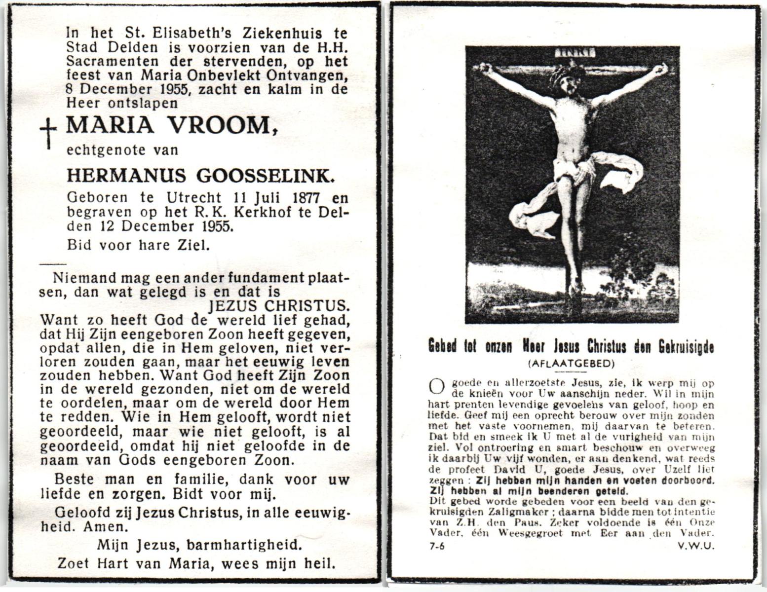 VROOM, Maria, geboren op 11-07-1877 te Utrecht, overleden op 8-12-1955 te Delden, Stad, ziekenhuis op 78-jarige leeftijd, begraven op 12-12-1955 te Delden.