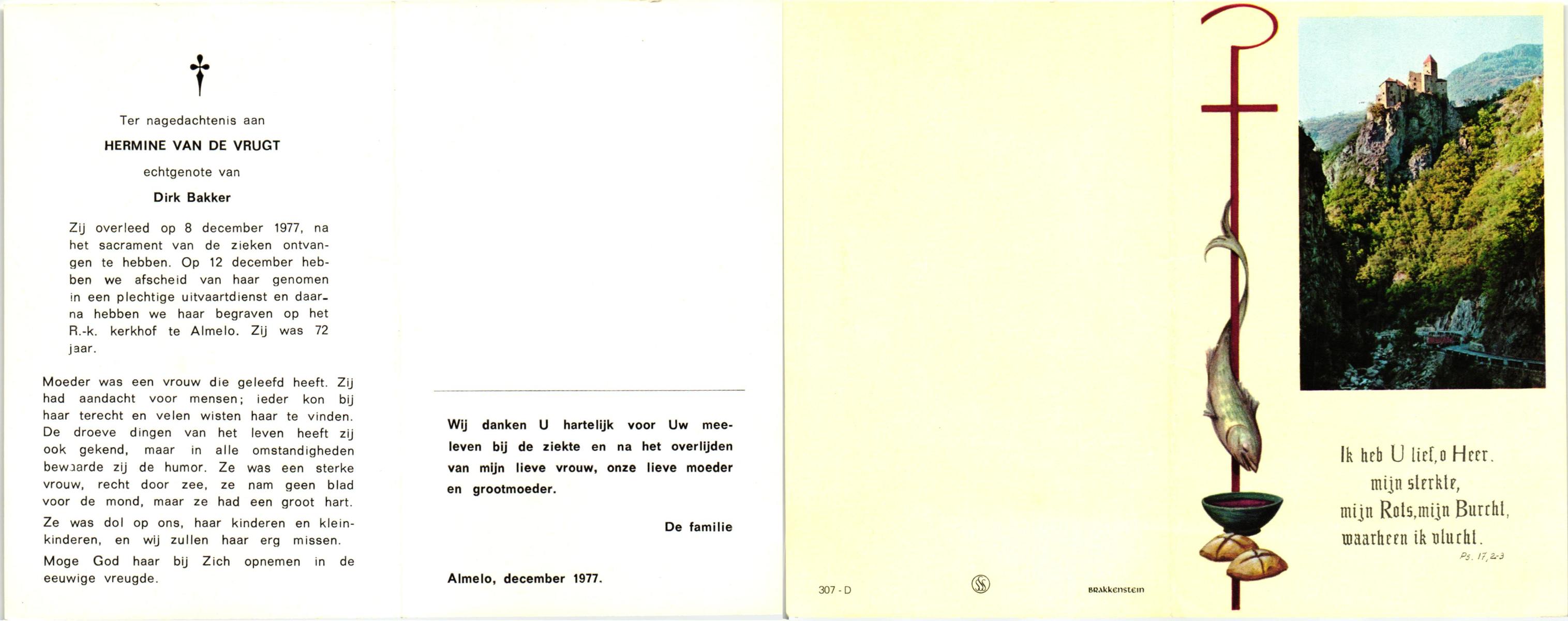 VRUGT, van de, Hermine, overleden op 8-12-1977 op 72-jarige leeftijd, begraven op 12-12-1977 te Almelo.