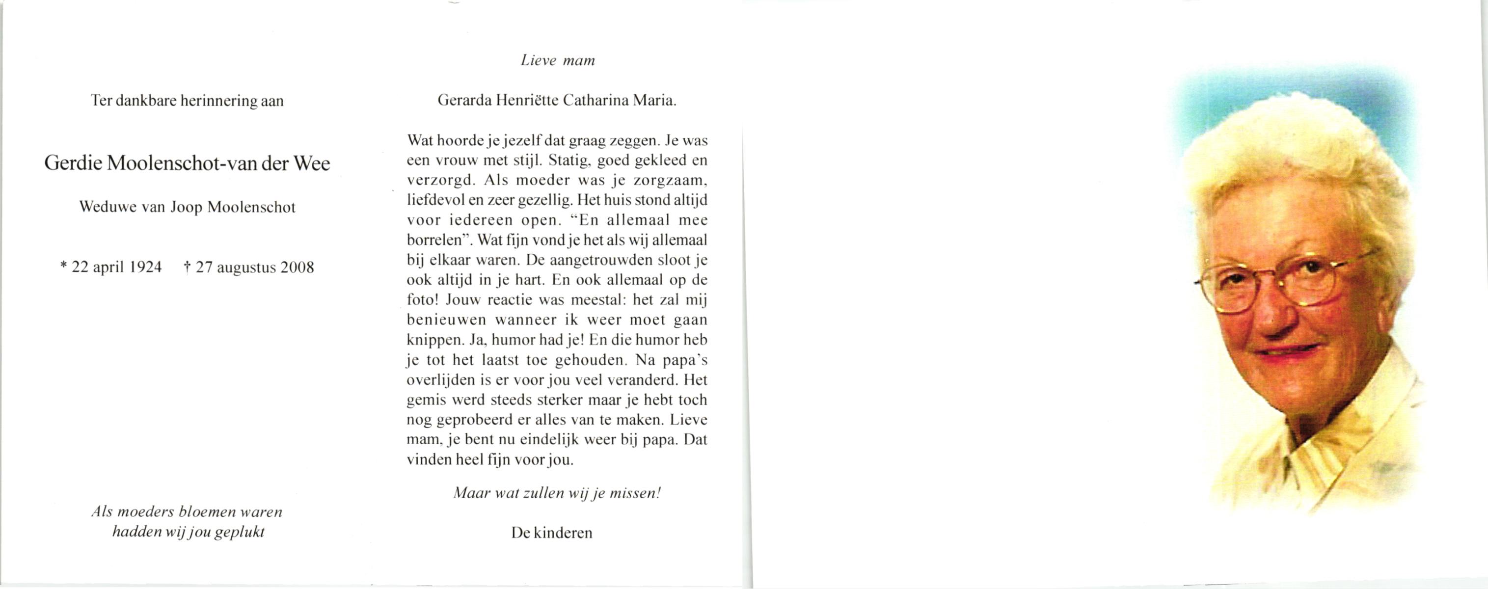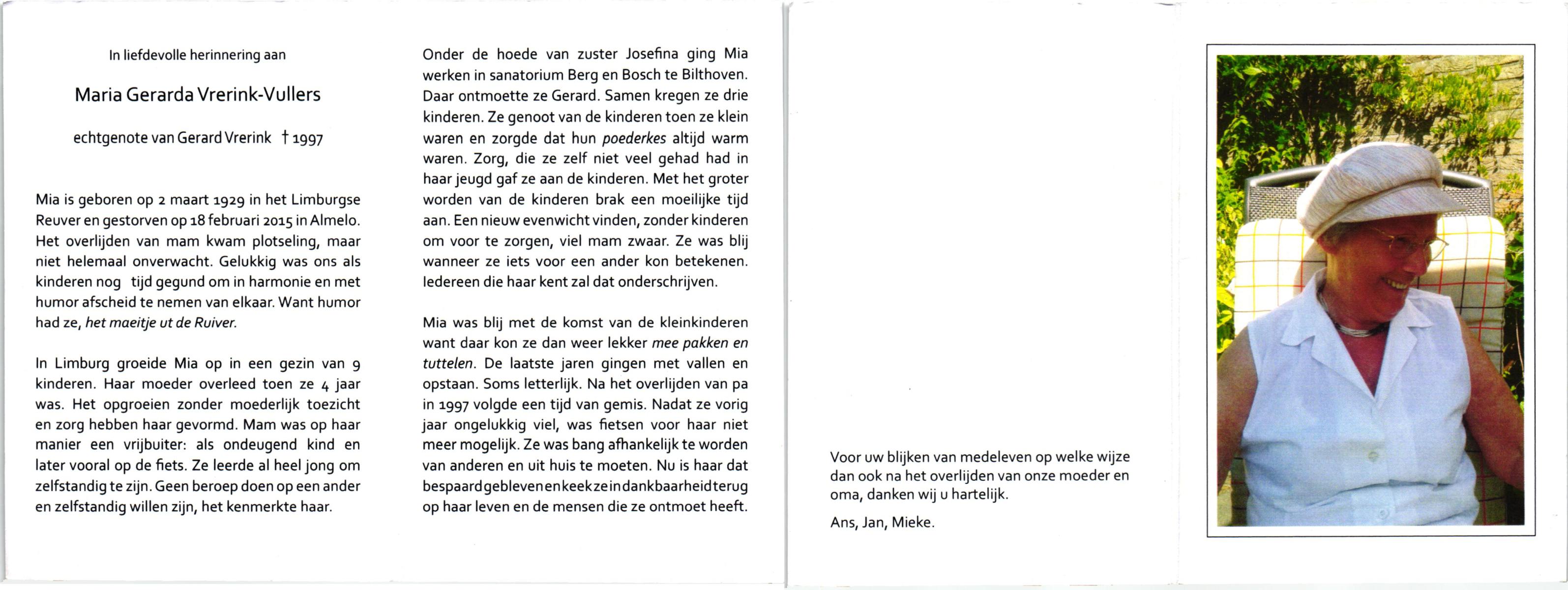 VULLERS, Maria Gerarda, geboren op 2-3-1929 te Reuver, L., overleden op 18-2-2015 te Almelo op 85-jarige leeftijd.