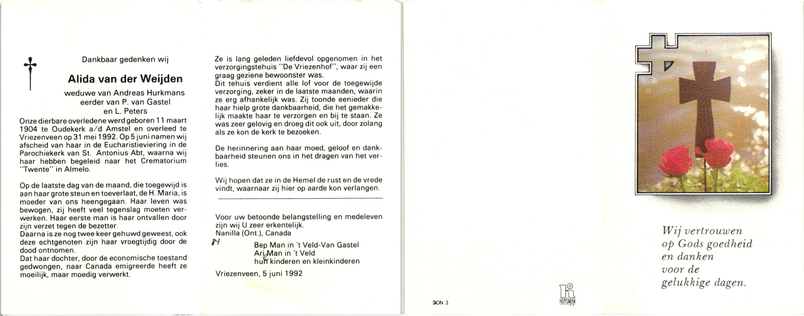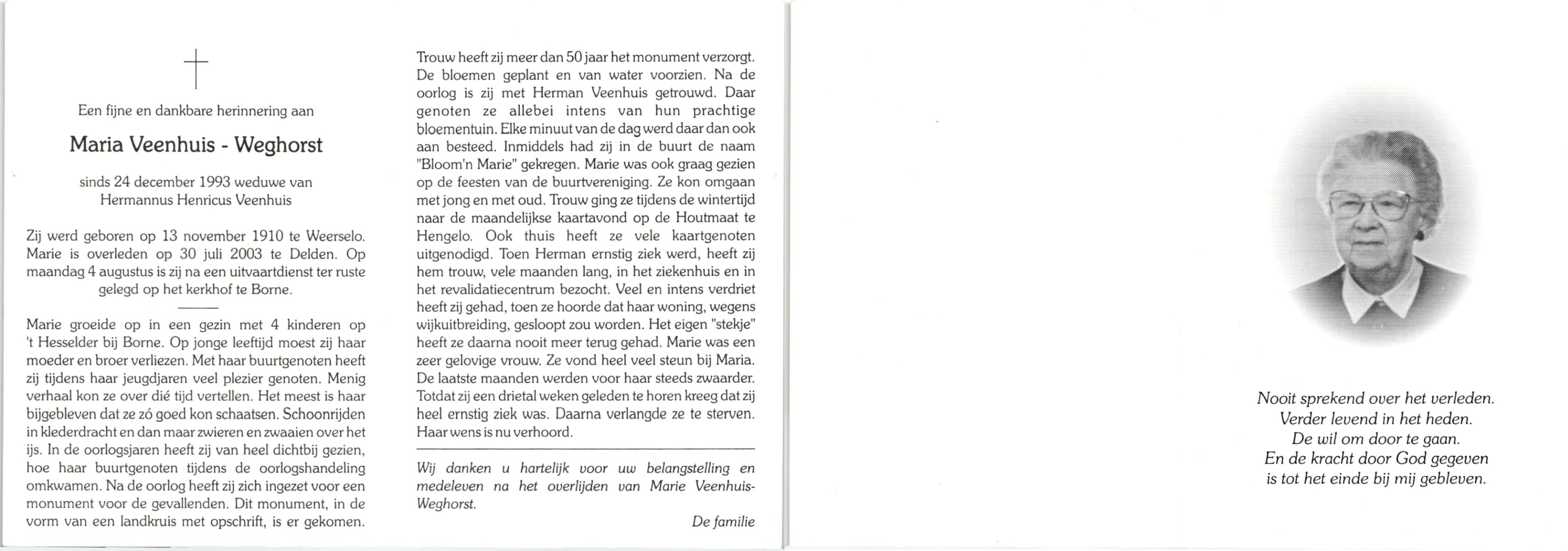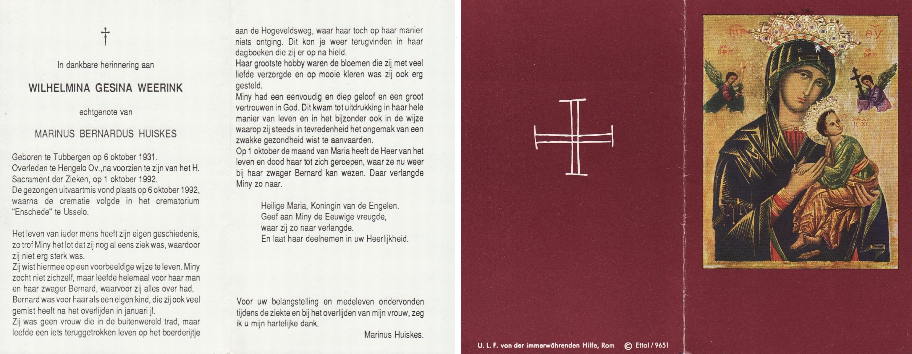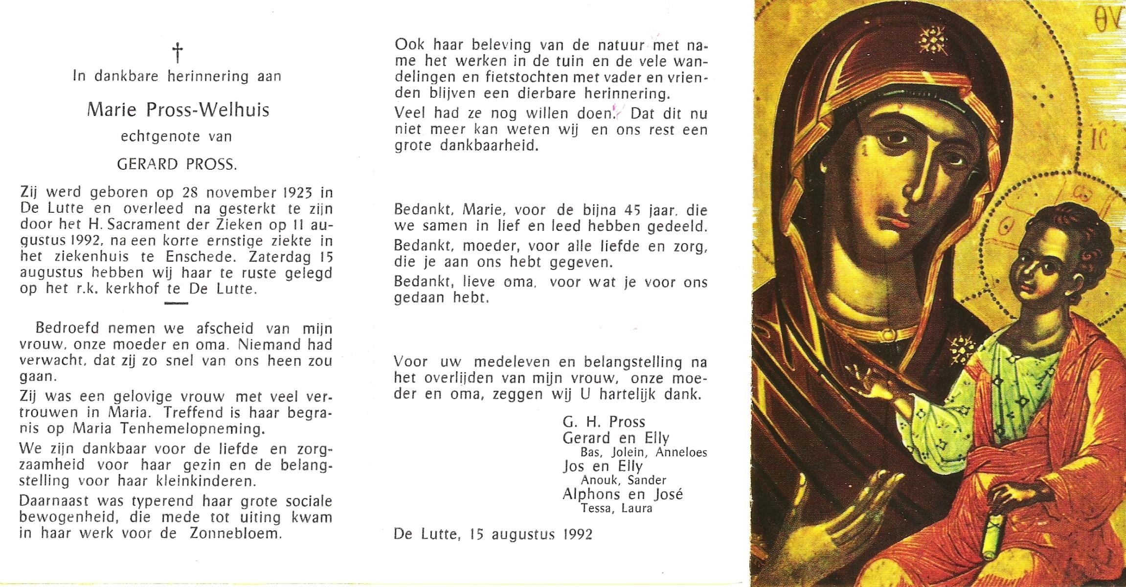 WELHUIS, Marie, geboren op 28-11-1923 te De Lutte, overleden op 11-8-1992 te Enschede op 68-jarige leeftijd, begraven op 15-8-1992 te De Lutte.