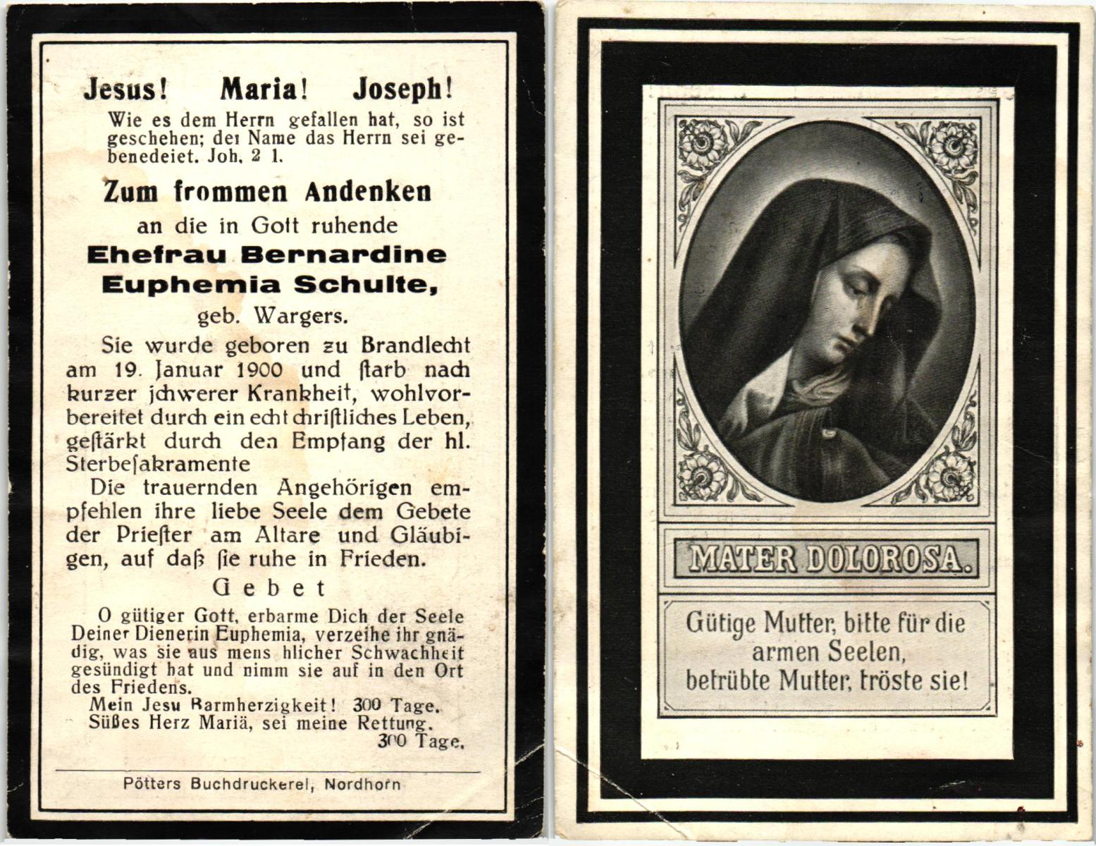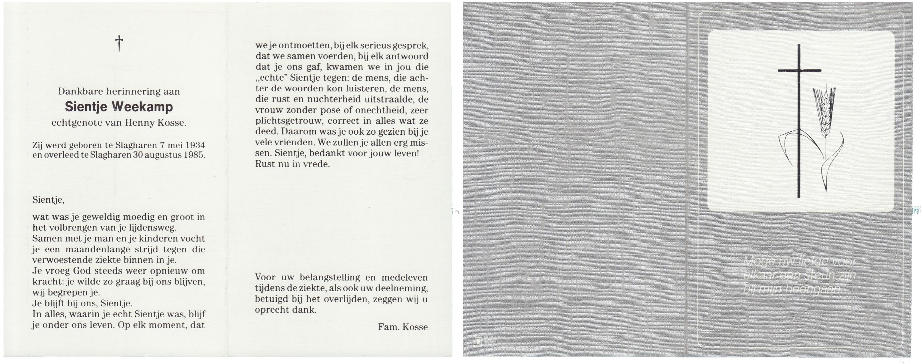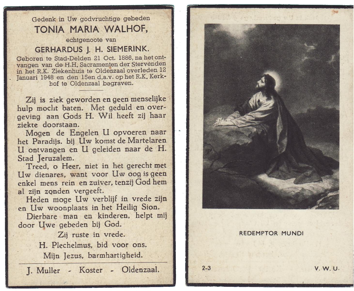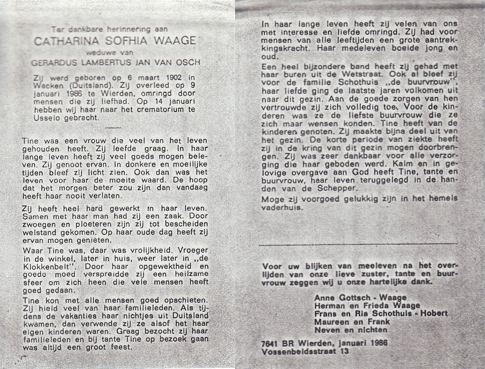 WAAGE, Catharina Sofhia, geboren op 6-3-1902 te Wacken(D), overleden op 9-1-1986 te Wierden op 83-jarige leeftijd, gecremeerd op 14-1-1986 te Usselo.
