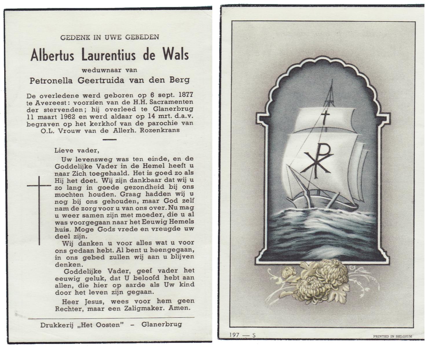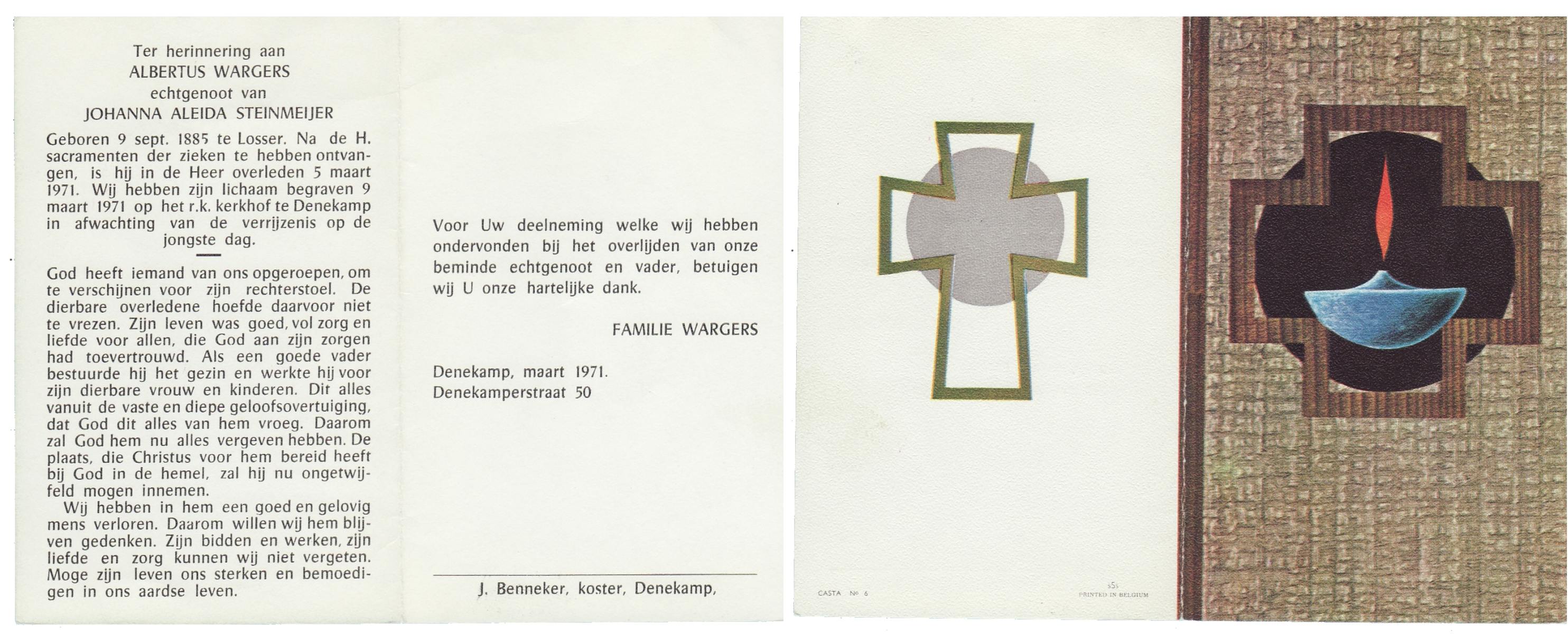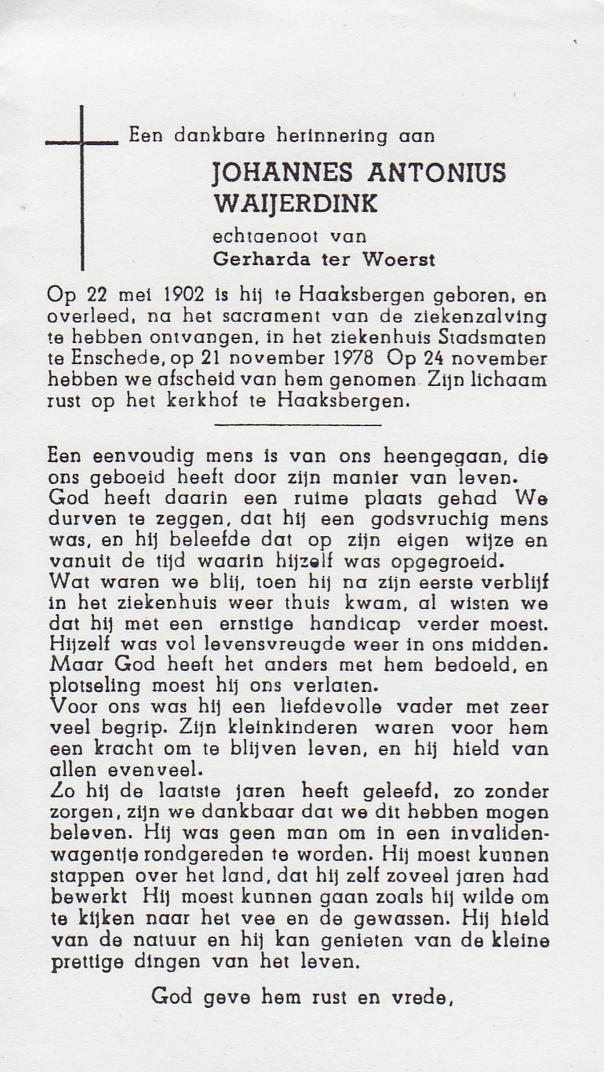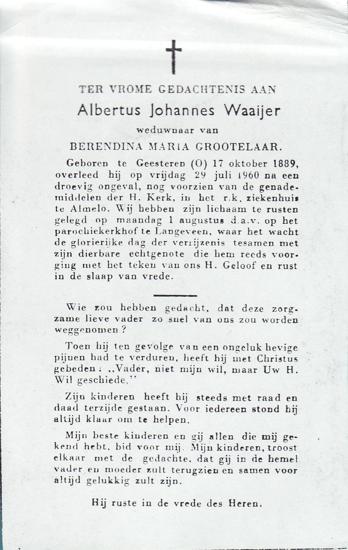 WAAIJER, Albertus Johannes, geboren op 17-10-1889 te Geesteren (Ov.), overleden op 29-7-1960 te Almelo op 70-jarige leeftijd, begraven op 1-8-1960 te Langeveen.