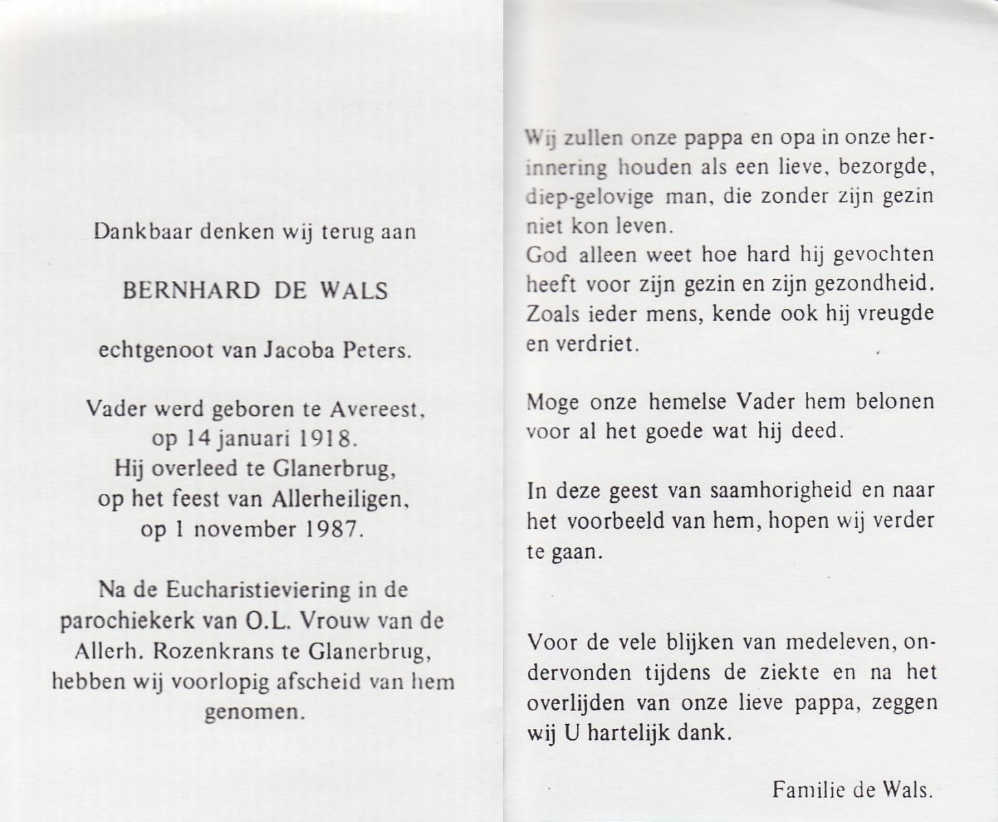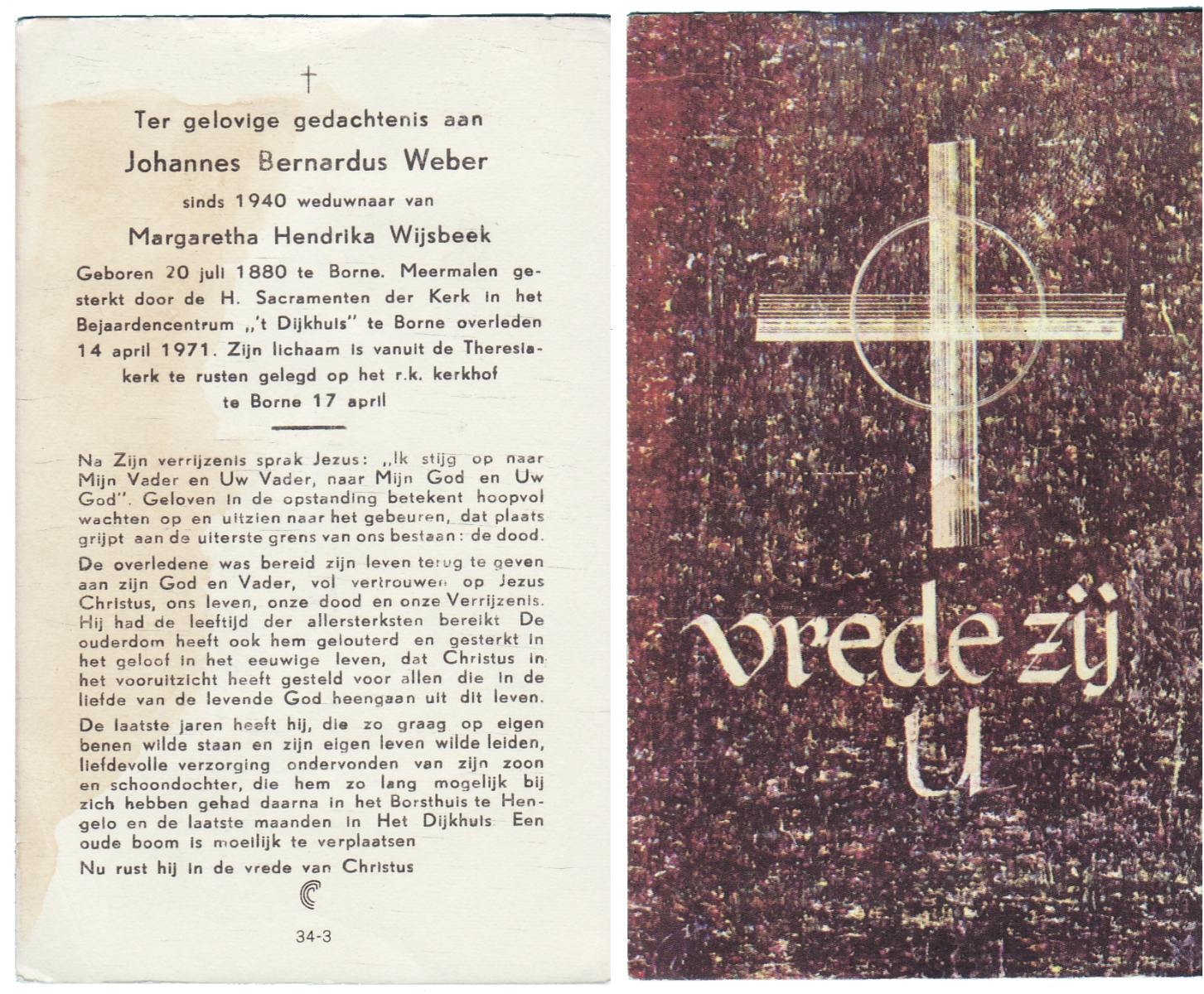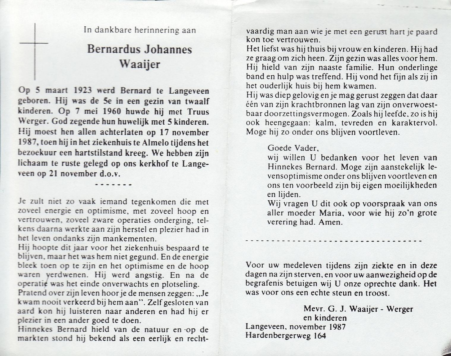 WAAIJER, Bernardus Johannes, geboren op 5-3-1923 te Langeveen, overleden op 17-11-1987 te Almelo op 64-jarige leeftijd, begraven op 21-11-1987 te Langeveen R.K.kerhof.