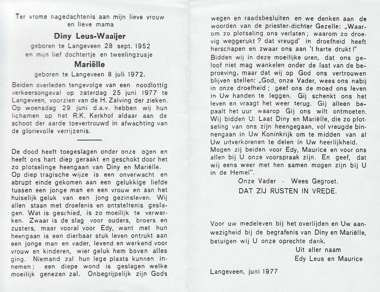 WAAIJER, Diny, geboren op 28-9-1952 te Langeveen, overleden op 25-6-1977 te Langeveen op 24-jarige leeftijd, begraven op 29-6-1977 te Langeveen.
