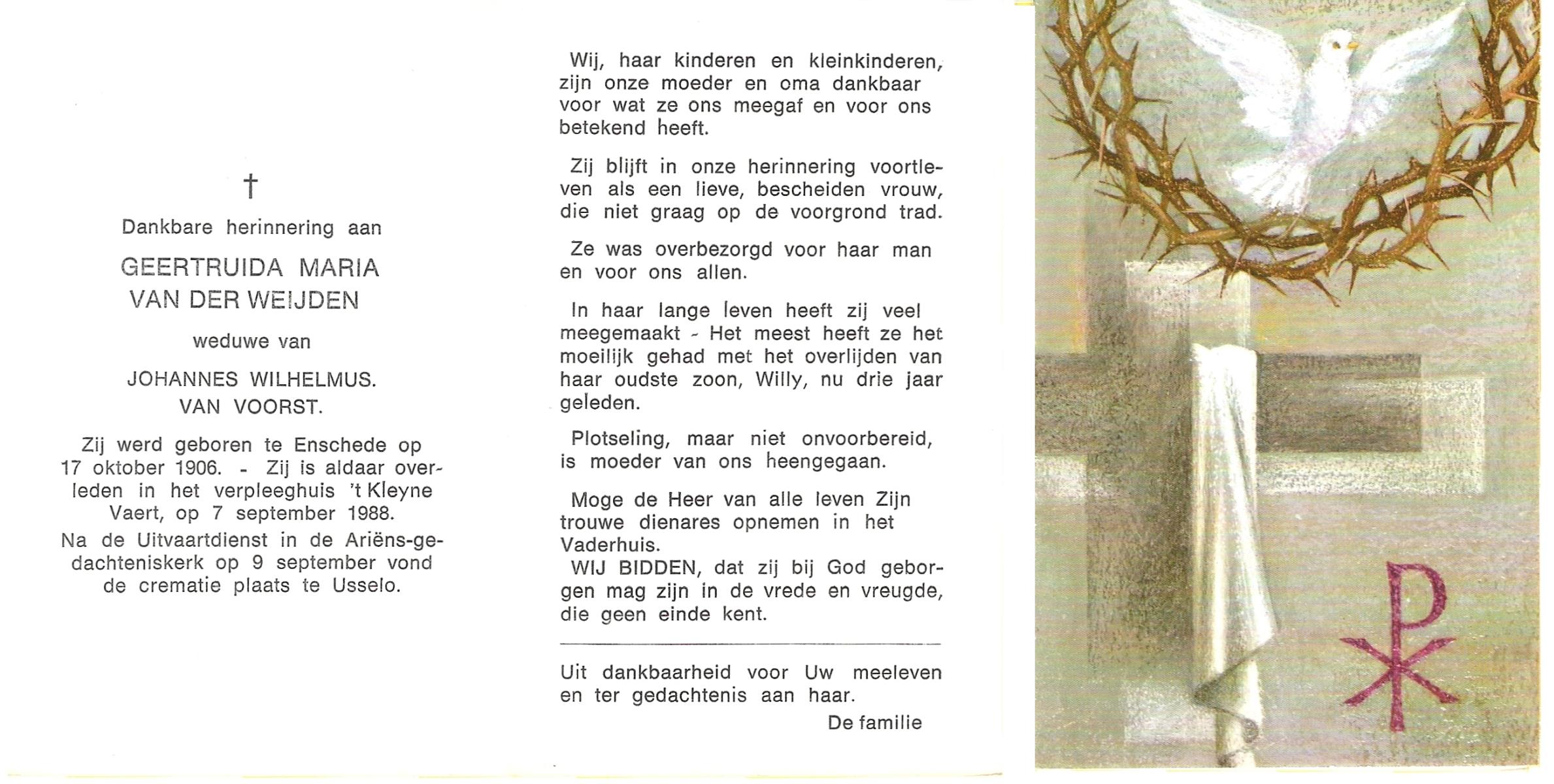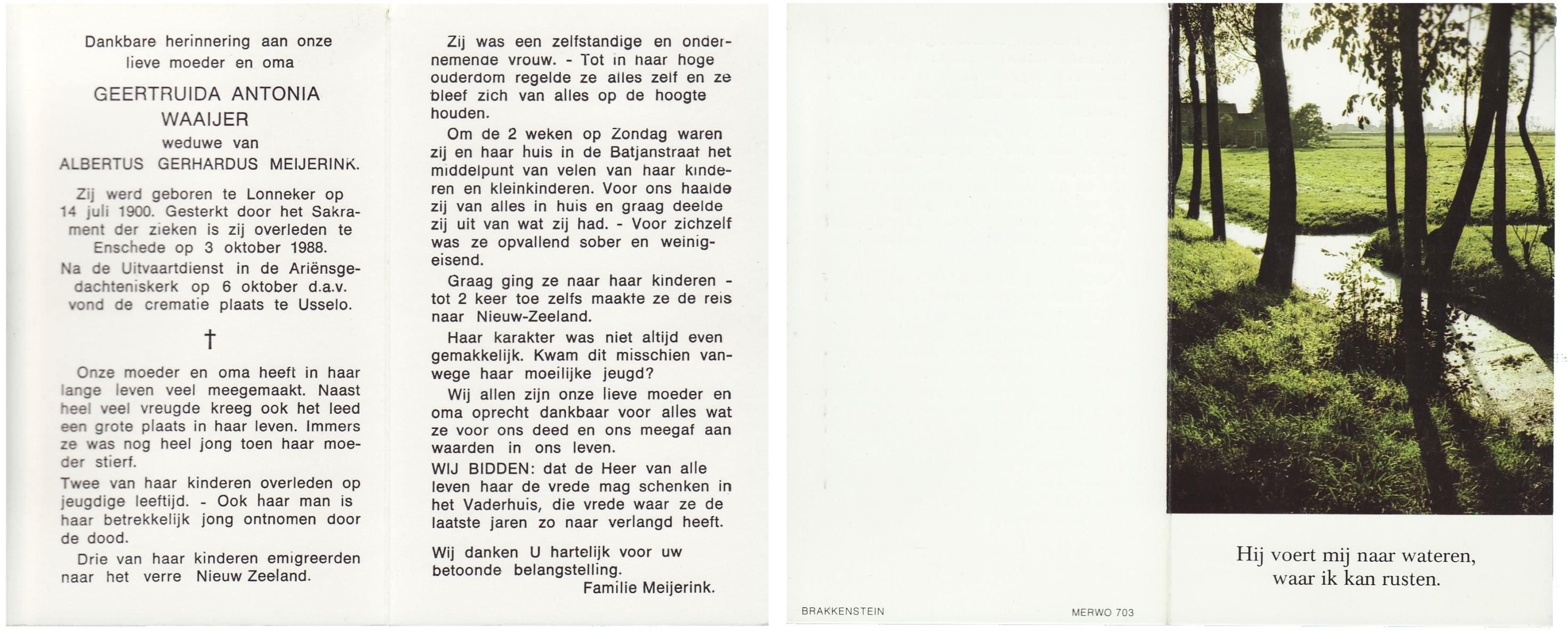 WAAIJER, Geertruida Antonia, geboren op 14-7-1900 te Lonneker, overleden op 3-10-1988 te Enschede op 88-jarige leeftijd, gecremeerd op 6-10-1988 te Usselo.