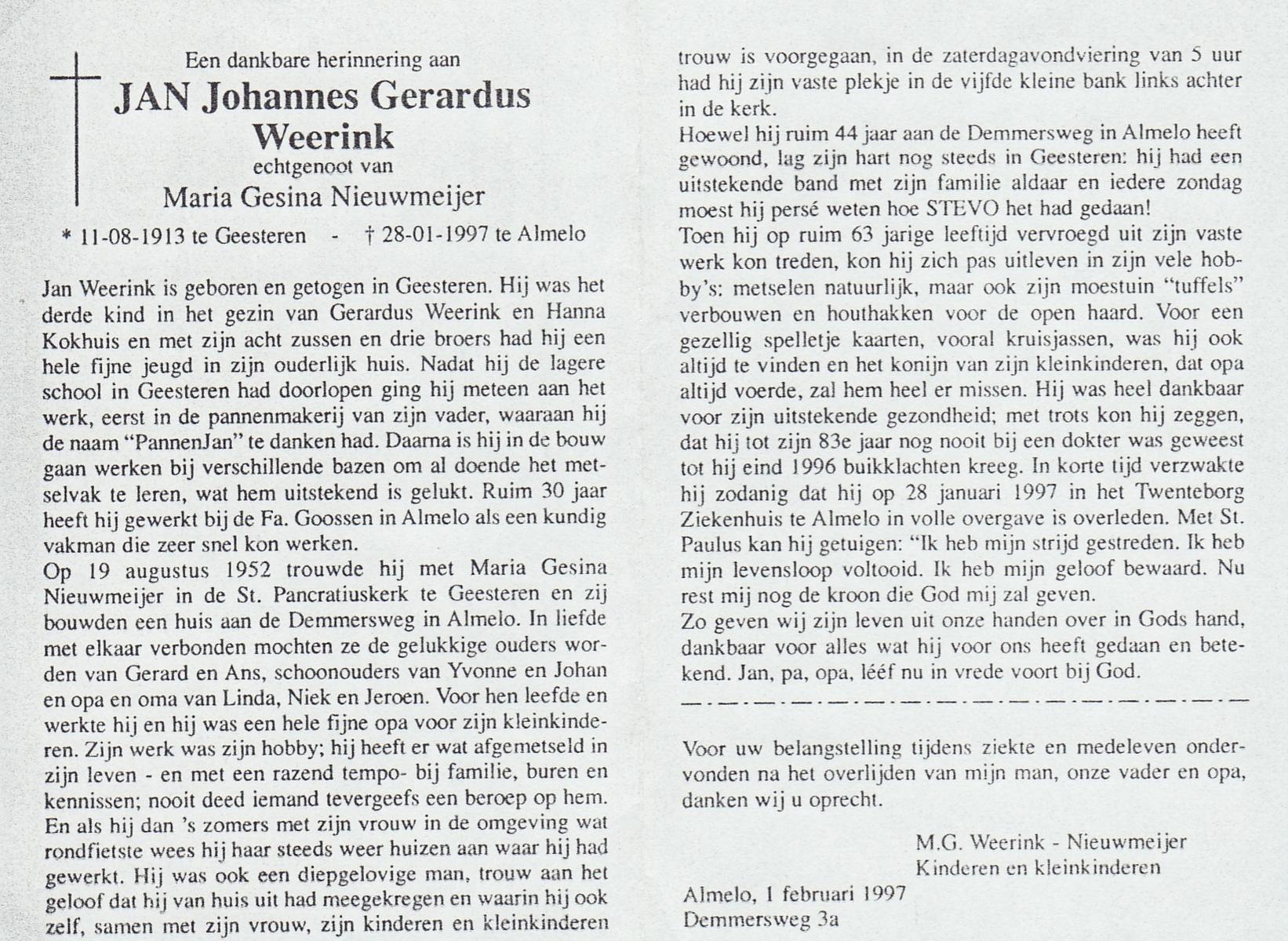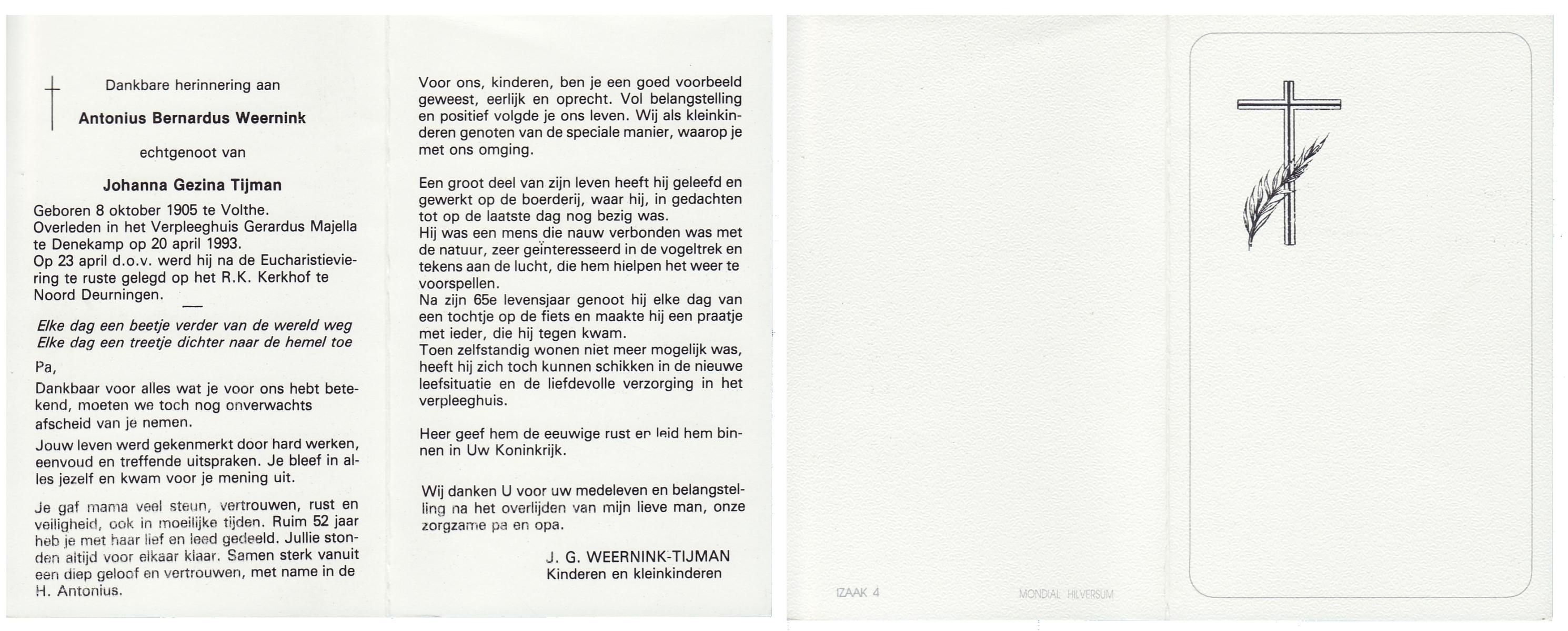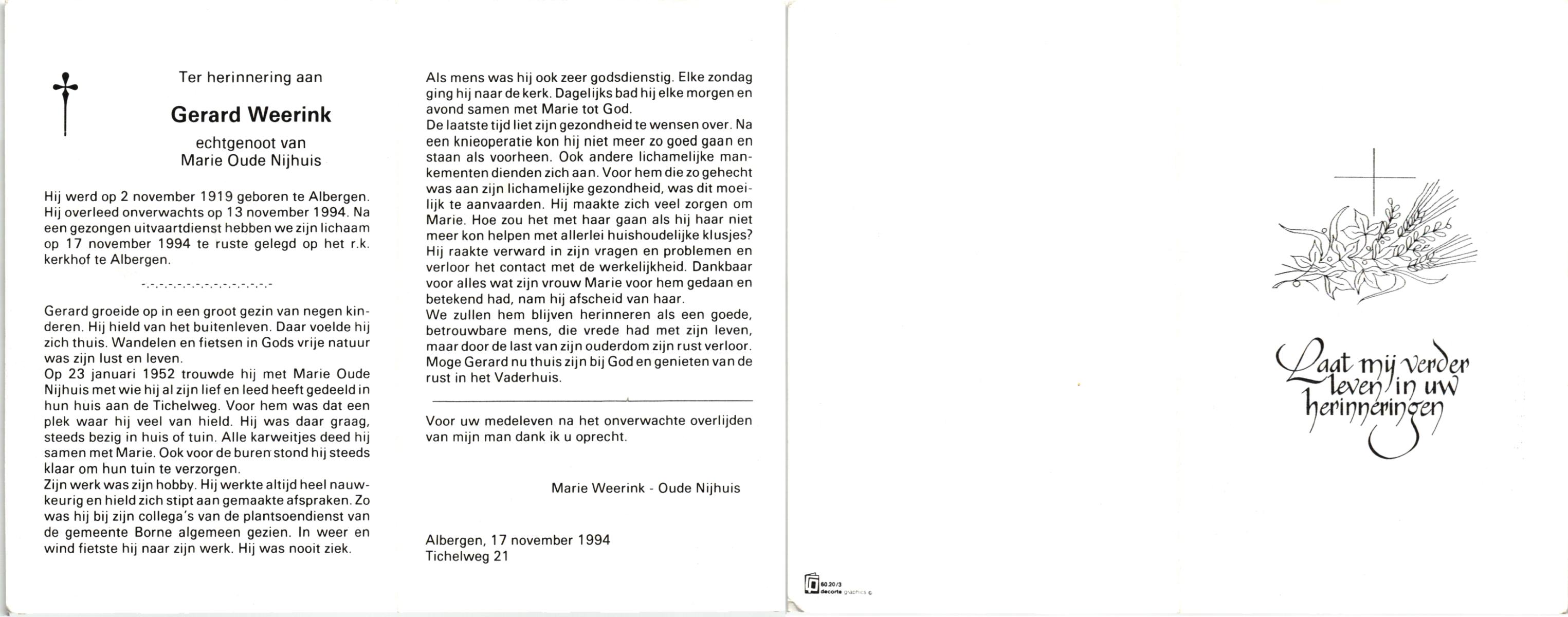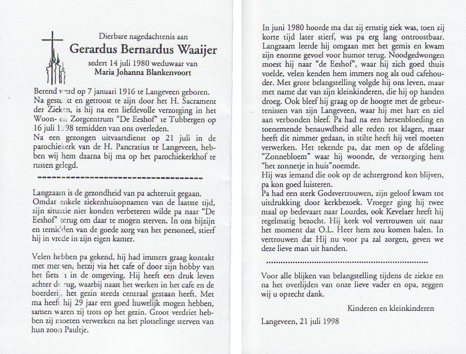 WAAIJER, Gerhardus Bernardus, geboren op 7-1-1916 te Langeveen, overleden op 16-7-1998 te Tubbergen op 82-jarige leeftijd, begraven op 21-7-1998 te Langeveen.