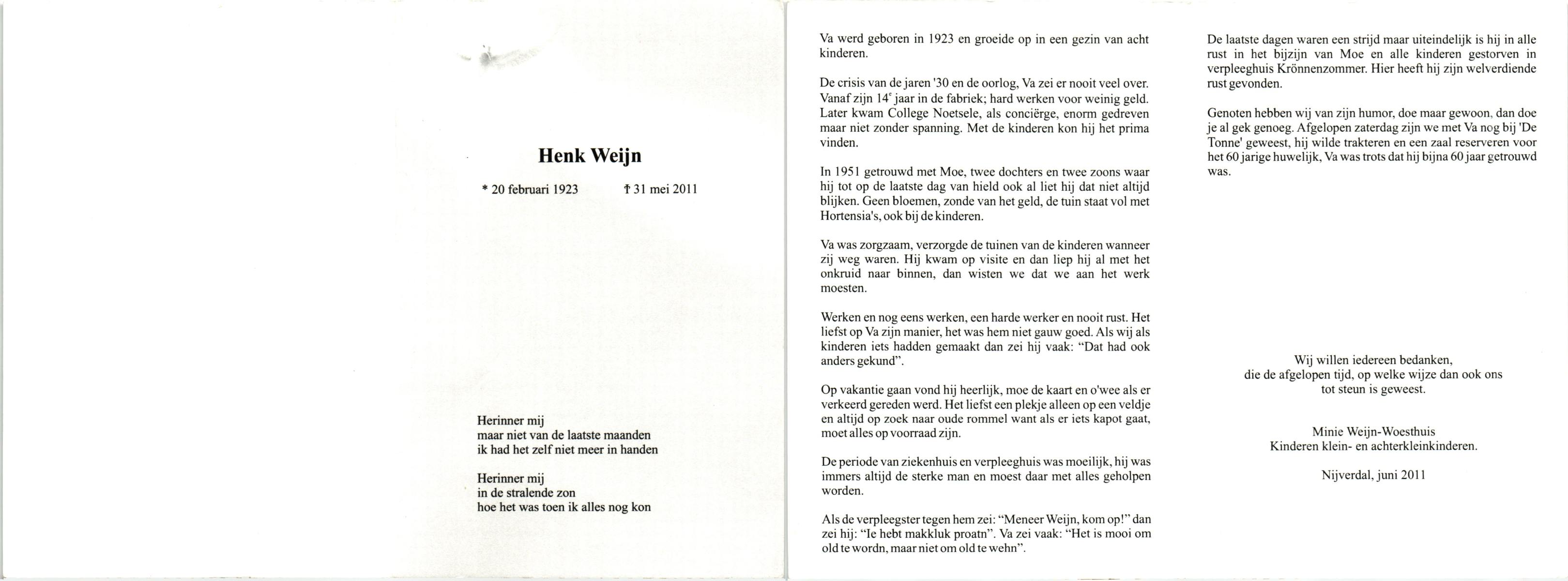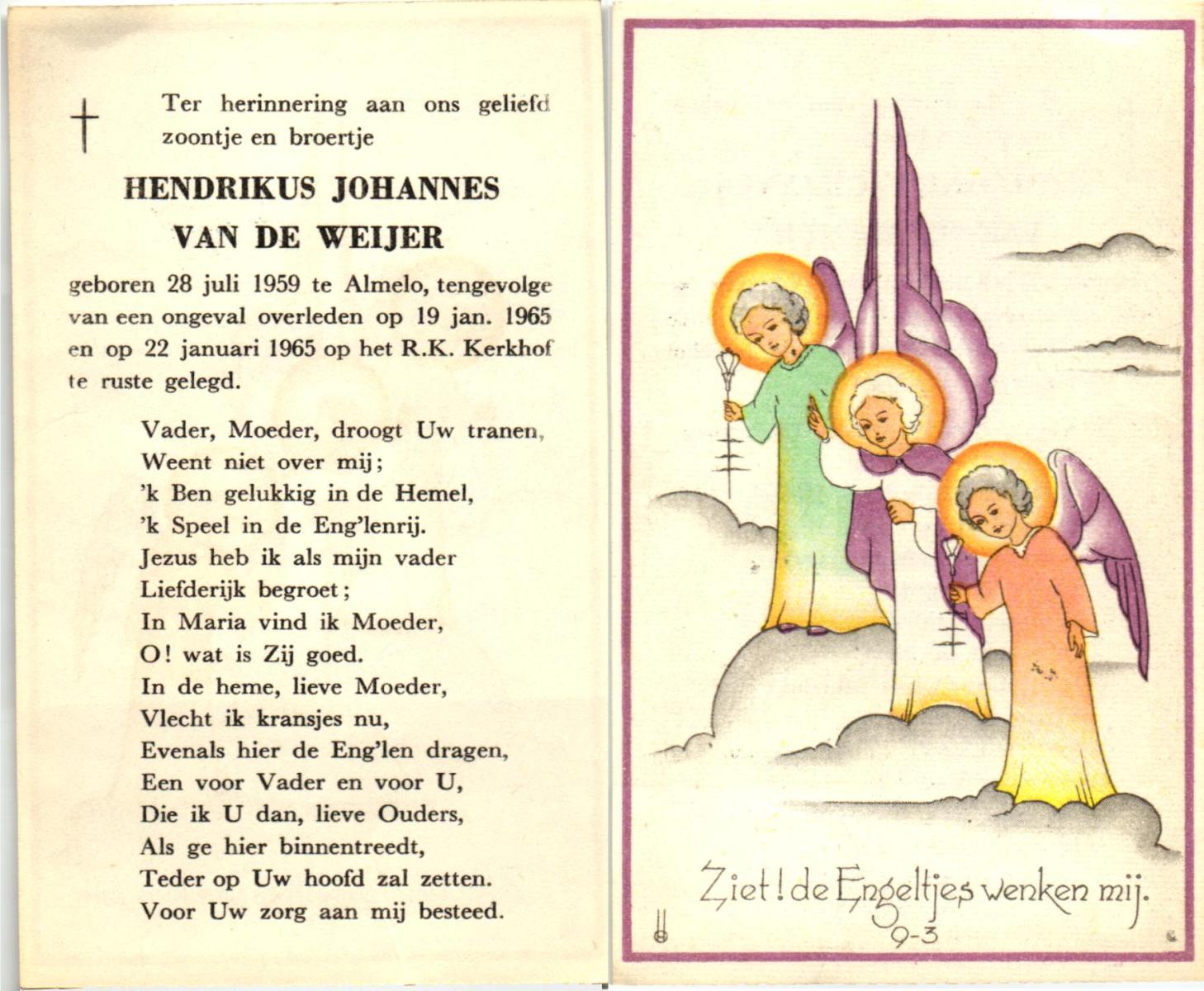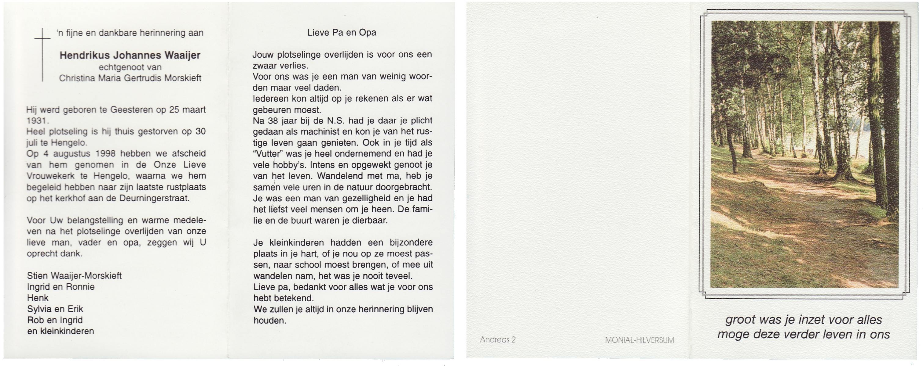 WAAIJER, Hendrikus Johannes, geboren op 25-3-1931 te Geesteren (Ov.), overleden op 30-7-1998 te Hengelo (Ov.) op 67-jarige leeftijd, begraven op 4-8-1998.