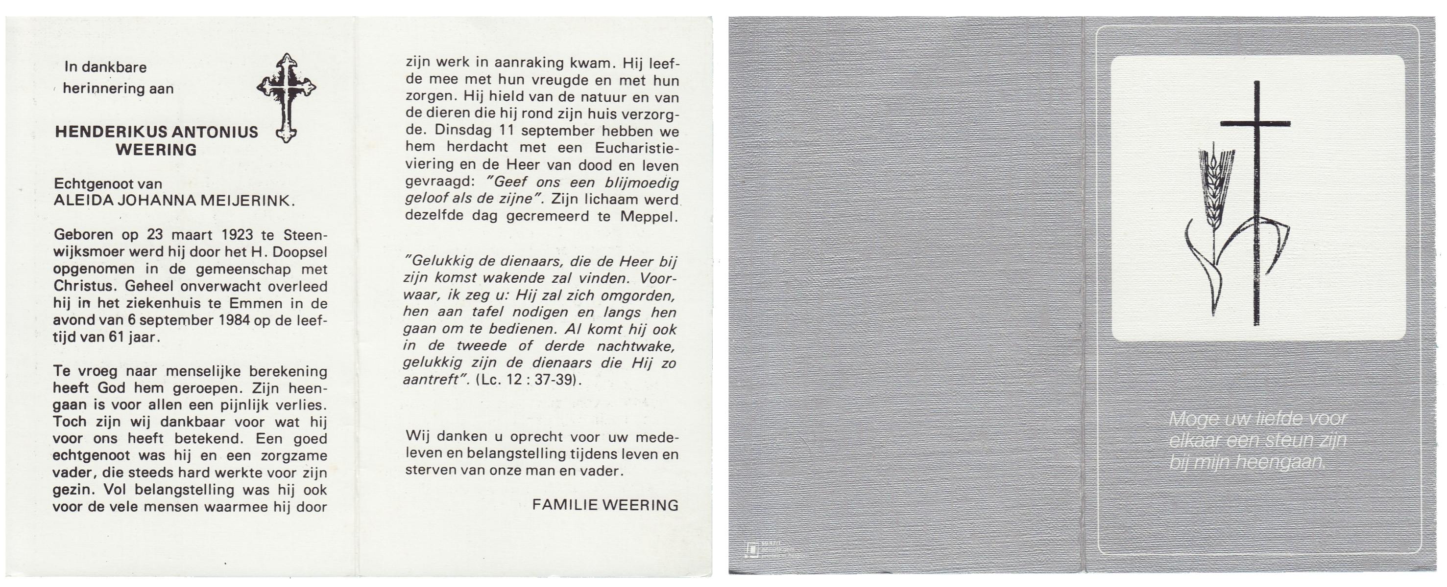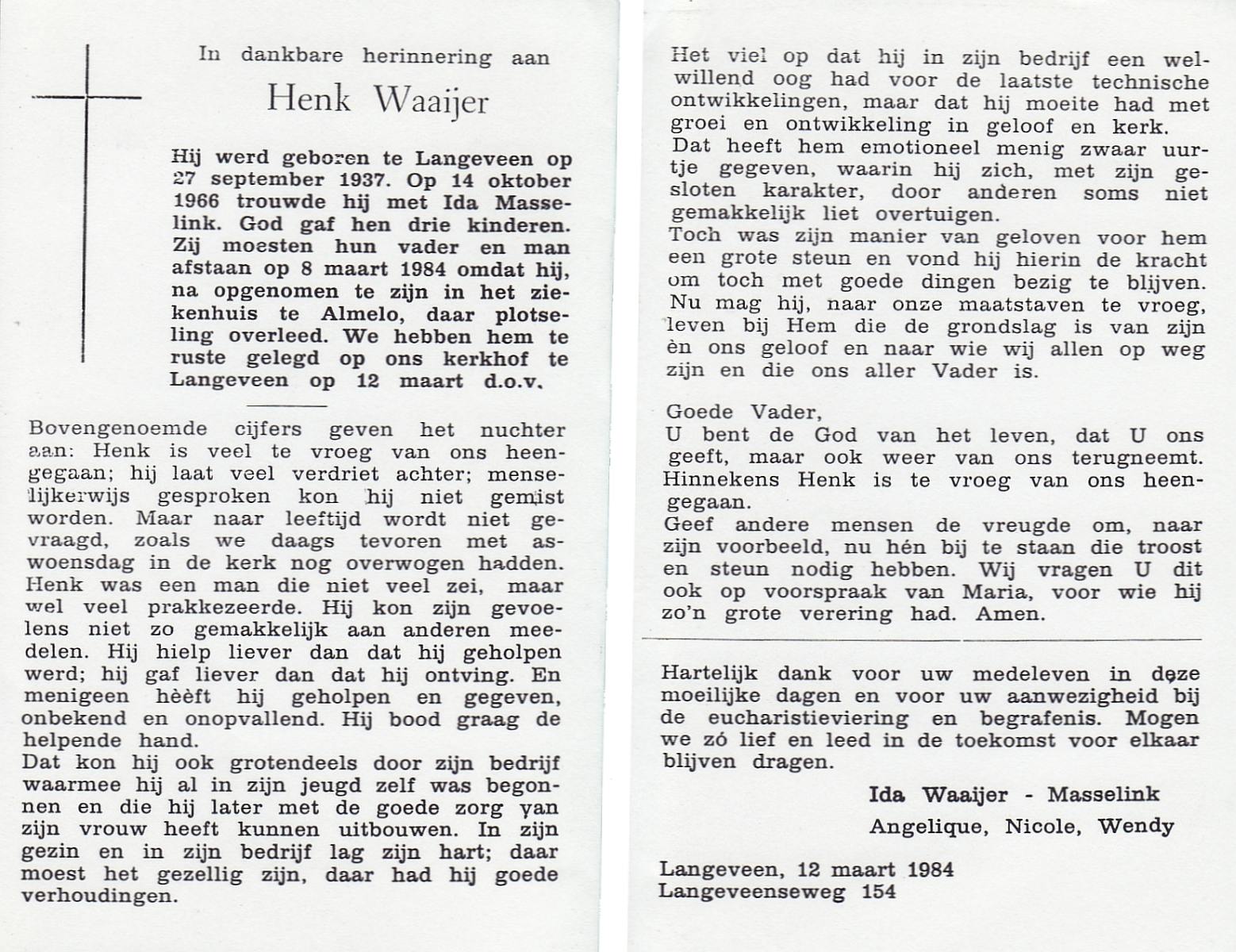 WAAIJER, Henk, geboren op 27-9-1937 te Langeveen, overleden op 9-3-1984 te Almelo op 46-jarige leeftijd, begraven op 12-3-1984 te Langeveen R.K.kerhof.