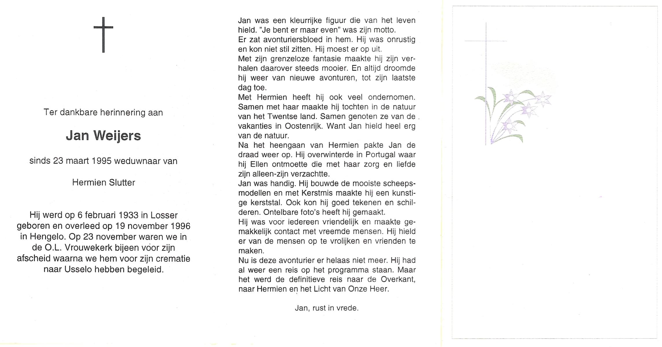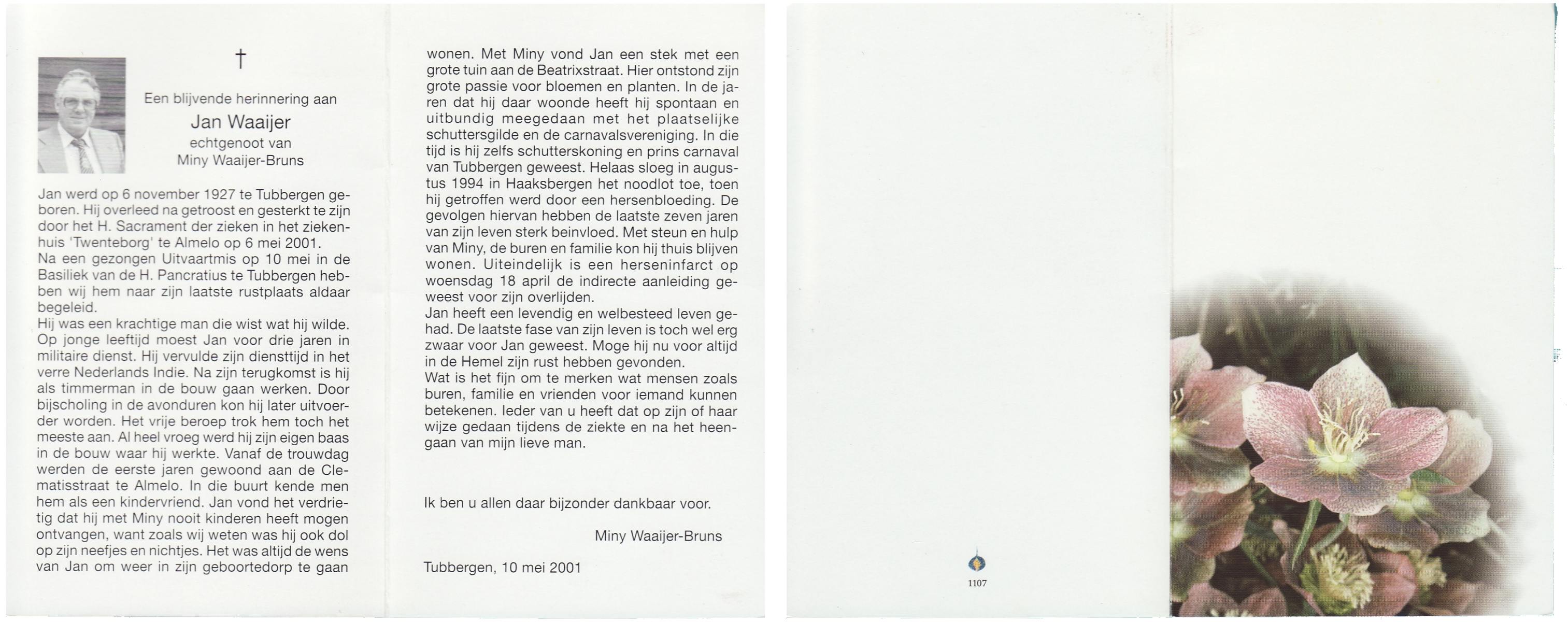 WAAIJER, Jan, geboren op 6-11-1927 te Tubbergen, overleden op 6-5-2001 te Almelo op 73-jarige leeftijd, begraven op 10-5-2001 te Tubbergen.