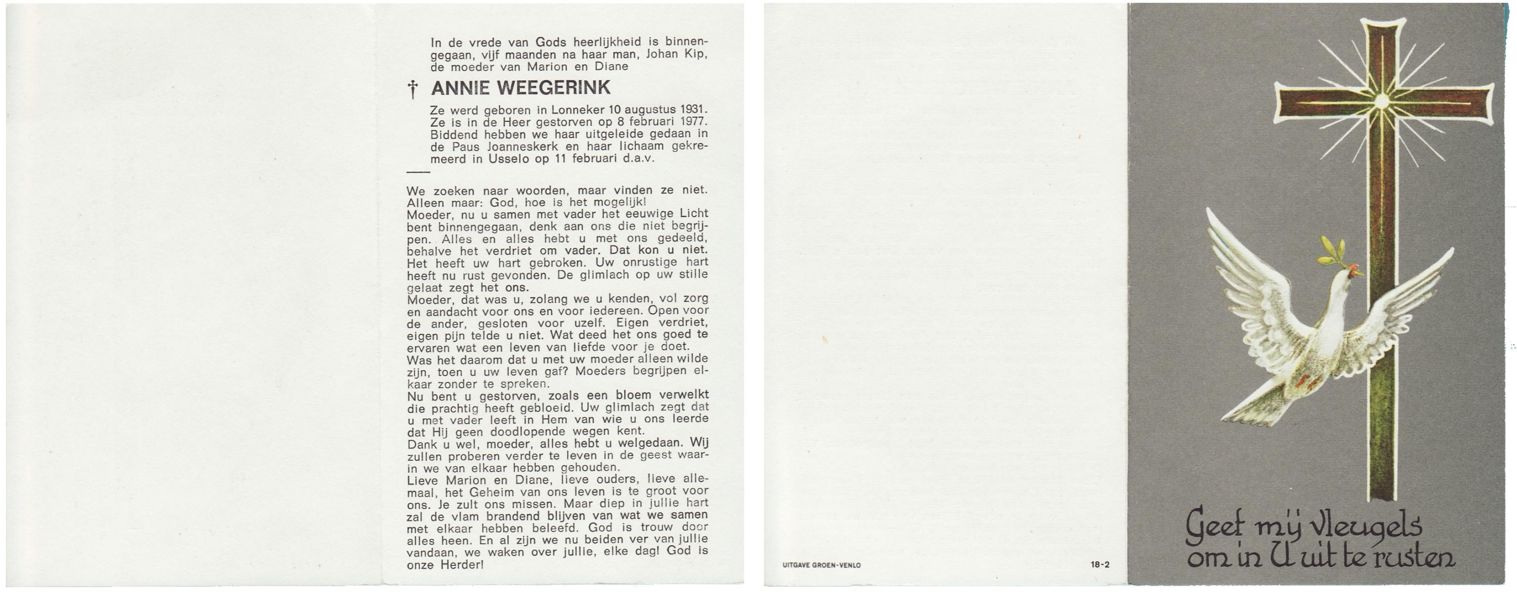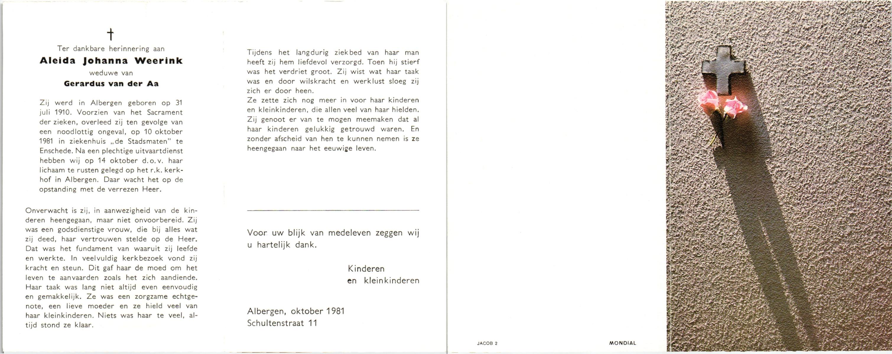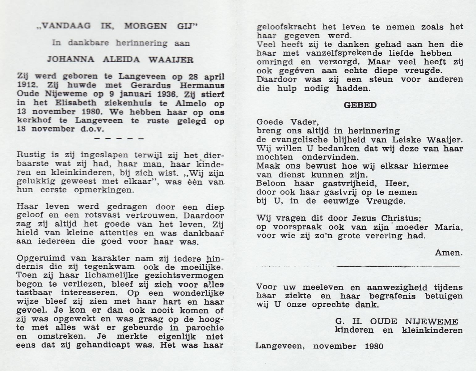 WAAIJER, Johanna Aleida, geboren op 28-4-1912 te Langeveen, overleden op 13-11-1980 te Almelo op 68-jarige leeftijd, begraven op 18-11-1980 te Langeveen R.K.kerhof.