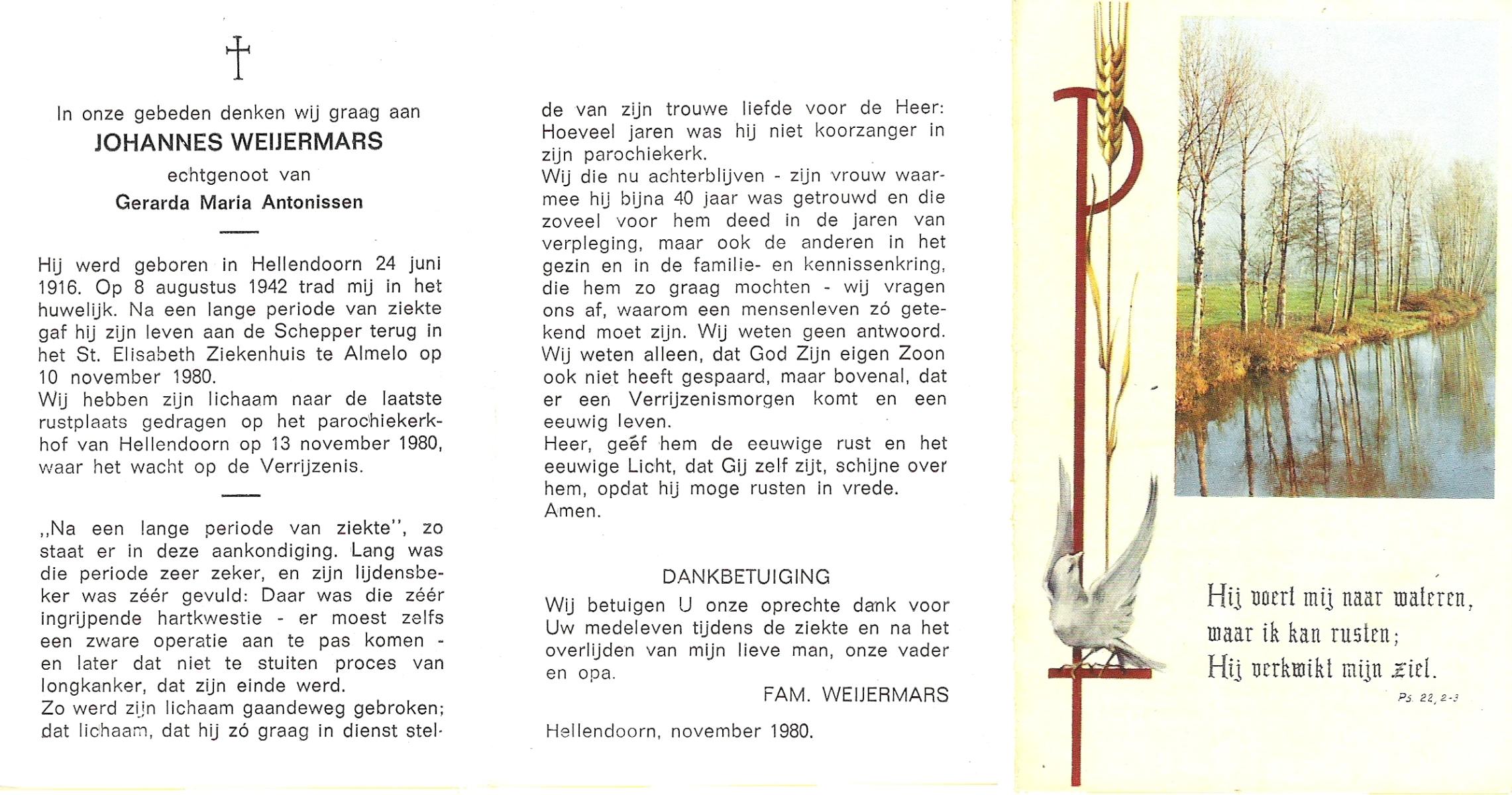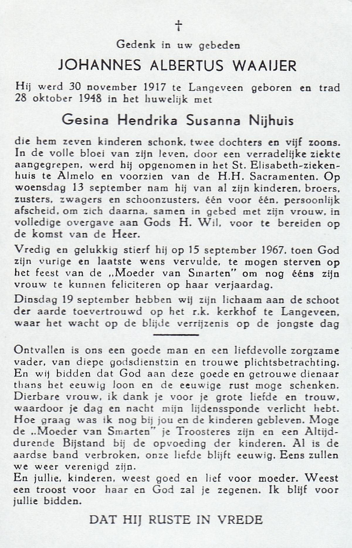 WAAIJER, Johannes Albertus, geboren op 30-11-1917 te Langeveen, overleden op 15-9-1967 te Almelo op 49-jarige leeftijd, begraven op 19-9-1967 te Langeveen.
