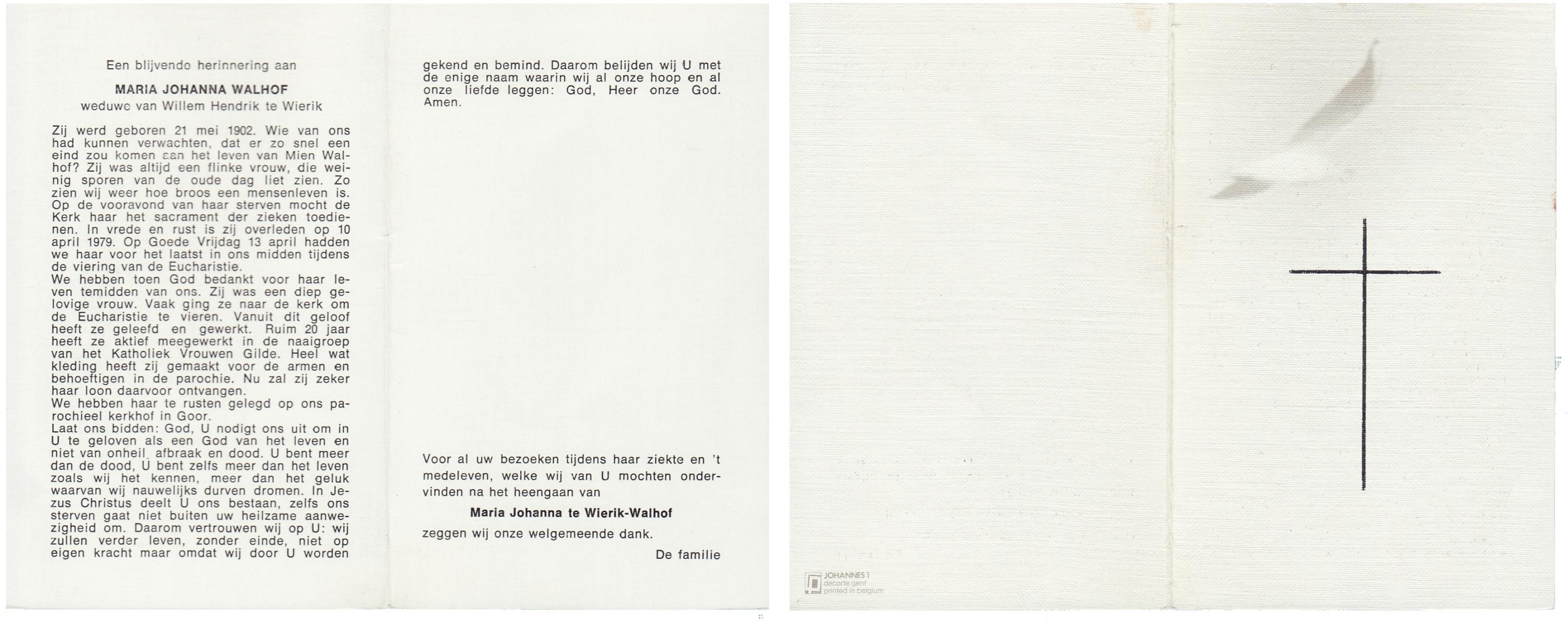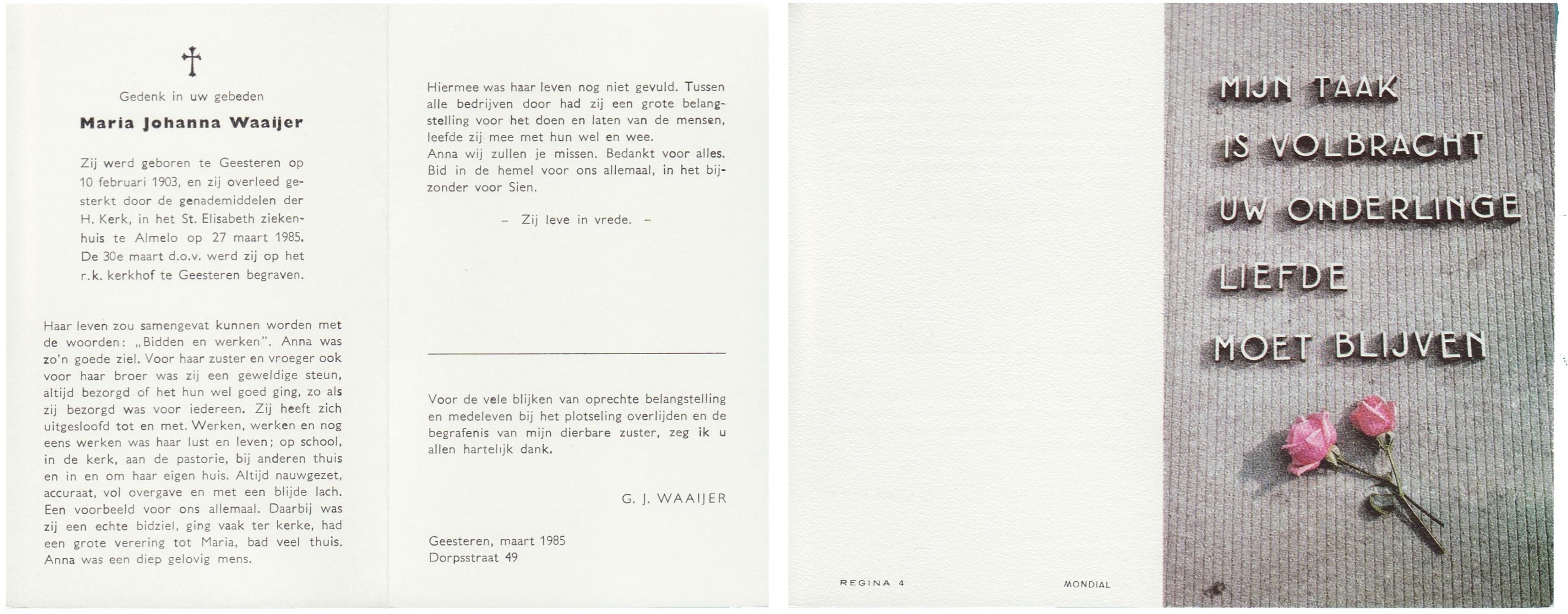 WAAIJER, Maria Johanna, geboren op 10-2-1903 te Geesteren (Ov.), overleden op 27-3-1985 te Almelo op 82-jarige leeftijd, begraven op 30-3-1985 te Geesteren.