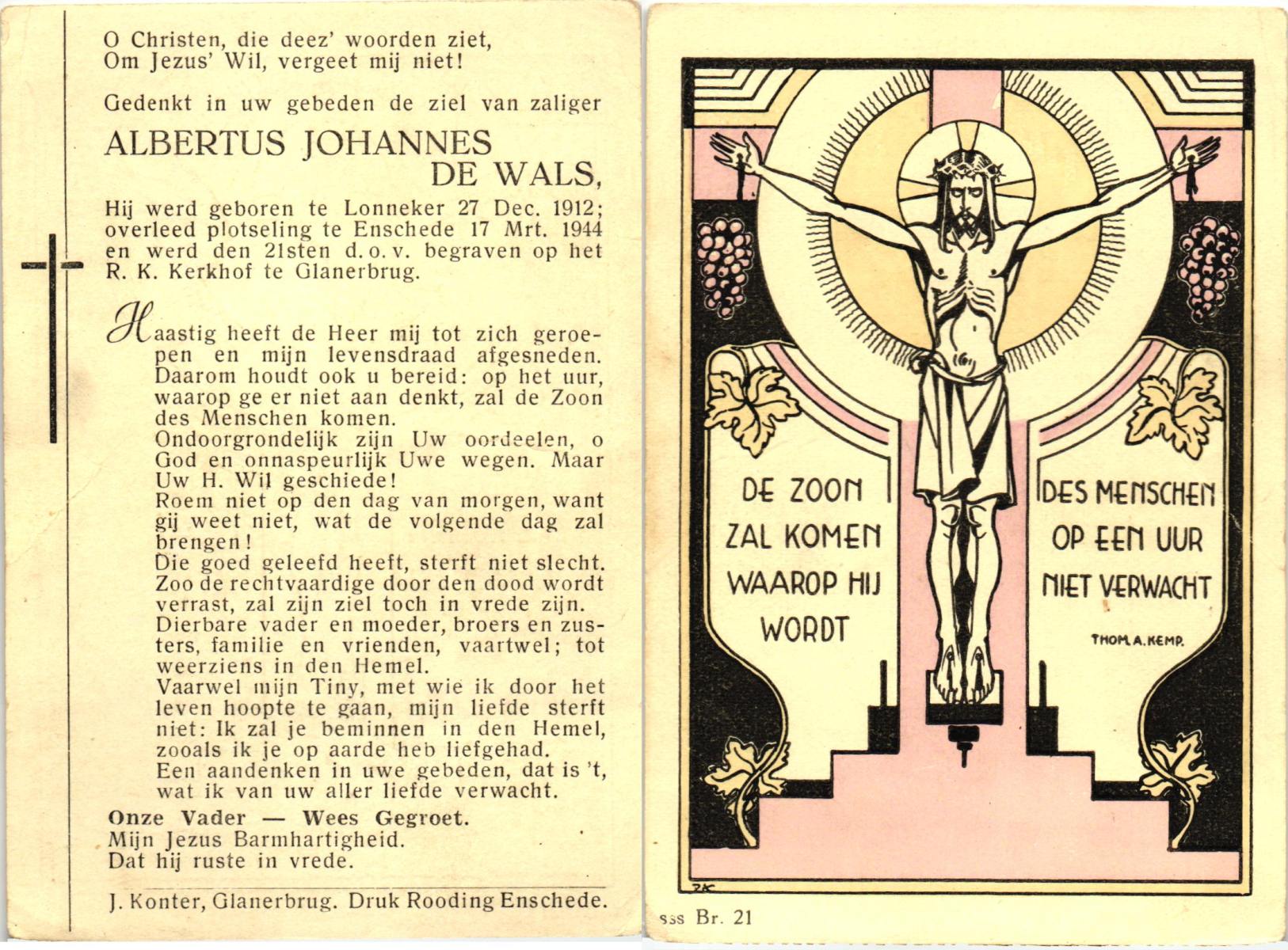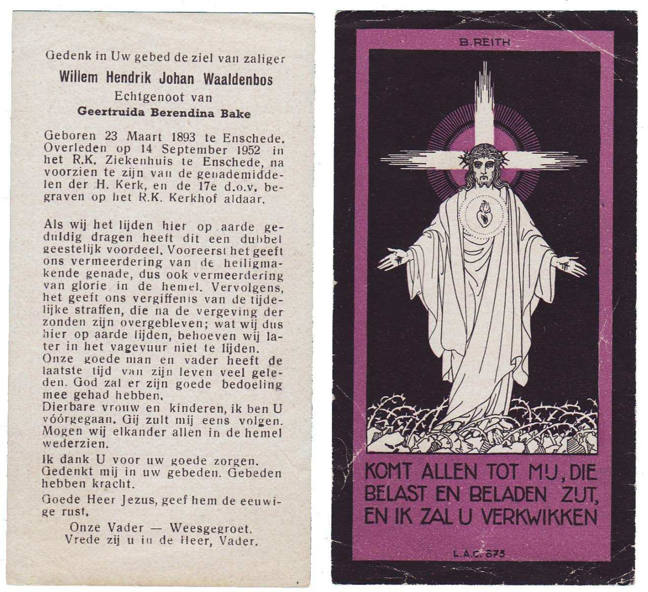 WAALDENBOS, Willem Hendrik Johan, geboren op 23-03-1893 te Enschede, overleden op 14-9-1952 te Enschede op 59-jarige leeftijd, begraven op 17-9-1952 te Enschede.