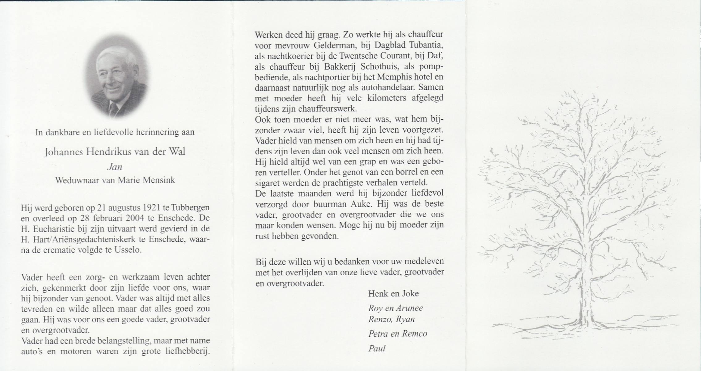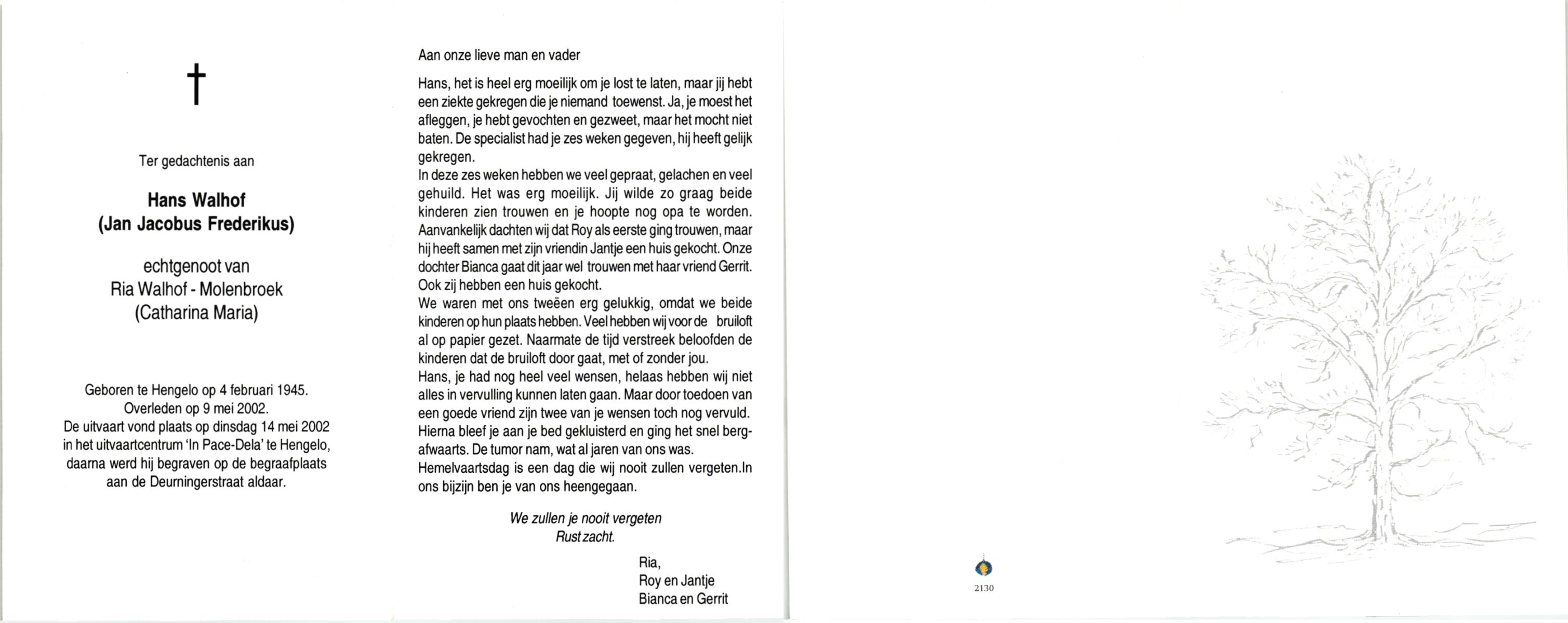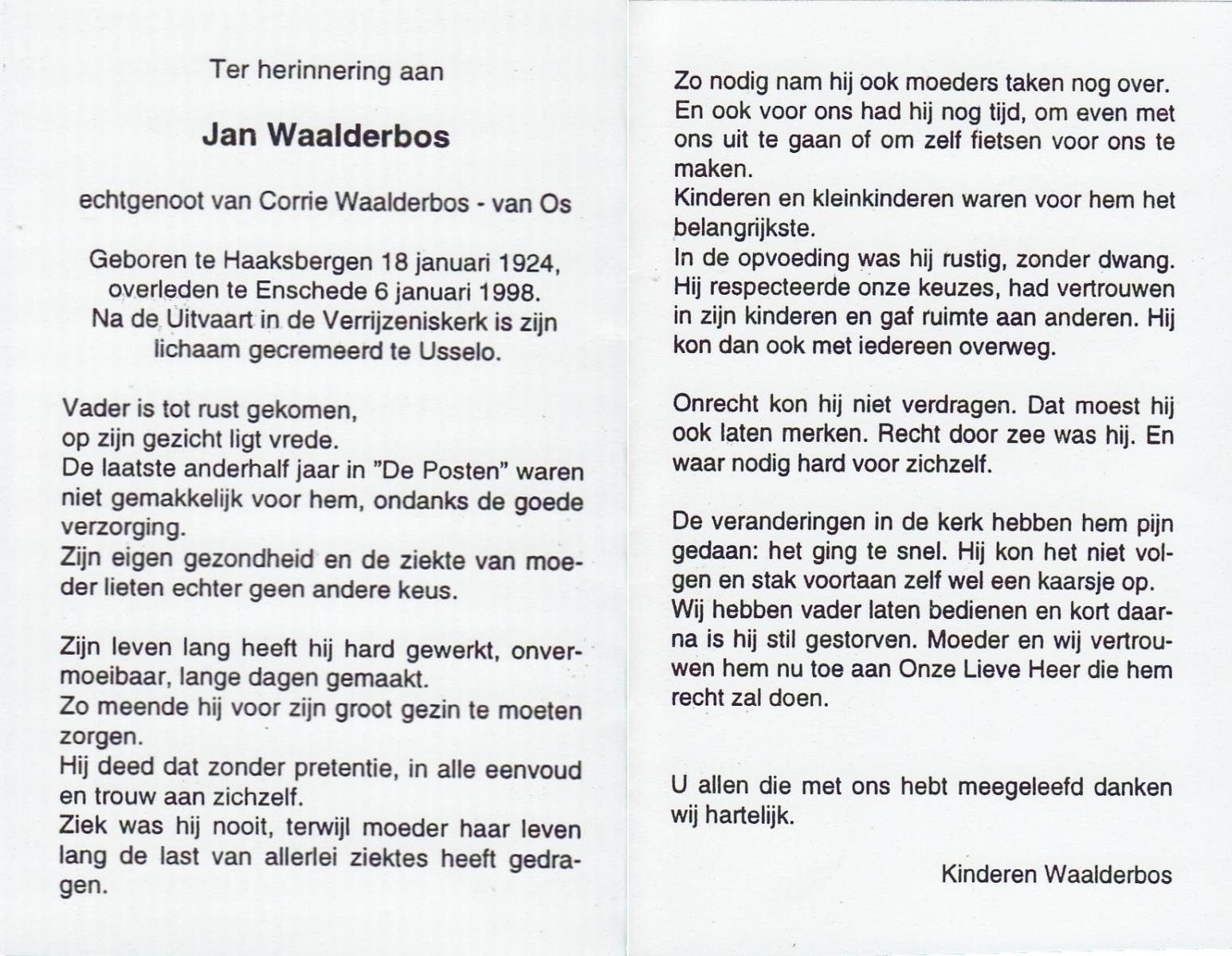 WAALDERBOS, Jan, geboren op 18-1-1924 te Haaksbergen, overleden op 6-1-1998 te Enschede op 73-jarige leeftijd, gecremeerd te Usselo.
