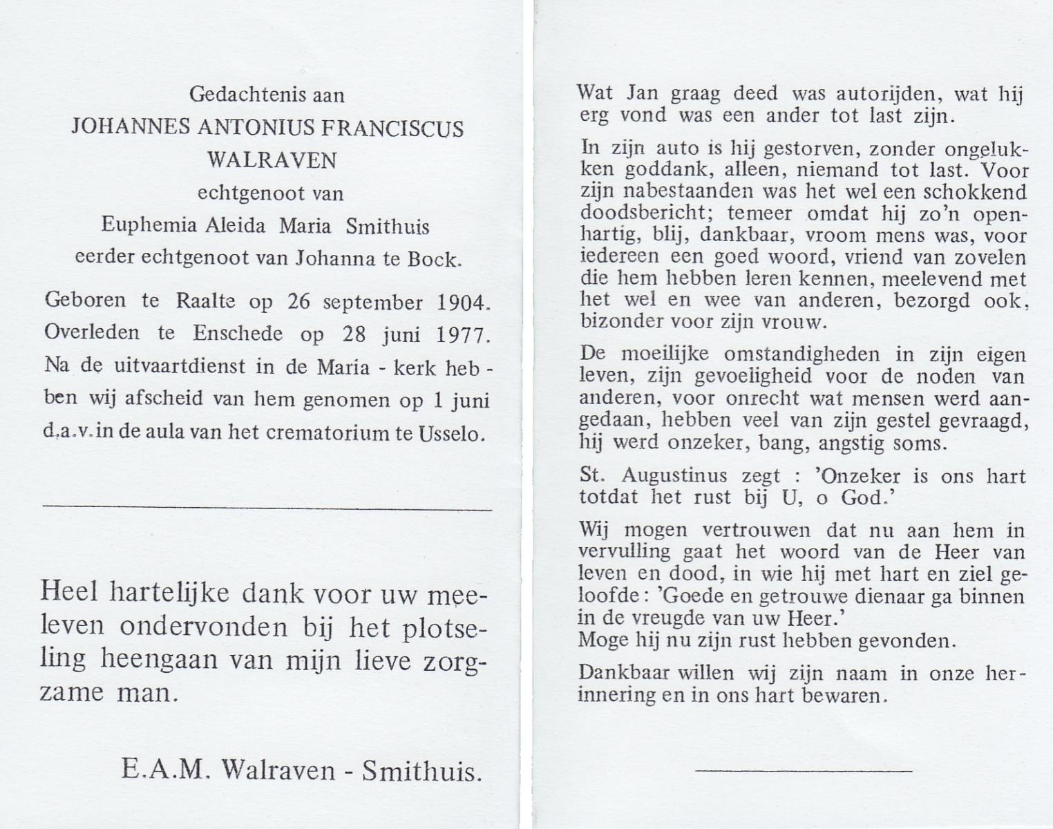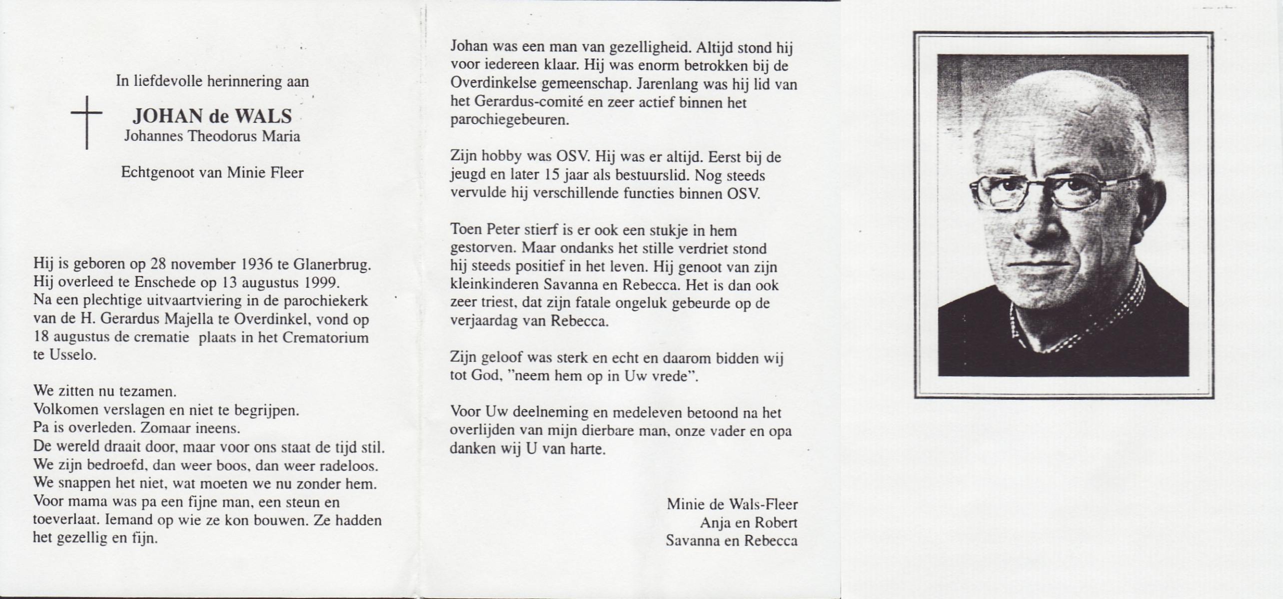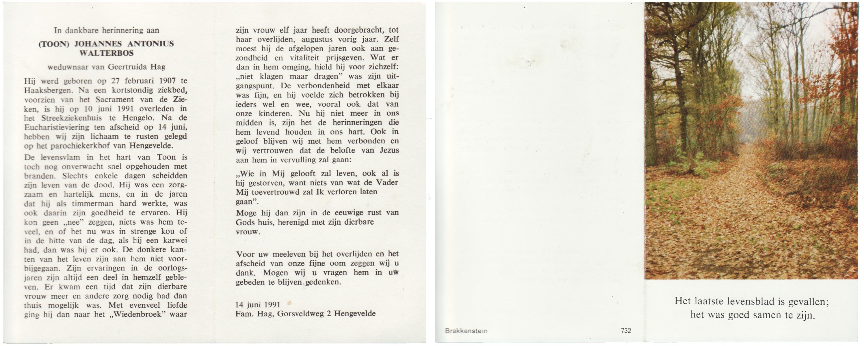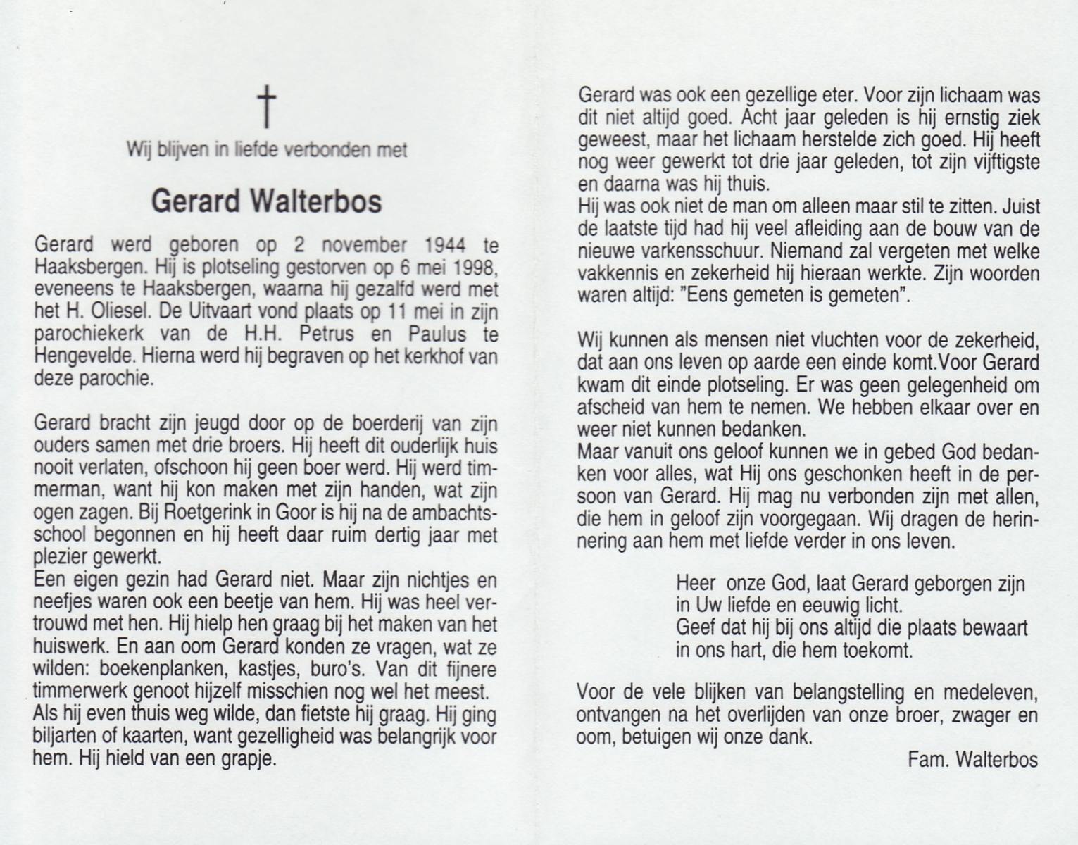 WAALDERBOS, Jan, geboren op 18-1-1924 te Haaksbergen, overleden op 6-1-1998 te Enschede op 73-jarige leeftijd, gecremeerd te Usselo.