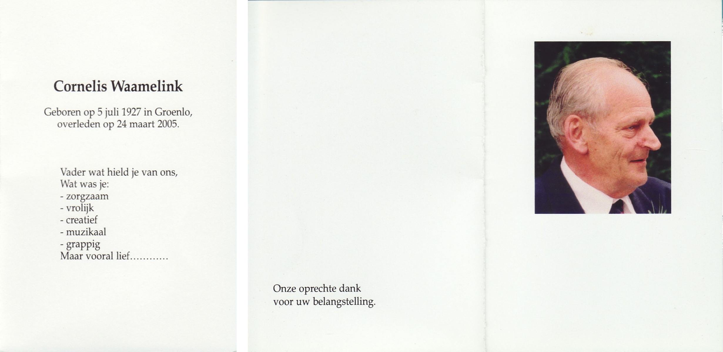 WAAMELINK, Cornelis, geboren op 5-7-1927 te Groenlo, overleden op 24-3-2005 op 77-jarige leeftijd.