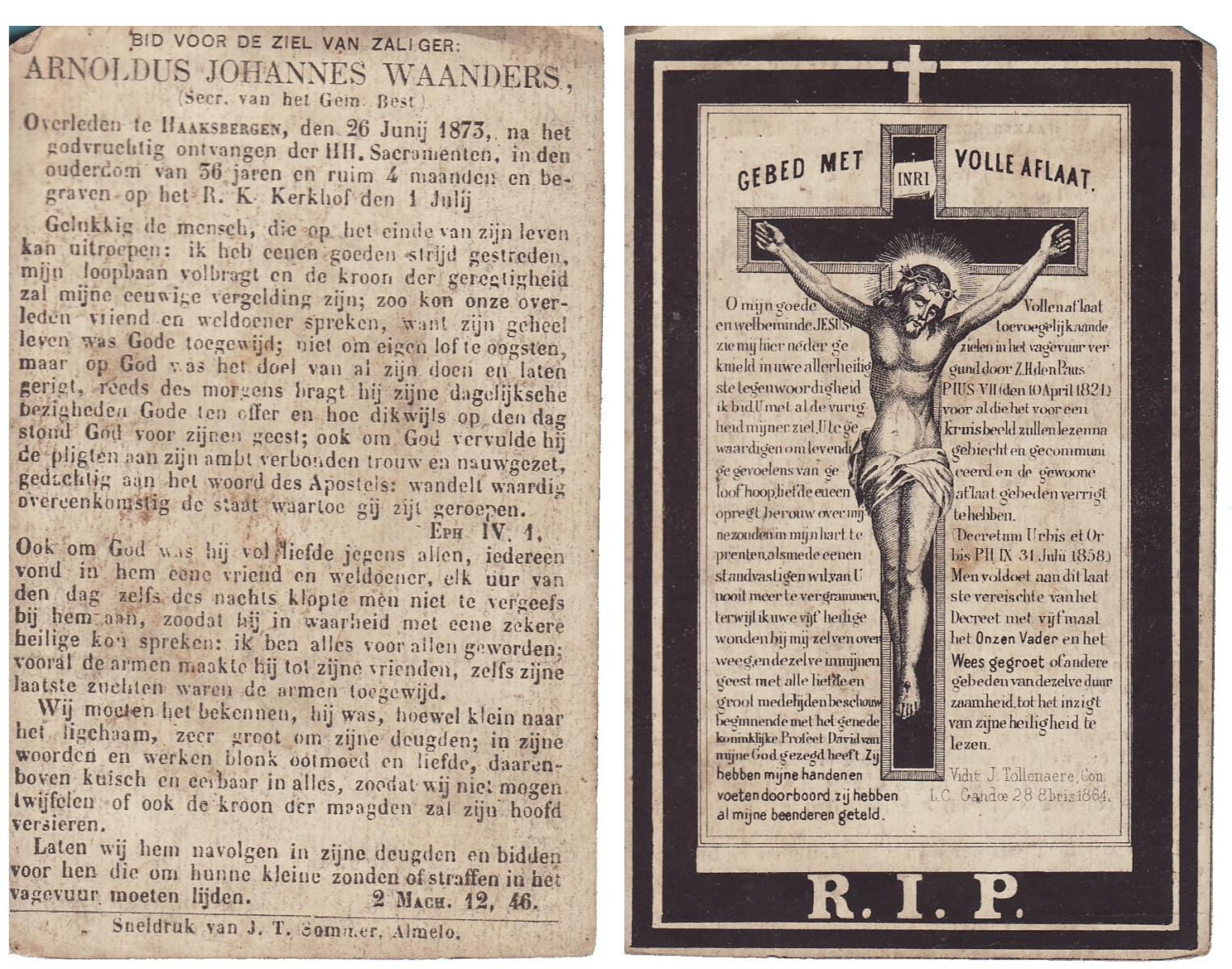 WAANDERS, Arnoldus Johannes, overleden op 26-06-1873 te Haaksbergen op 36-jarige leeftijd, begraven op 01-07-1873 te Haaksbergen.