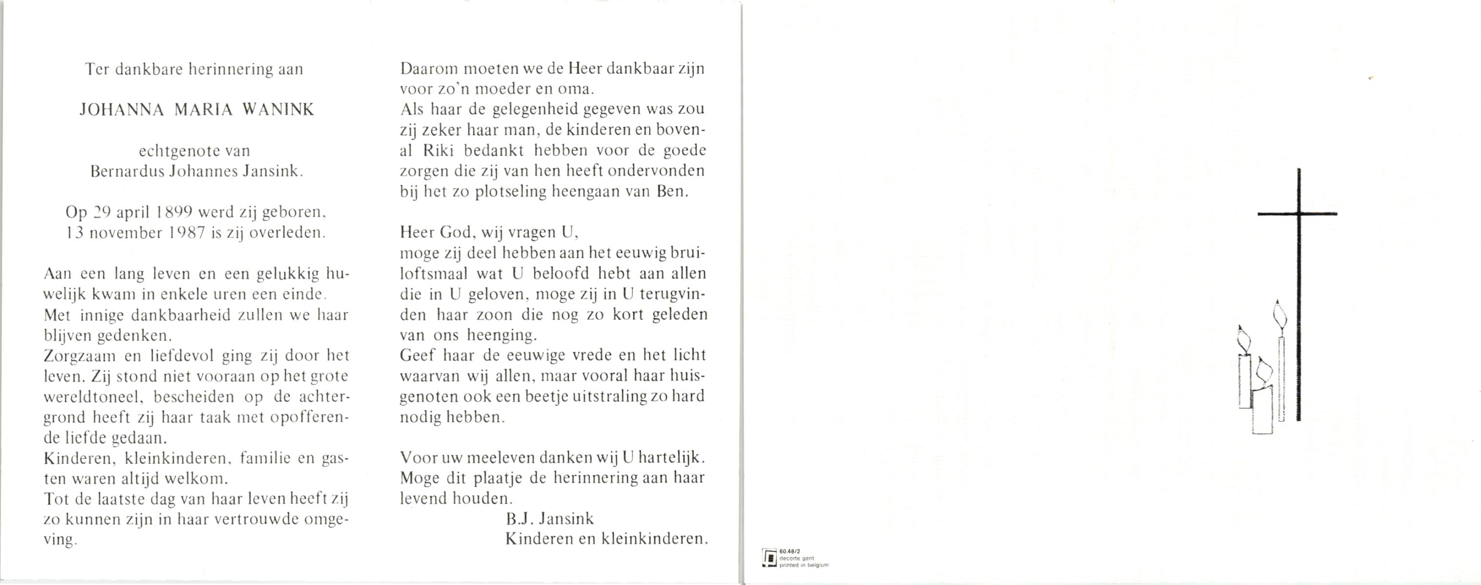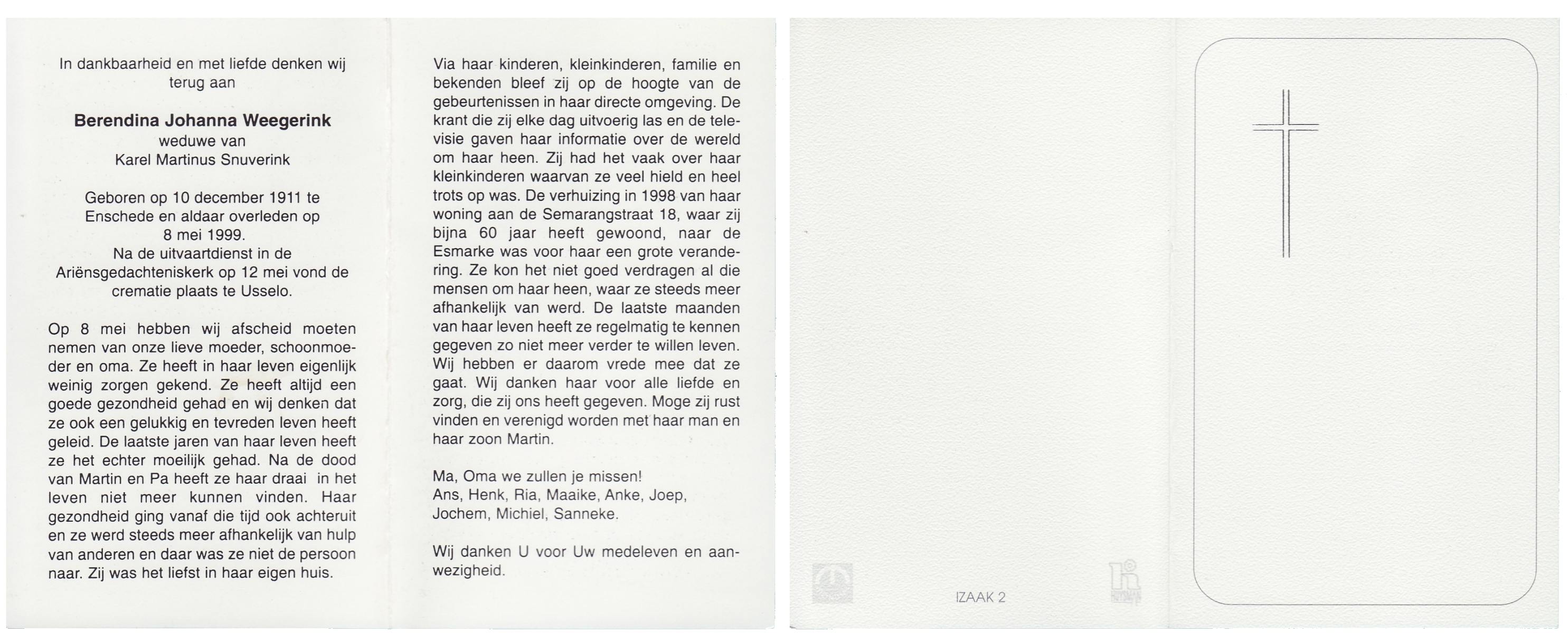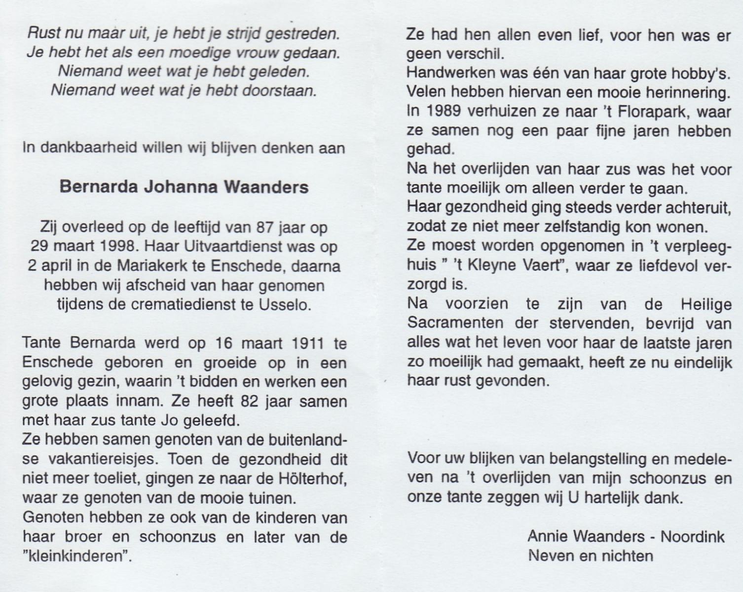 WAANDERS, Bernarda Johanna, geboren op 16-3-1911 te Enschede, overleden op 29-3-1998 op 87-jarige leeftijd, gecremeerd op 2-4-1998 te Usselo.