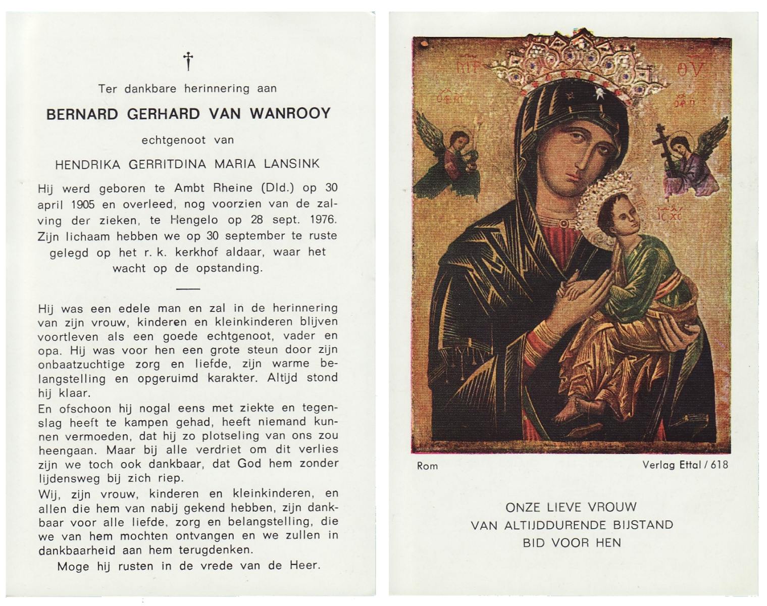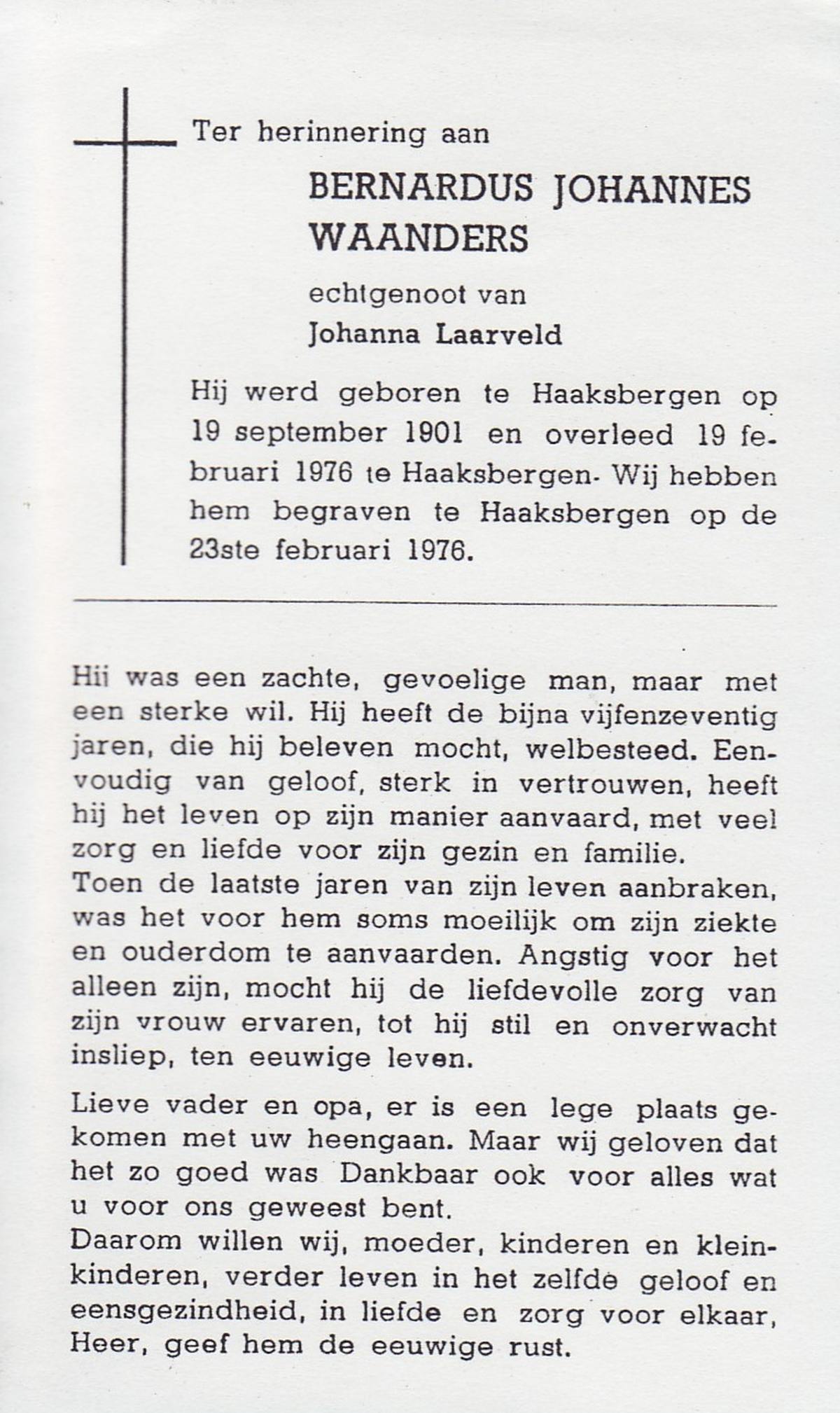 WAANDERS, Bernardus Johannes, geboren op 19-9-1901 te Haaksbergen, overleden op 19-2-1976 te Haaksbergen op 74-jarige leeftijd, begraven op 23-2-1976 te Haaksbergen.