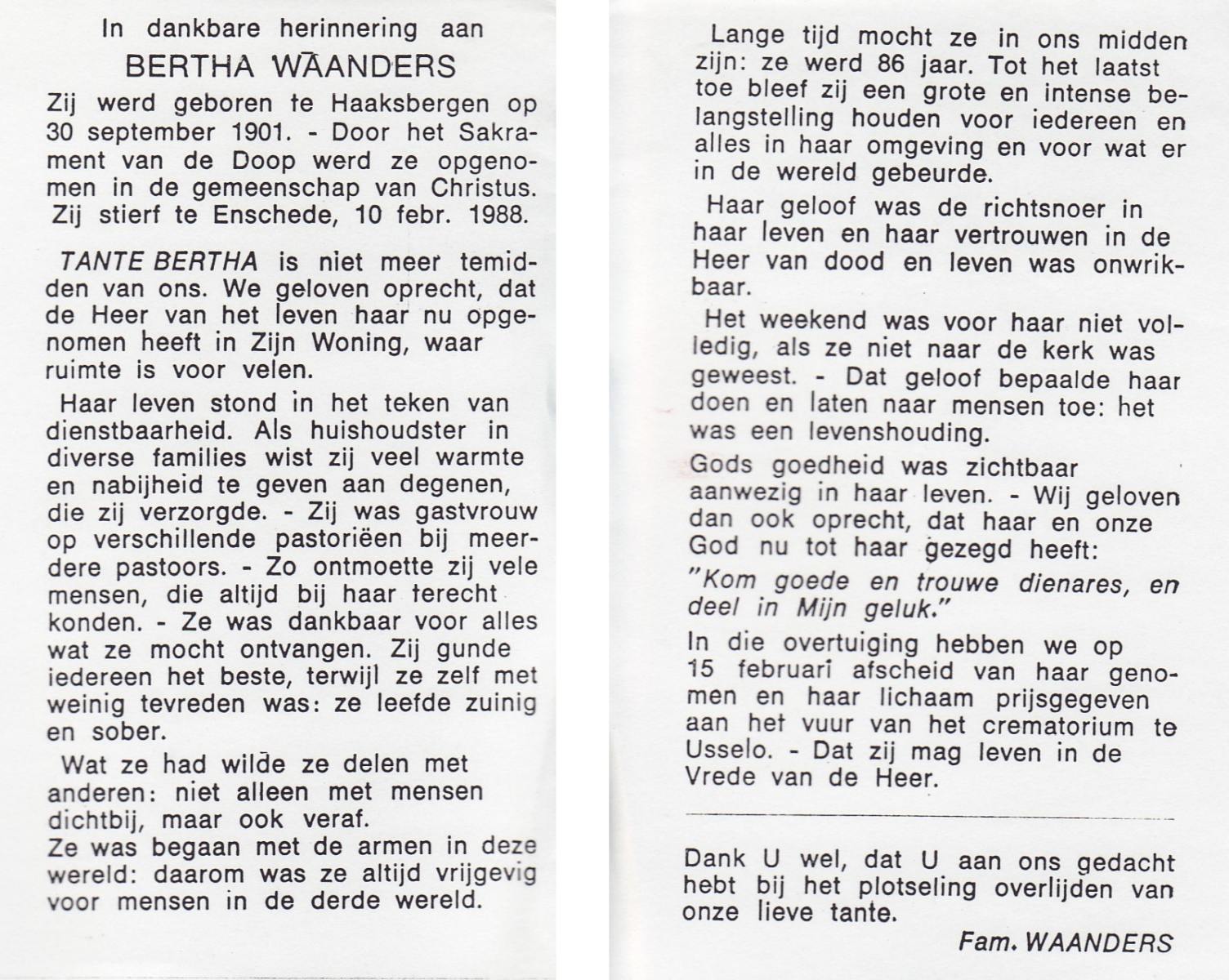 WAANDERS, Bertha, geboren op 30-9-1901 te Haaksbergen, overleden op 10-2-1988 te Enschede op 80-jarige leeftijd.