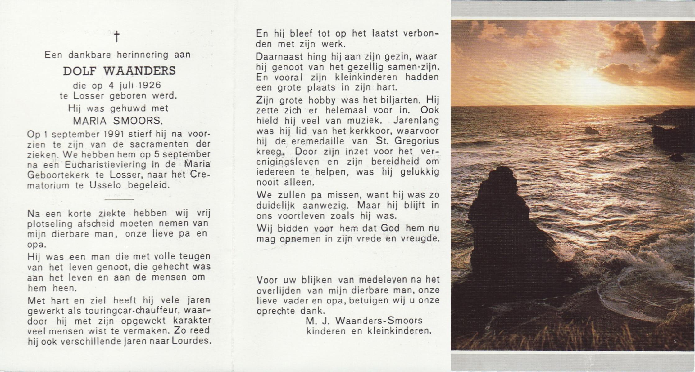 WAANDERS, Dolf, geboren op 4-7-1926 te Losser, overleden op 1-9-1991 op 65-jarige leeftijd, gecremeerd op 5-9-1991 te Usselo.