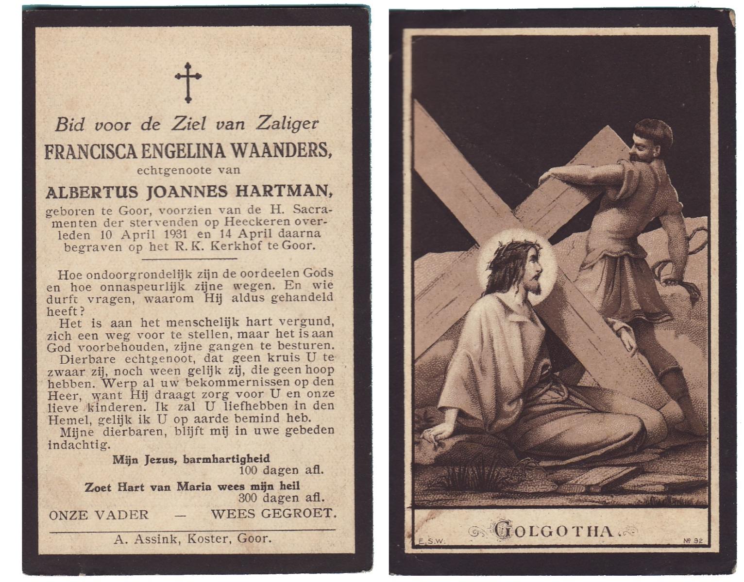 WAANDERS, Francisca Engelina, geboren te Goor, overleden op 10-4-1931 te Heeckeren, begraven op 14-4-1931 te Goor.