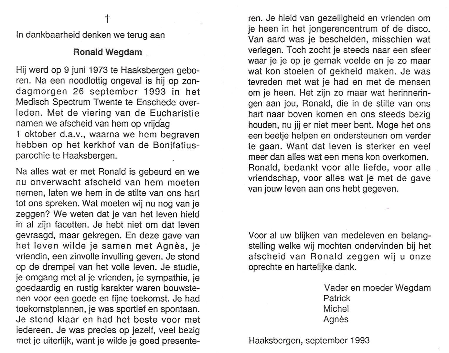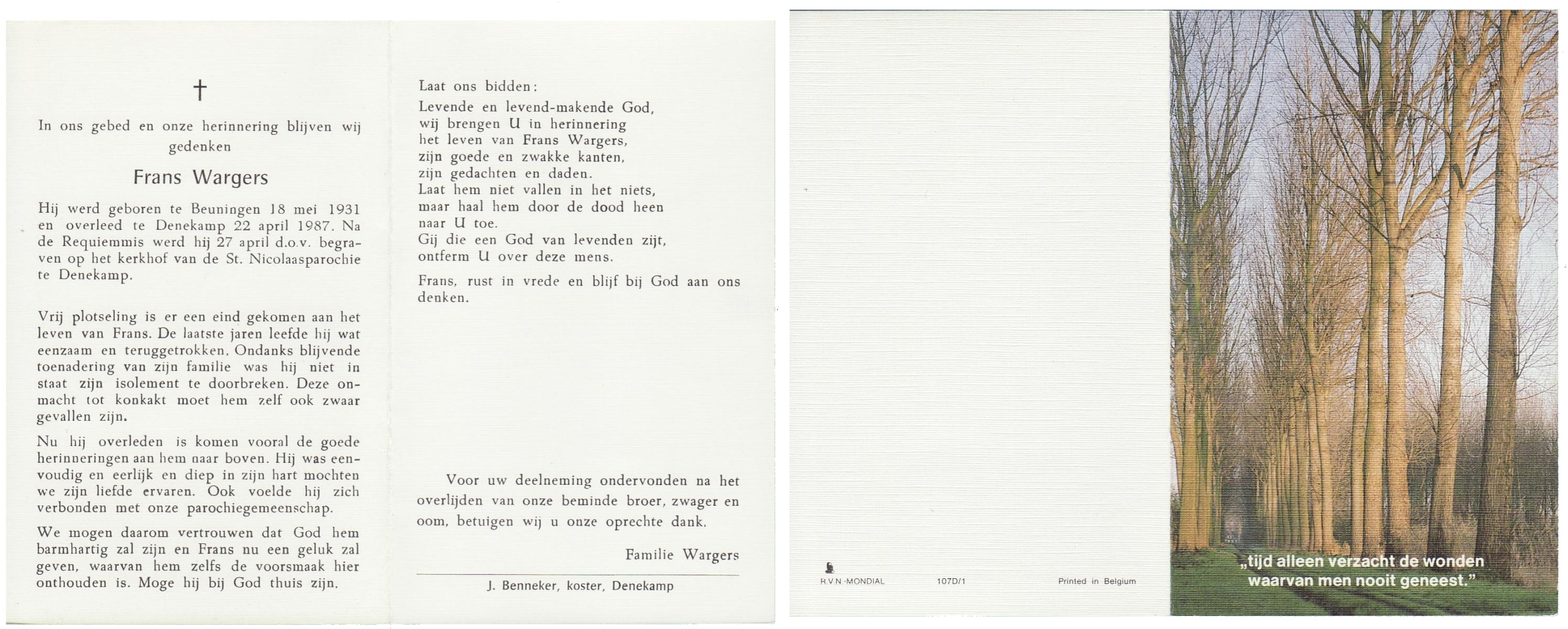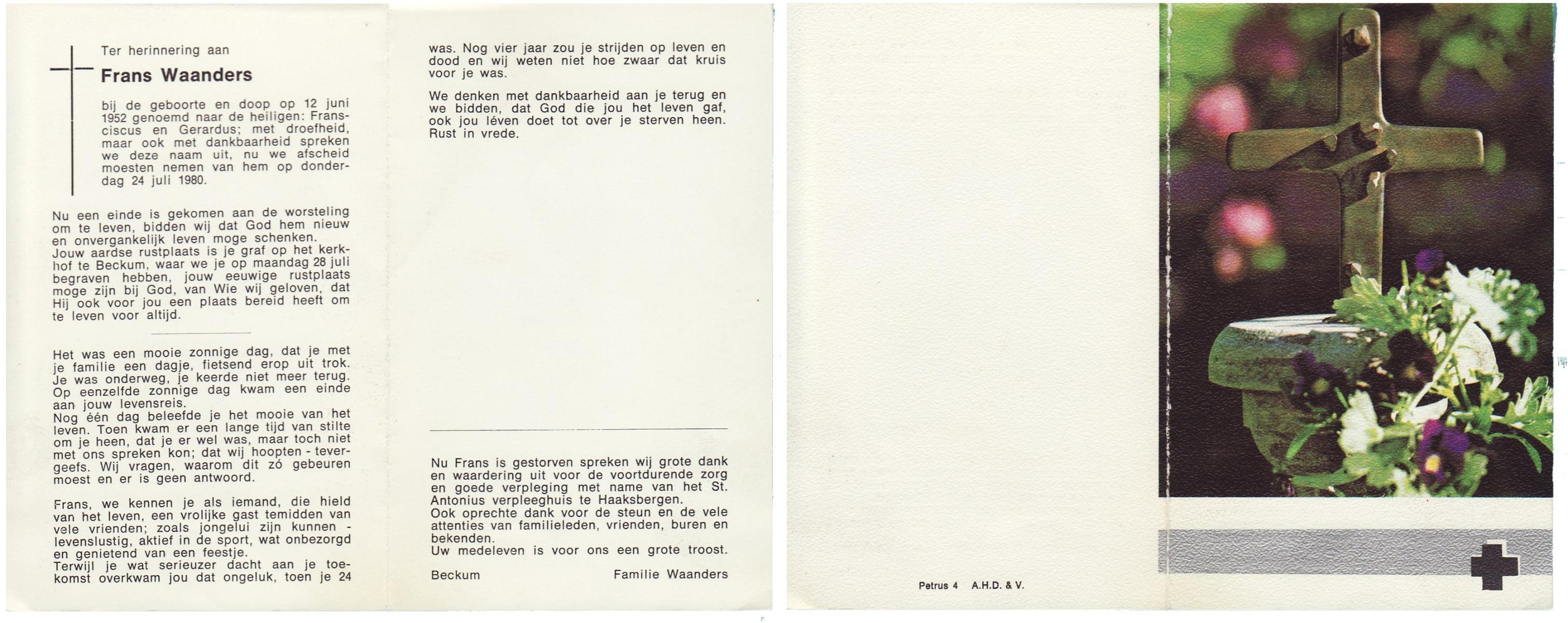 WAANDERS, Frans (Fransiscus Gerardus), geboren op 12-6-1952 te Beckum, overleden op 24-7-1980 te Haaksbergen op 28-jarige leeftijd, begraven op 28-7-1980 te Beckum.