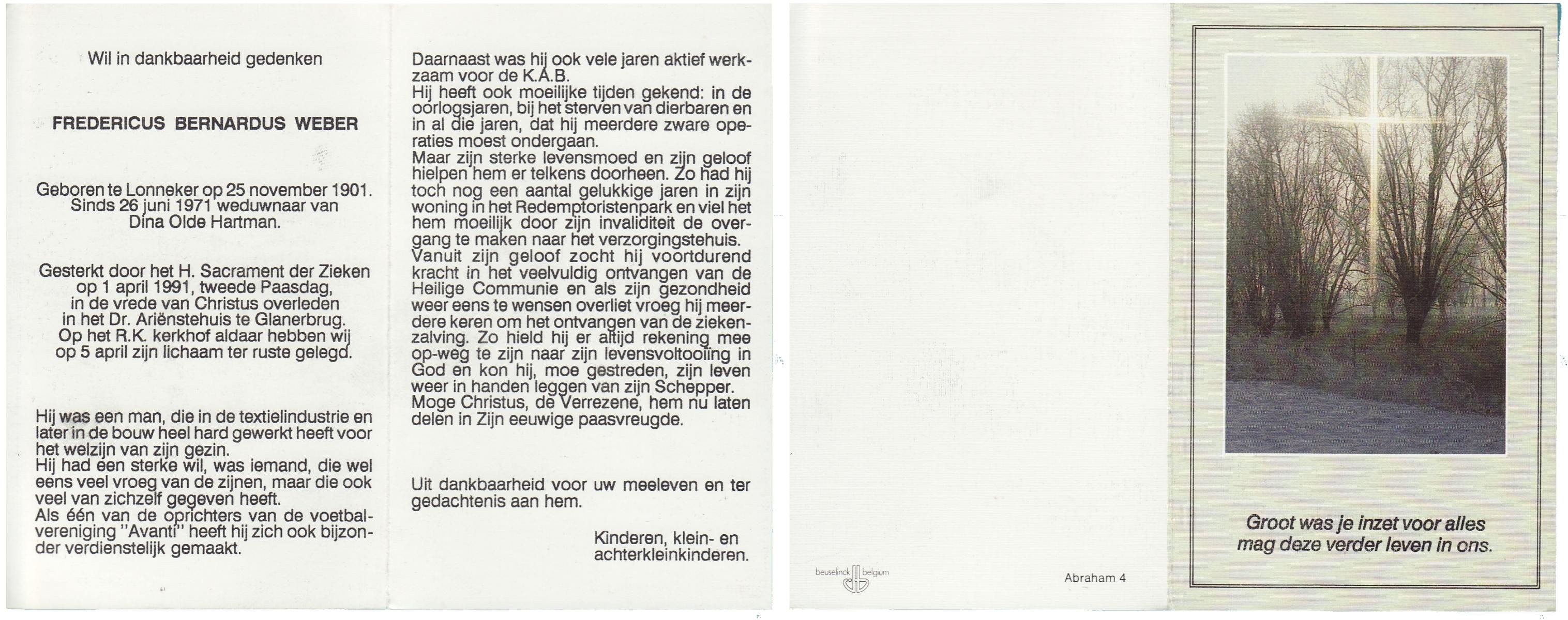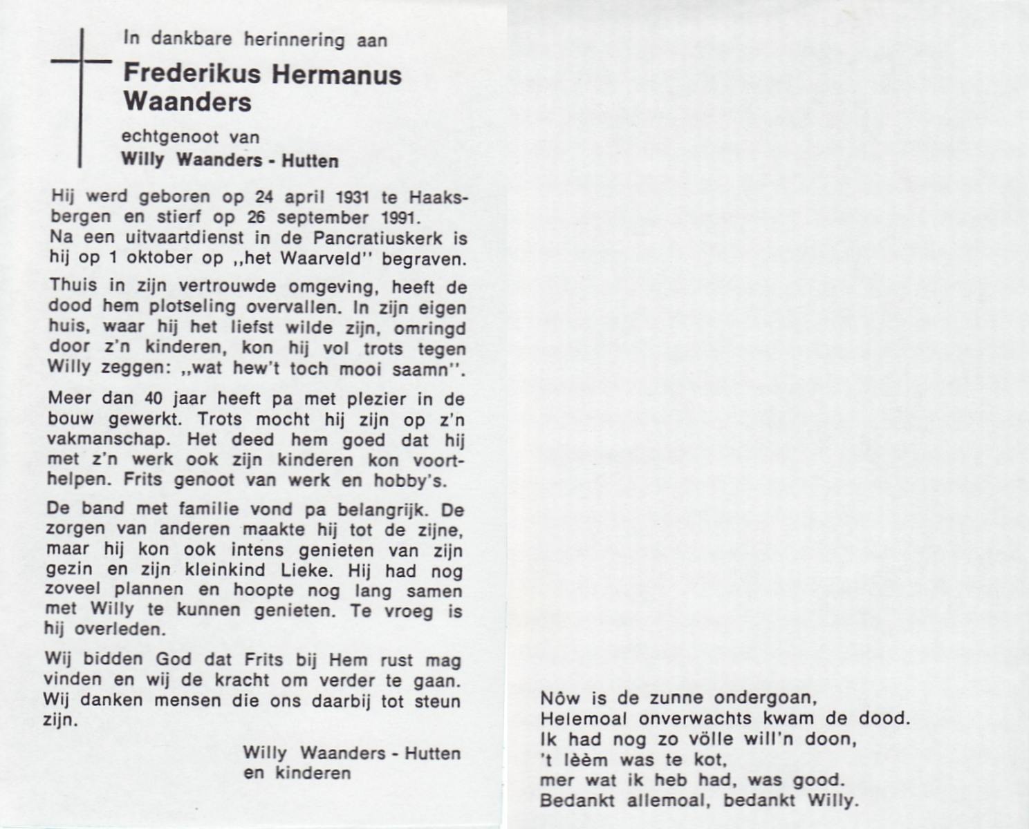 WAANDERS, Frederikus Hermanus, geboren op 24-4-1931 te Haaksbergen, overleden op 26-9-1991 op 60-jarige leeftijd, begraven op 1-10-1991 te Haaksbergen.