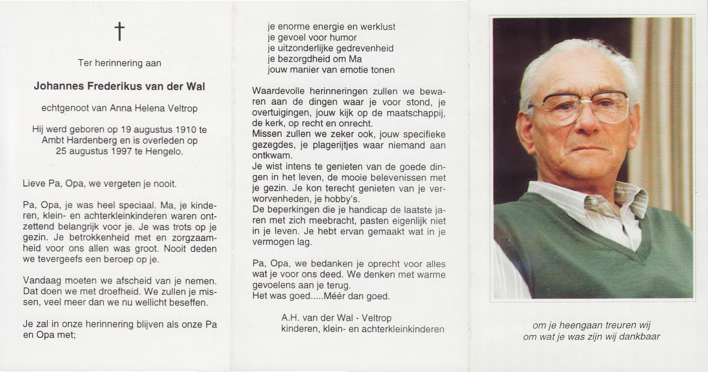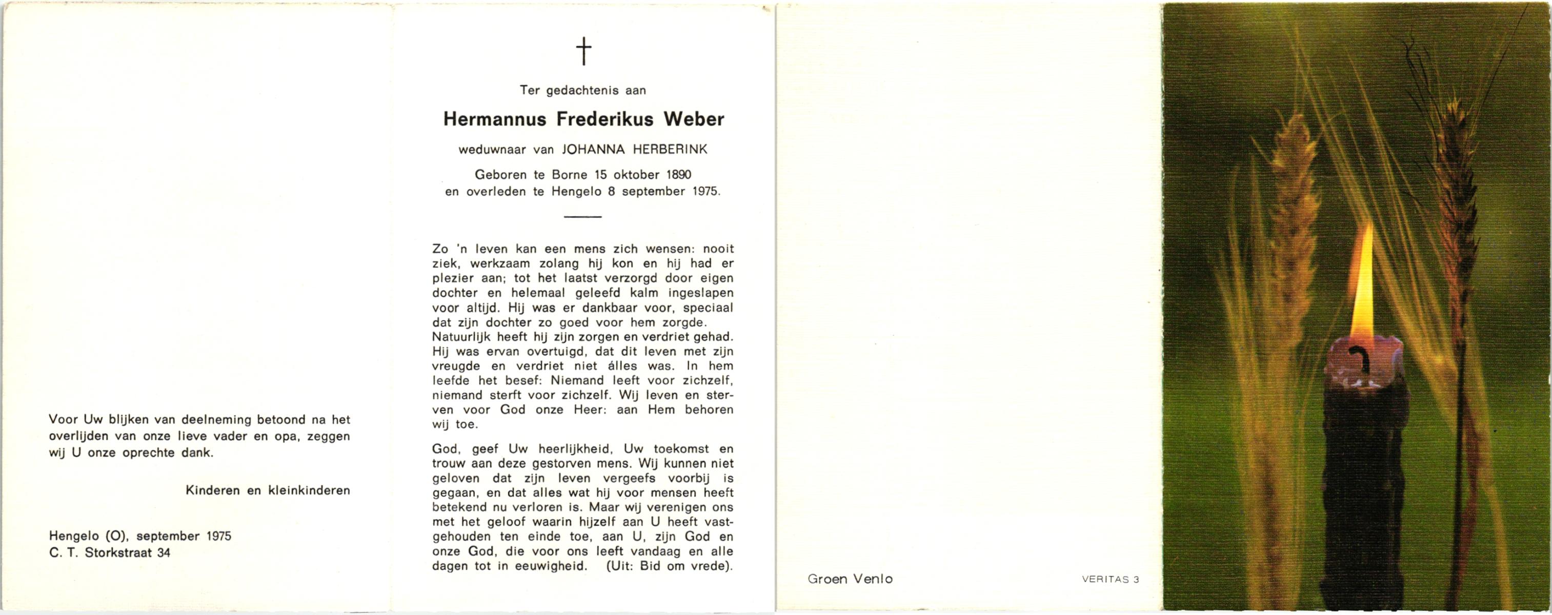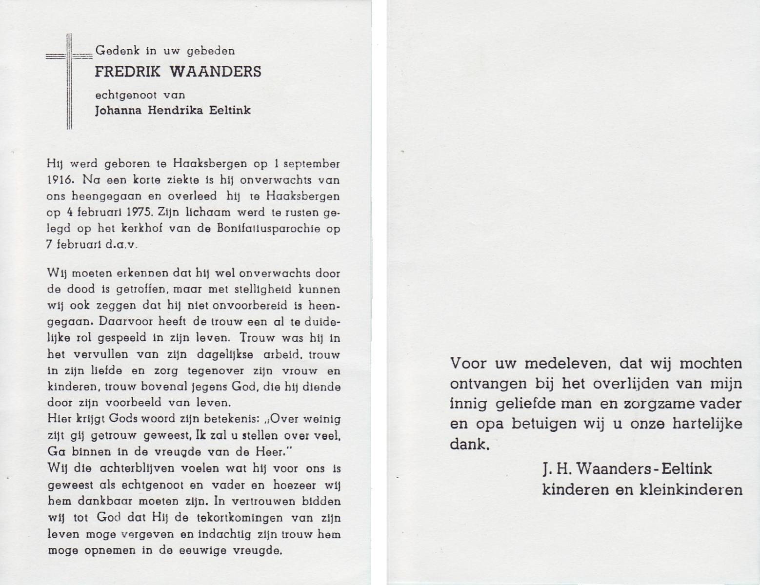 WAANDERS, Fredrik, geboren op 1-9-1916 te Haaksbergen, overleden op 4-2-1975 te Haaksbergen op 58-jarige leeftijd, begraven op 7-2-1975 te Haaksbergen.