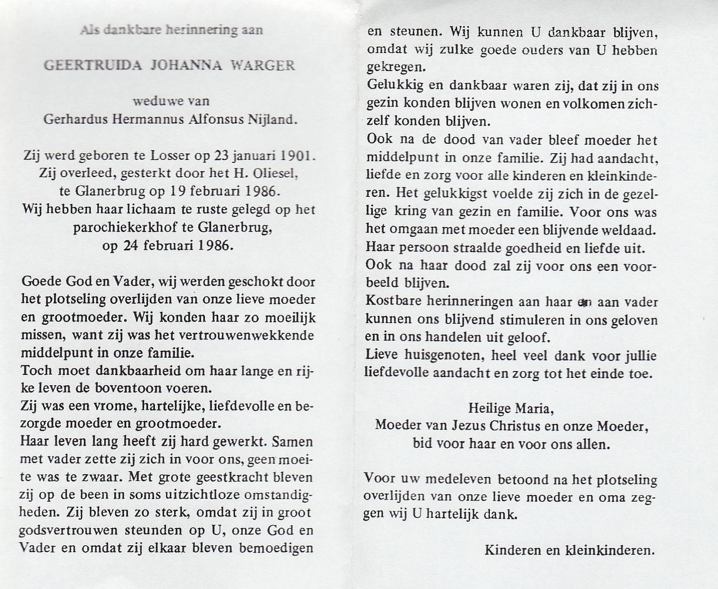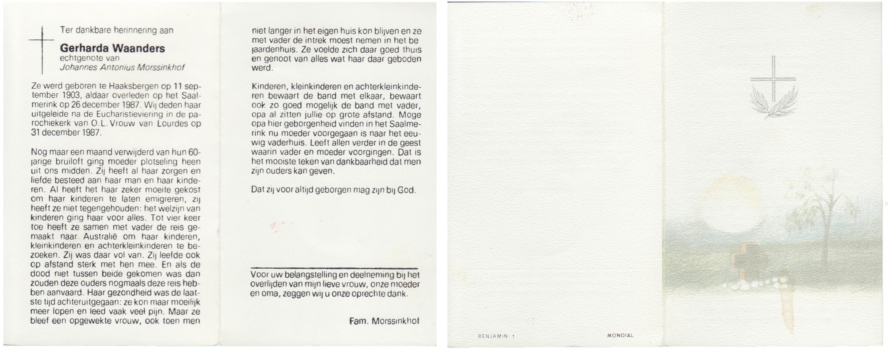 WAANDERS, Gerharda, geboren op 11-9-1903 te Haaksbergen, overleden op 26-12-1987 te Haaksbergen op 84-jarige leeftijd, begraven op 31-12-1987 te Haaksbergen.