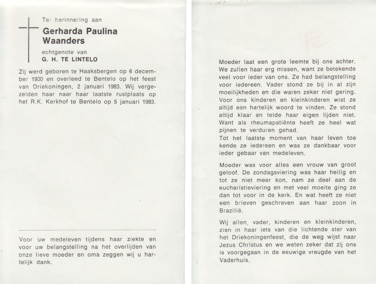 WAANDERS, Gerharda Paulina, geboren op 6-12-1900 te Haaksbergen, overleden op 2-1-1983 te Bentelo op 83-jarige leeftijd, begraven op 5-1-1983 te Bentelo.
