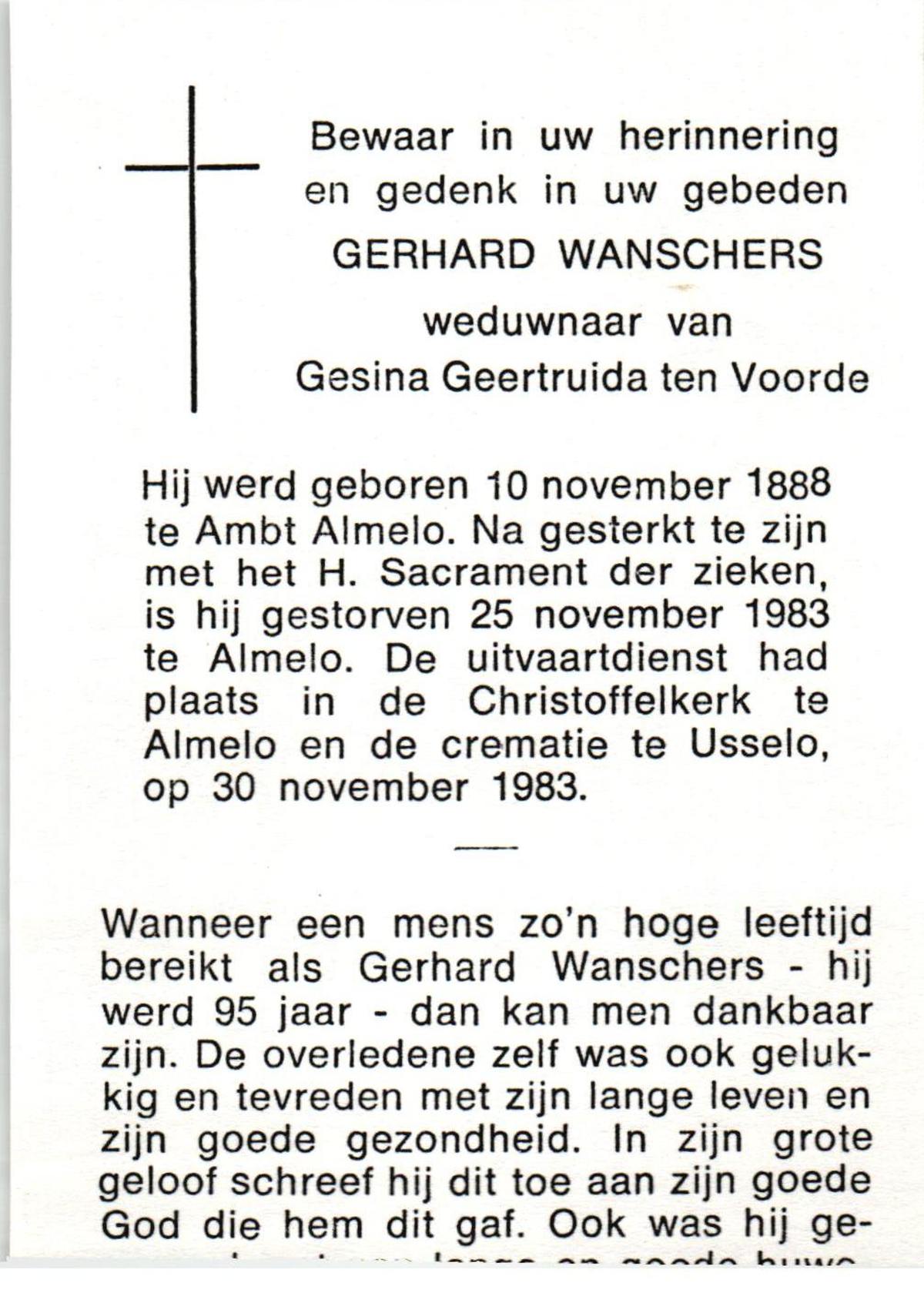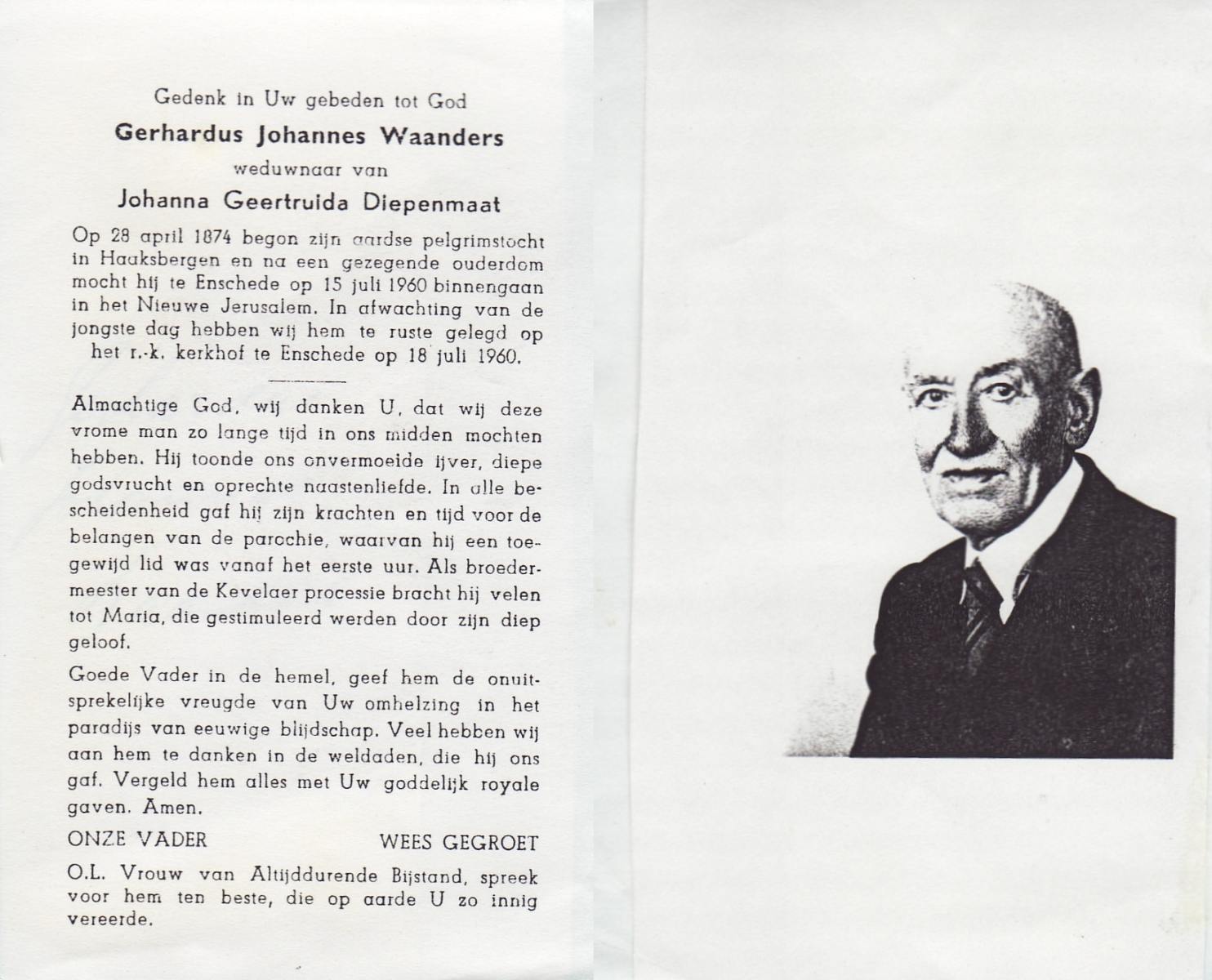 WAANDERS, Gerhardus Johannes, geboren op 28-04-1874 te Haaksbergen, overleden op 15-7-1960 te Enschede op 86-jarige leeftijd, begraven op 18-7-1960 te Enschede.