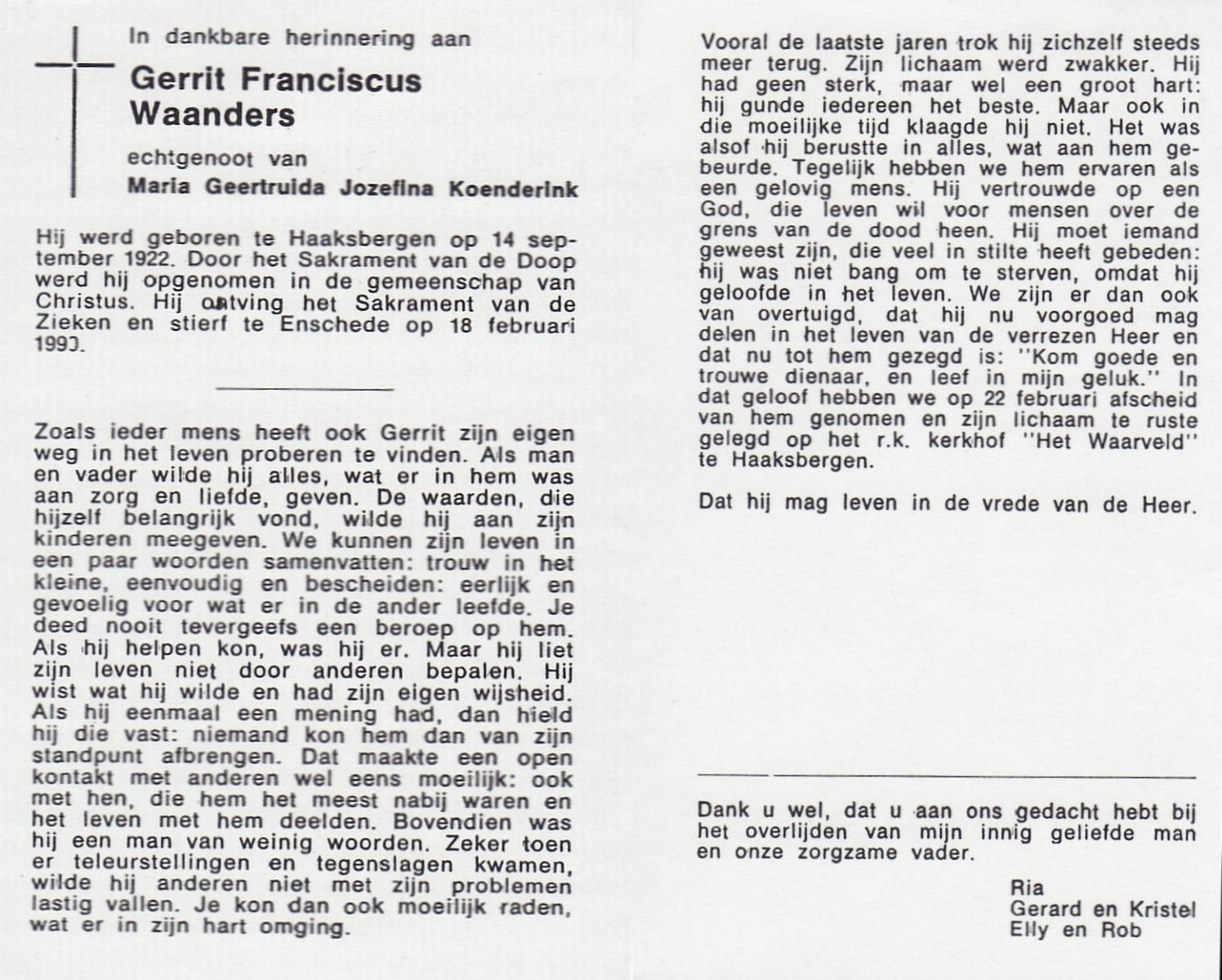 WAANDERS, Gerrit Franciscus, geboren op 14-9-1922 te Haaksbergen, overleden op 18-2-1990 te Enschede op 67-jarige leeftijd, begraven op 22-2-1990 te Haaksbergen.