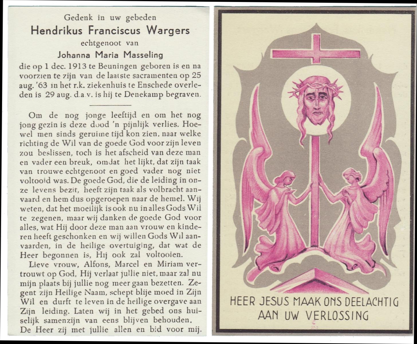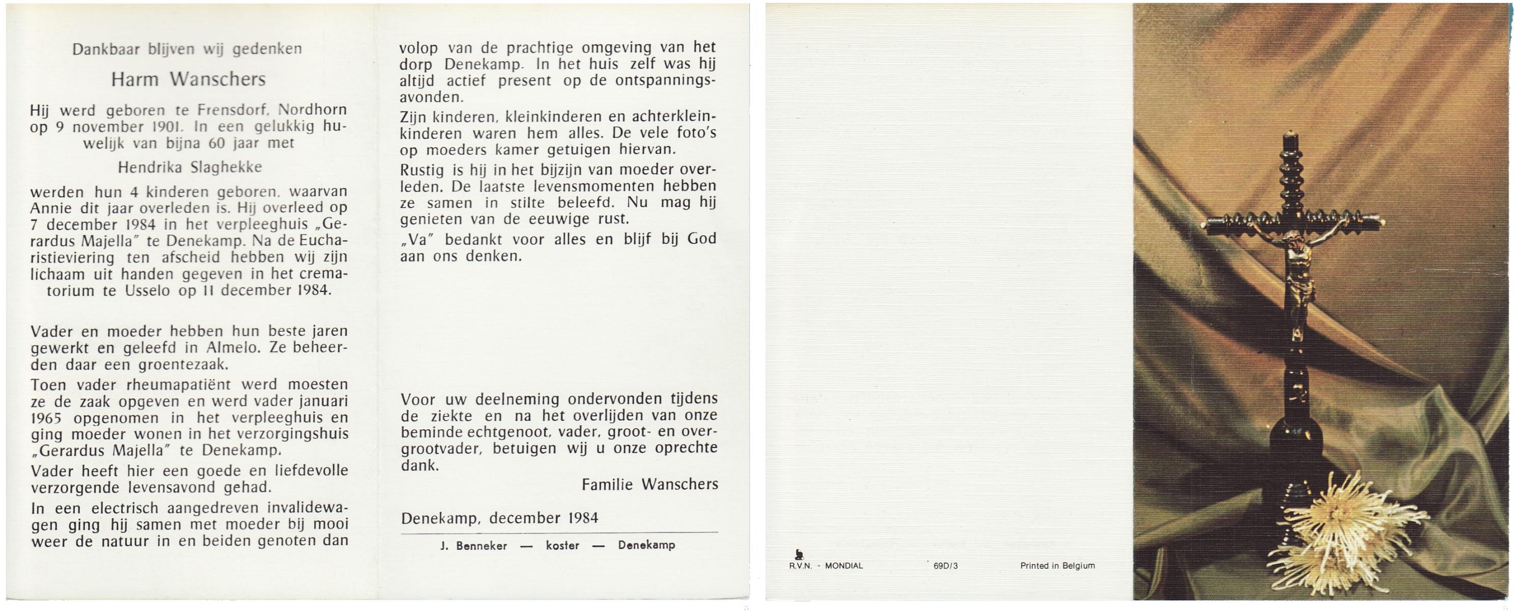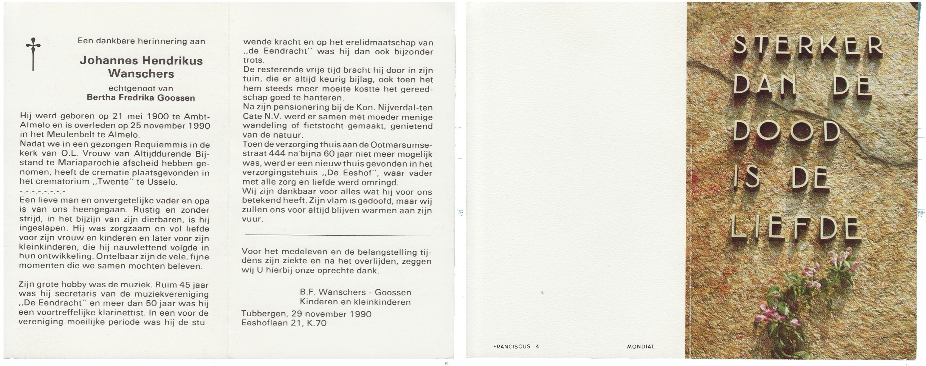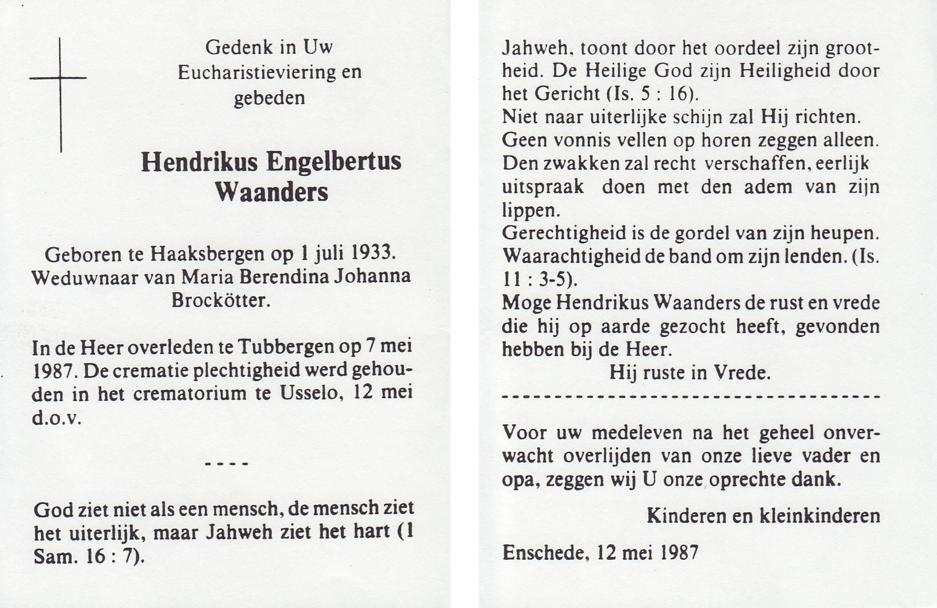WAANDERS, Hendrikus Engelbertus, geboren op 1-7-1933 te Haaksbergen, overleden op 7-5-1987 te Tubbergen op 53-jarige leeftijd, gecremeerd op 12-5-1987 te Usselo.