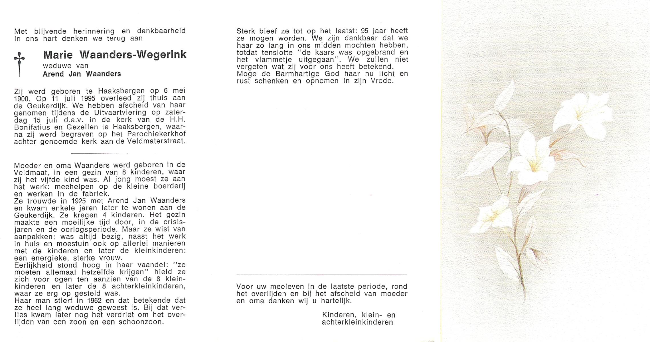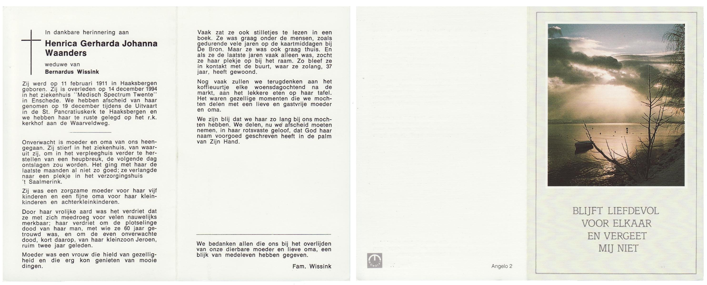 WAANDERS, Henrica Gerharda Johanna, geboren op 11-2-1911 te Haaksbergen, overleden op 14-12-1994 te Enschede op 83-jarige leeftijd, begraven op 19-12-1994 te Haaksbergen.
