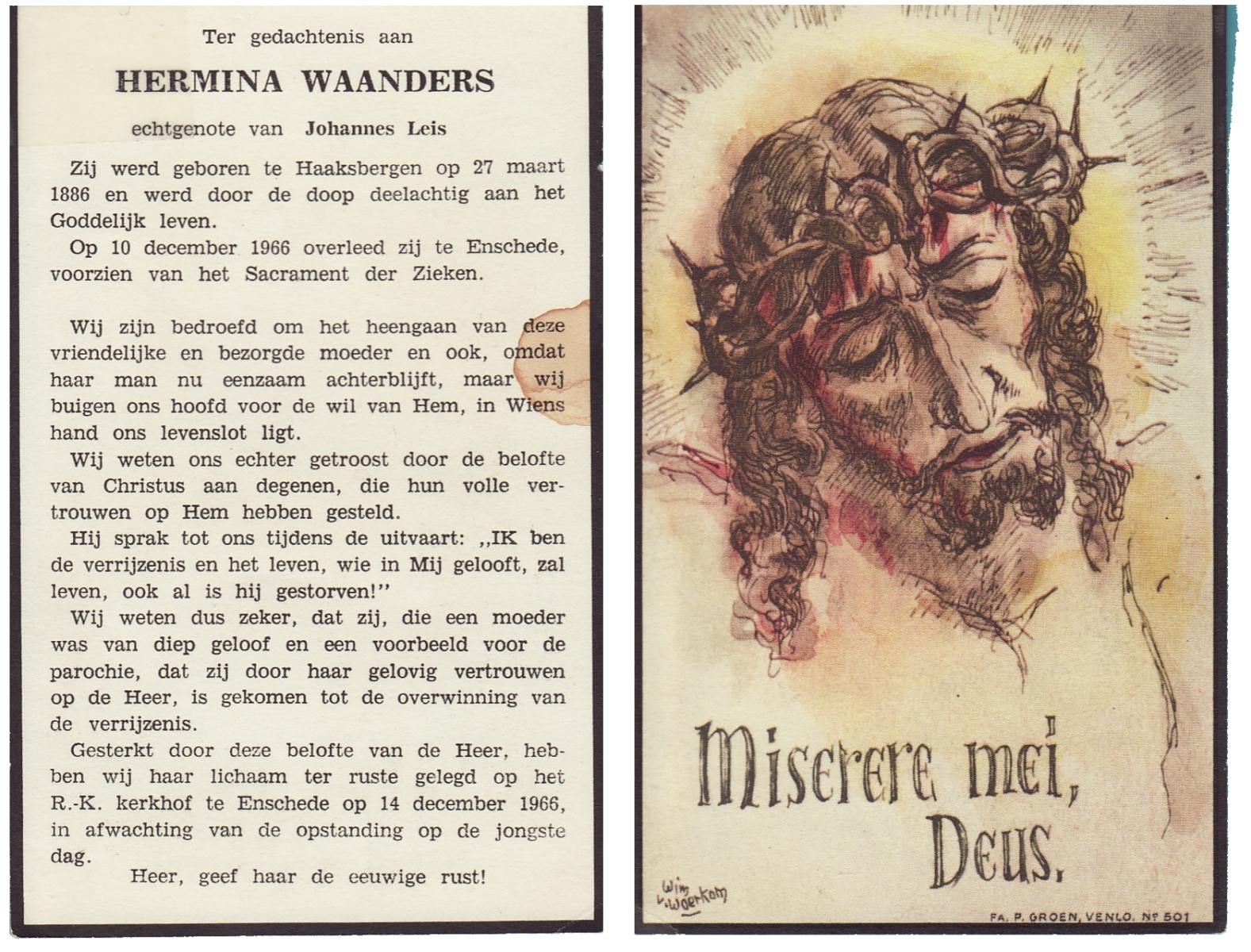 WAANDERS, Hermina, geboren op 27-03-1886 te Haaksbergen, overleden op 10-12-1966 te Enschede op 80-jarige leeftijd, begraven op 14-12-1966 te Enschede.