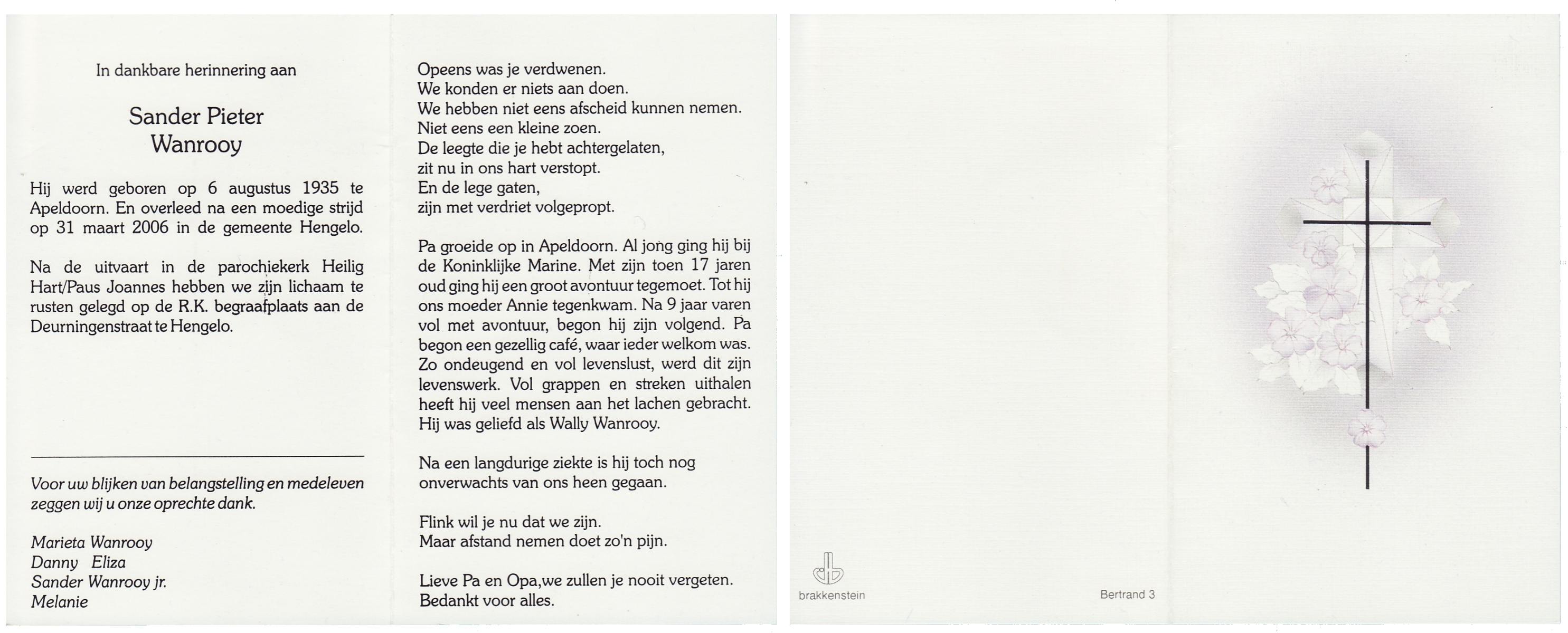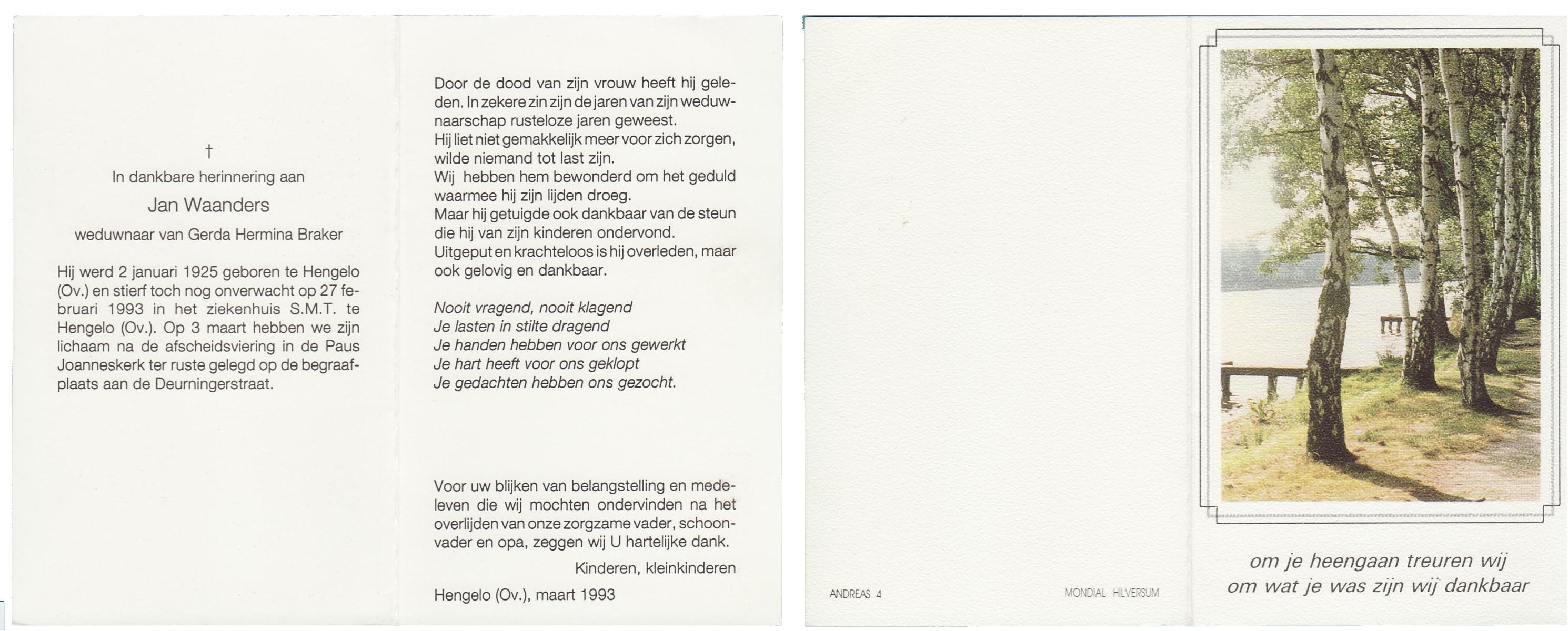 WAANDERS, Jan, geboren op 2-1-1925 te Hengelo (O), overleden op 27-2-1993 te Enschede op 68-jarige leeftijd, begraven op 3-3-1993 te Hengelo (Ov.).