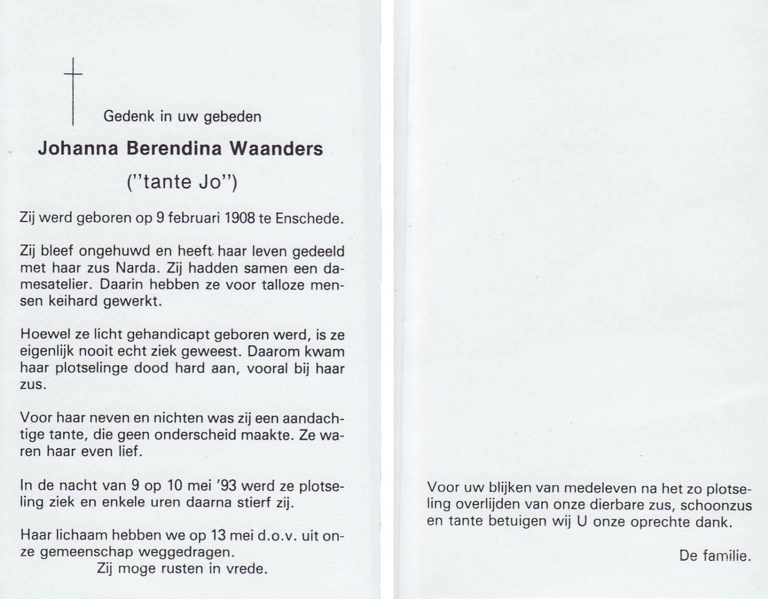 WAANDERS, Johanna Bernardina, geboren op 9-2-1908 te Enschede, overleden op 10-5-1993 op 85-jarige leeftijd, begraven op 13-5-1993.