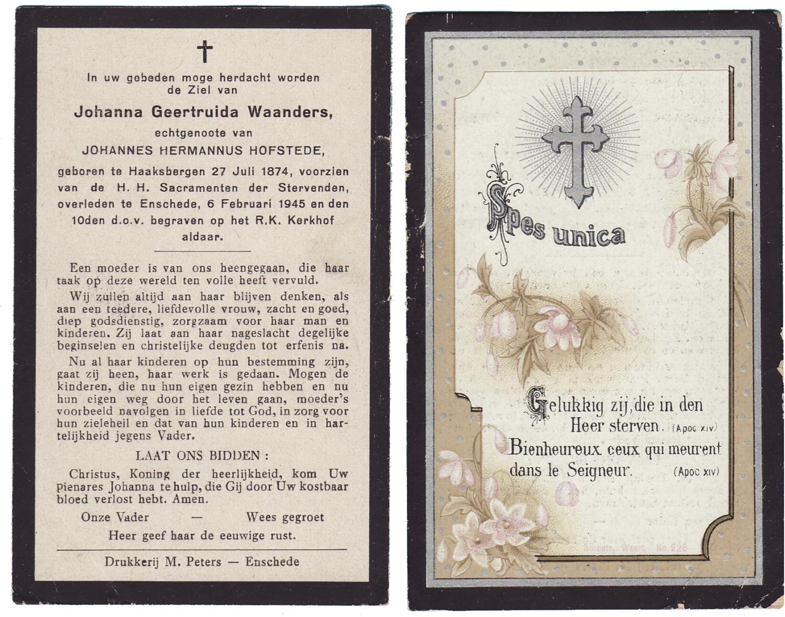 WAANDERS, Johanna Geertruida, geboren op 27-07-1874 te Haaksbergen, overleden op 6-2-1945 te Enschede op 70-jarige leeftijd, begraven op 10-2-1945 te Enschede.
