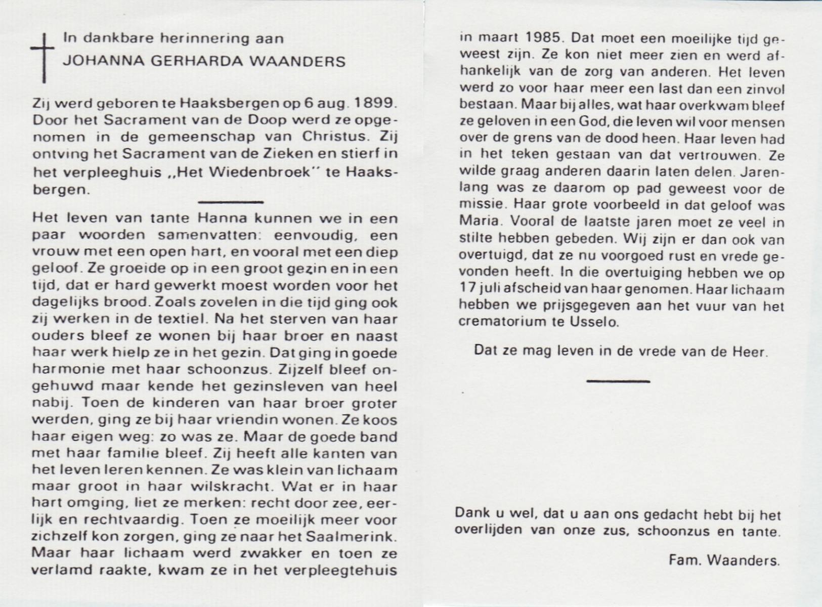 WAANDERS, Johanna Gerharda, geboren op 06-08-1899 te Haaksbergen, overleden te Haaksbergen, gecremeerd te Usselo.