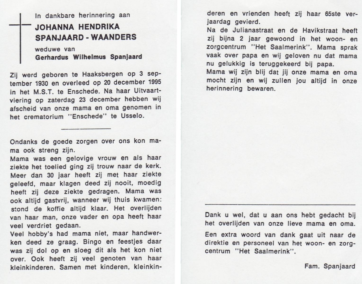 WAANDERS, Johanna Hendrika, geboren op 3-9-1930 te Haaksbergen, overleden op 20-12-1995 te Enschede op 65-jarige leeftijd, gecremeerd op 23-12-1995 te Usselo.