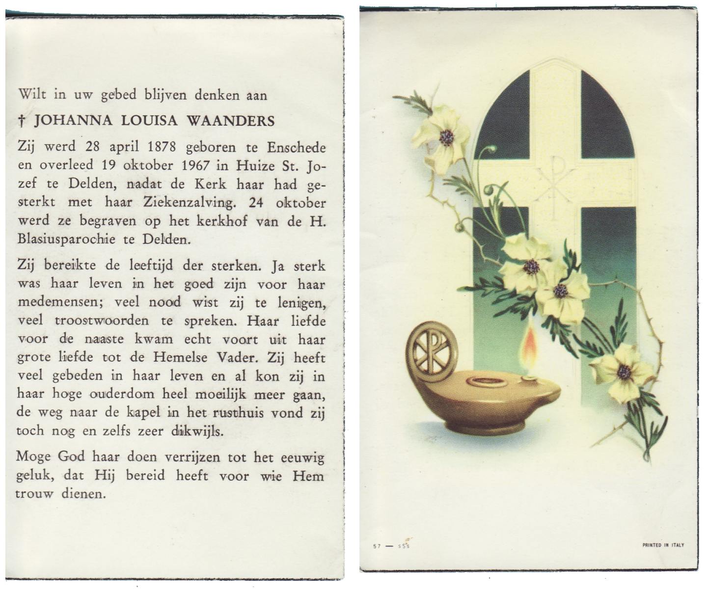 WAANDERS, Johanna Louisa, geboren op 28-04-1878 te Enschede, overleden op 19-10-1967 te Delden op 89-jarige leeftijd, begraven op 24-10-1967 te Delden.