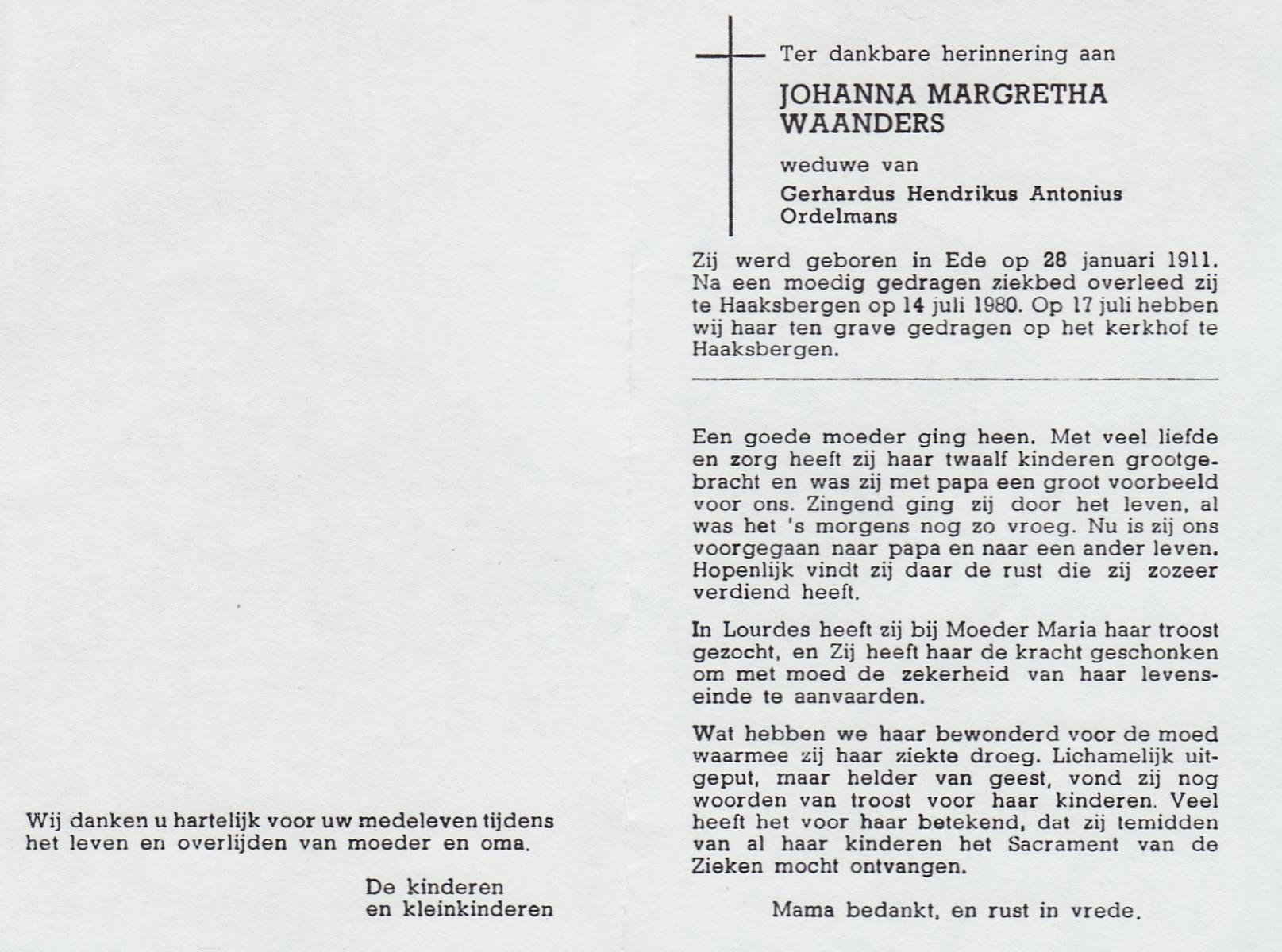 WAANDERS, Johanna Margretha, geboren op 28-1-1911 te Ede, overleden op 14-7-1980 te Haaksbergen op 69-jarige leeftijd, begraven op 17-7-1980 te Haaksbergen.