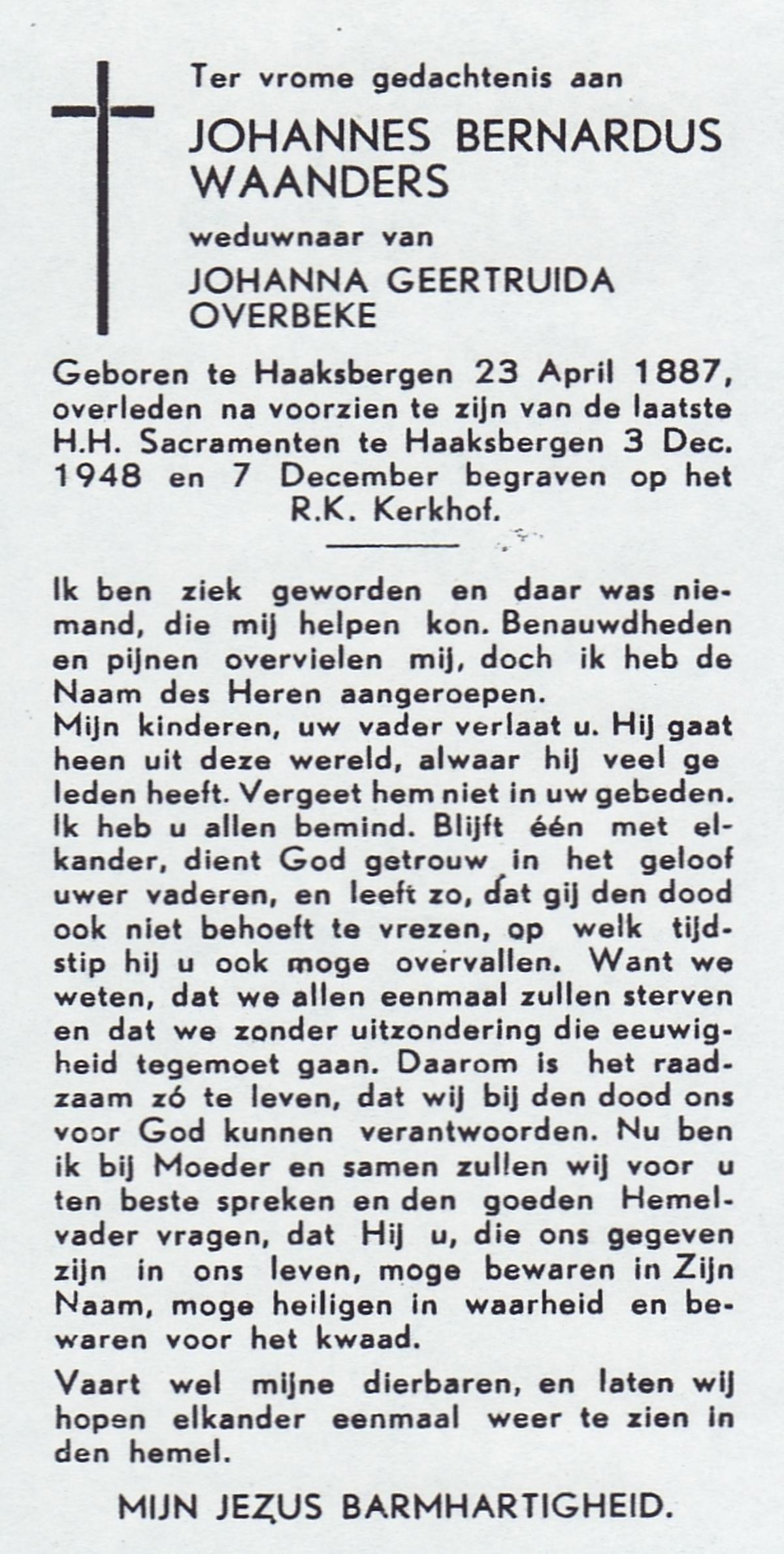 WAANDERS, Johannes Bernardus, geboren op 23-04-1887 te Haaksbergen, overleden op 3-12-1948 te Haaksbergen op 61-jarige leeftijd, begraven op 7-12-1948 te Haaksbergen.
