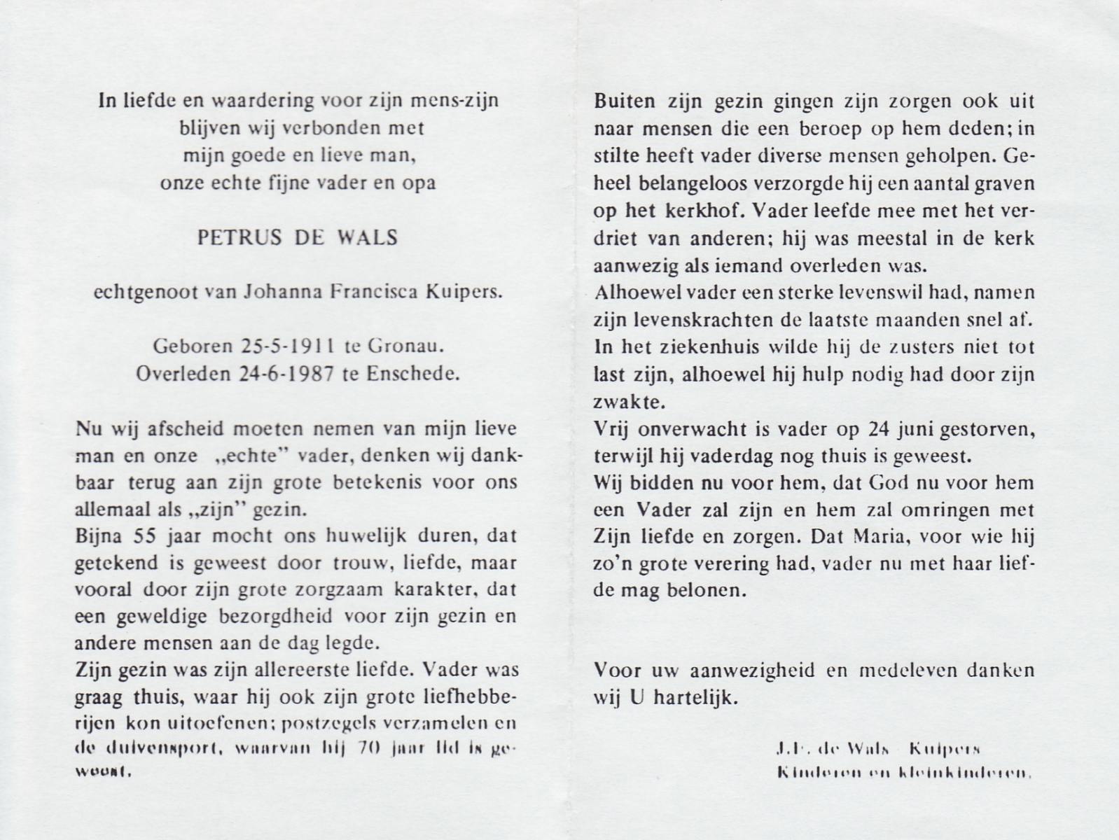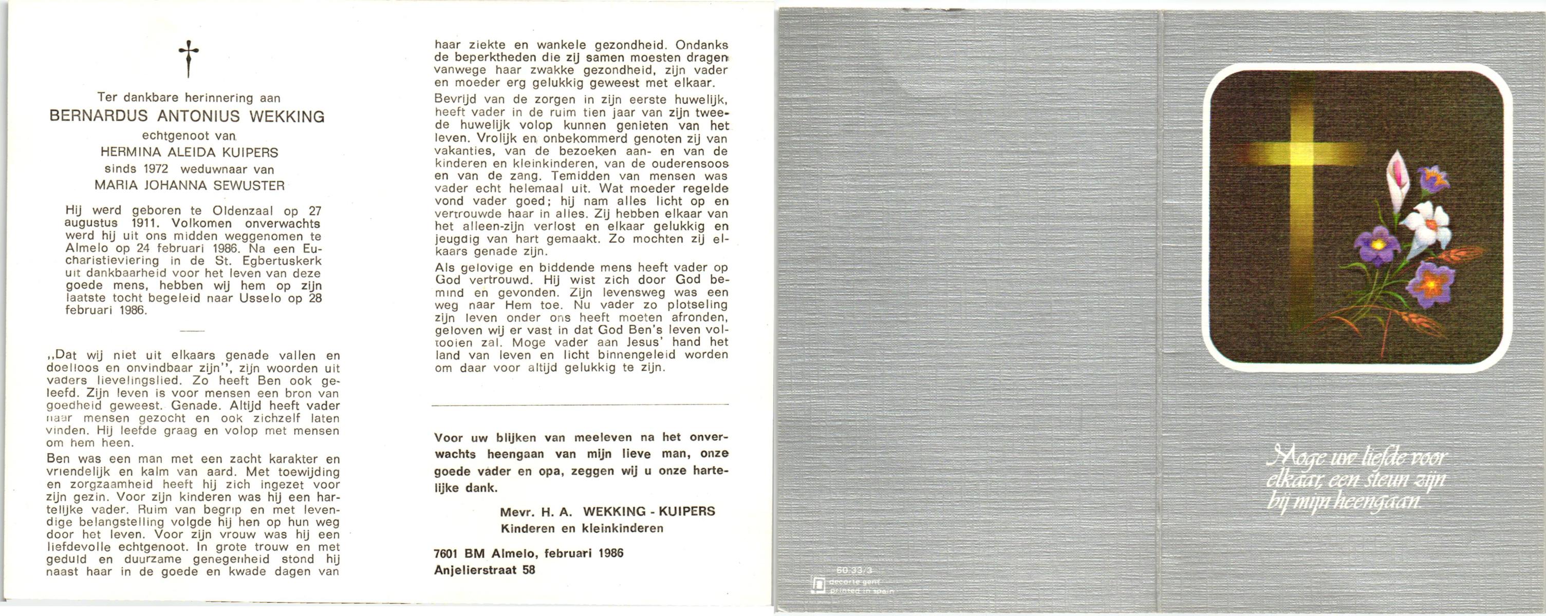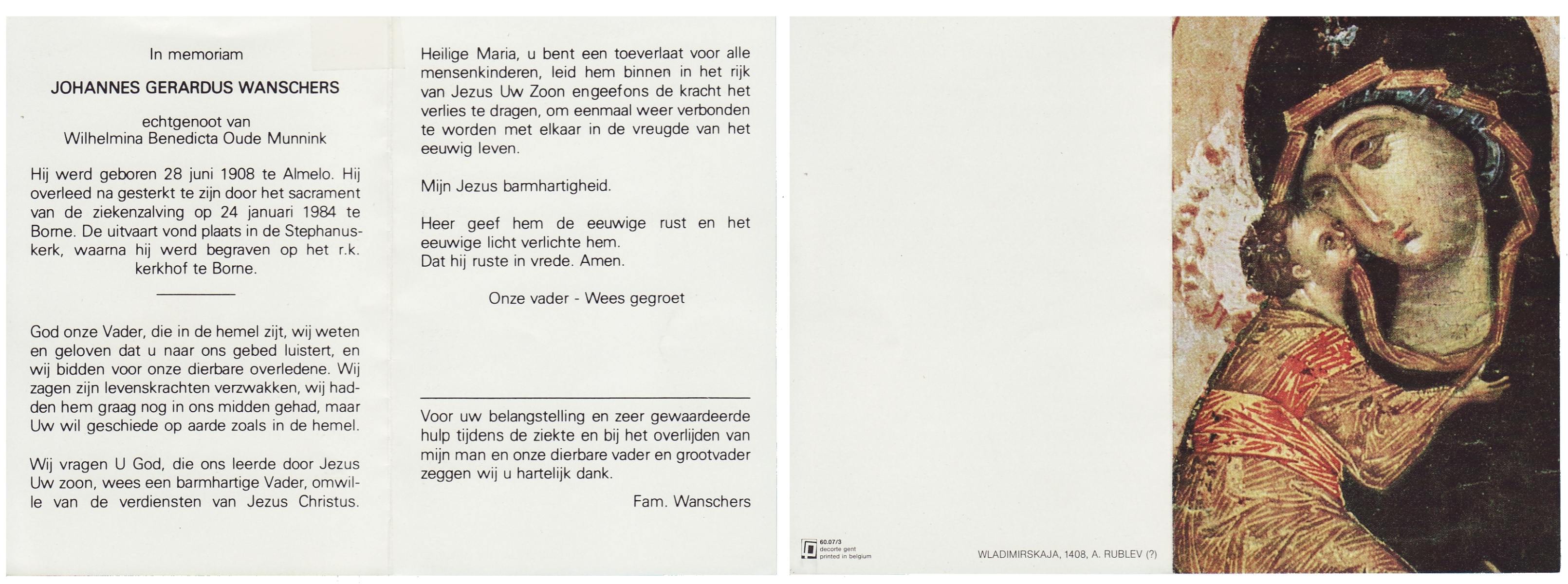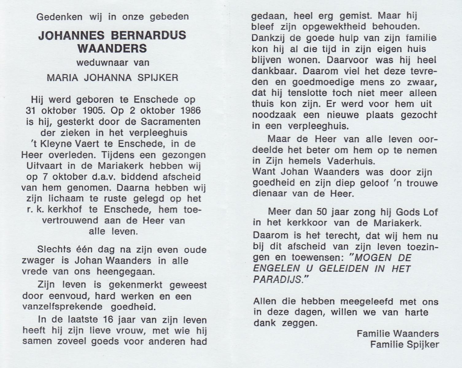 WAANDERS, Johannes Bernardus, geboren op 31-10-1905 te Enschede, overleden op 2-10-1986 te Enschede op 80-jarige leeftijd, begraven op 7-10-1986 te Enschede.
